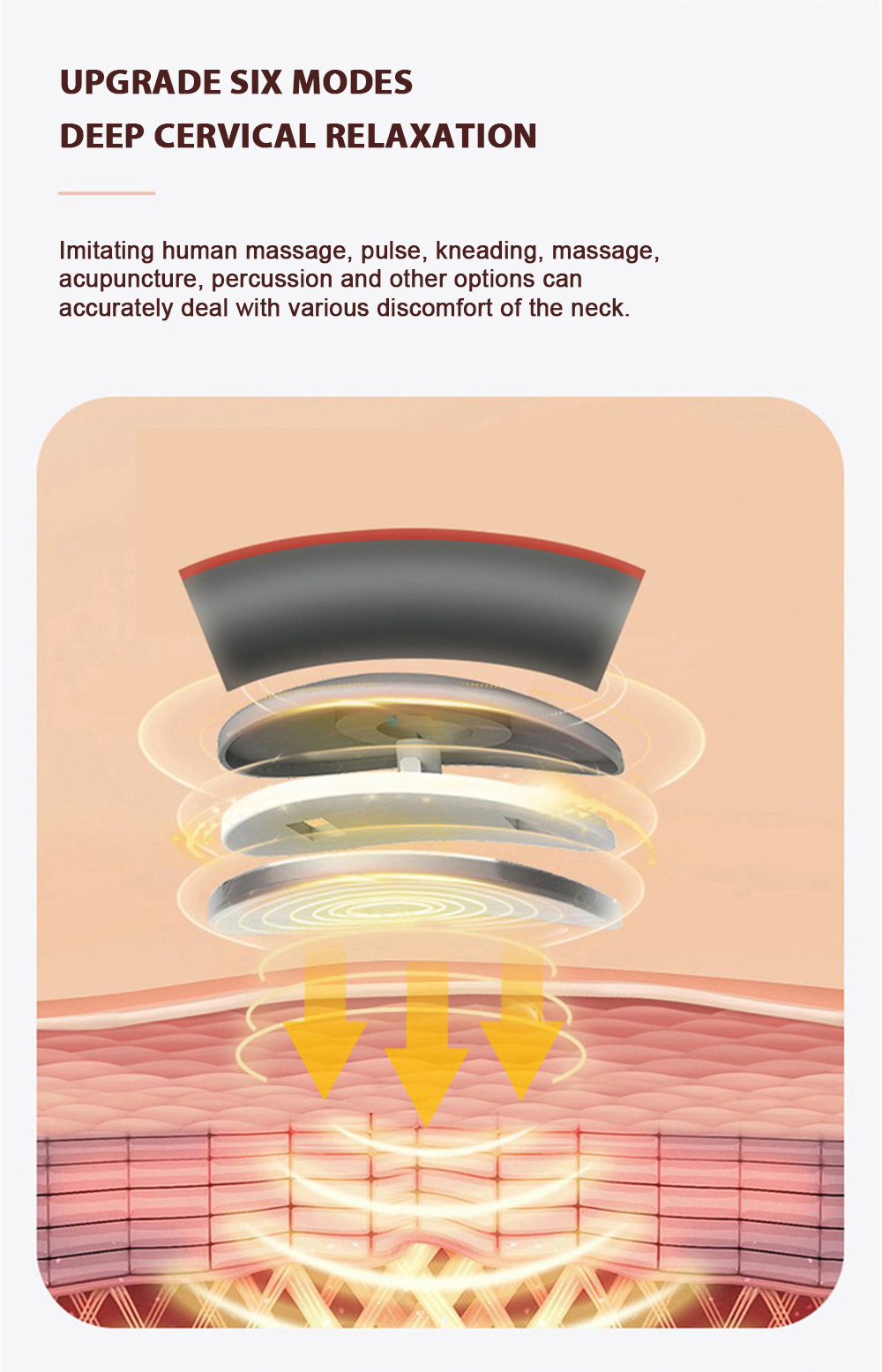 【4D Shape】4 massage heads arranged scientifically, precisely covering multiple segments of cervical spines. C-shape adjustable massage tool enables more personal use.