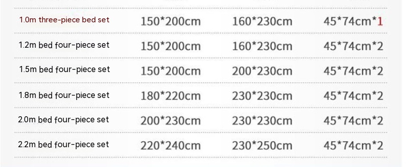 Specifications: 150 x200 [single duvet cover], 180 x220 [single duvet cover], 200 x230 [single duvet cover], 220 x240 [single duvet cover], 150x200 quilt cover 2 pillowcase [no bed sheet]], 180x220 quilt cover 2 pillowcase [no bed sheet], 220x240 quilt cover 2 pillowcase [no bed sheet], 1.2 m [three-piece set], 1.5 m [four-piece set], 1.8 m [four-piece set]], 2.0 m [four-piece set], 2.2 m [four-piece set], 200x230 quilt cover 2 pillowcase [no bed sheet]]