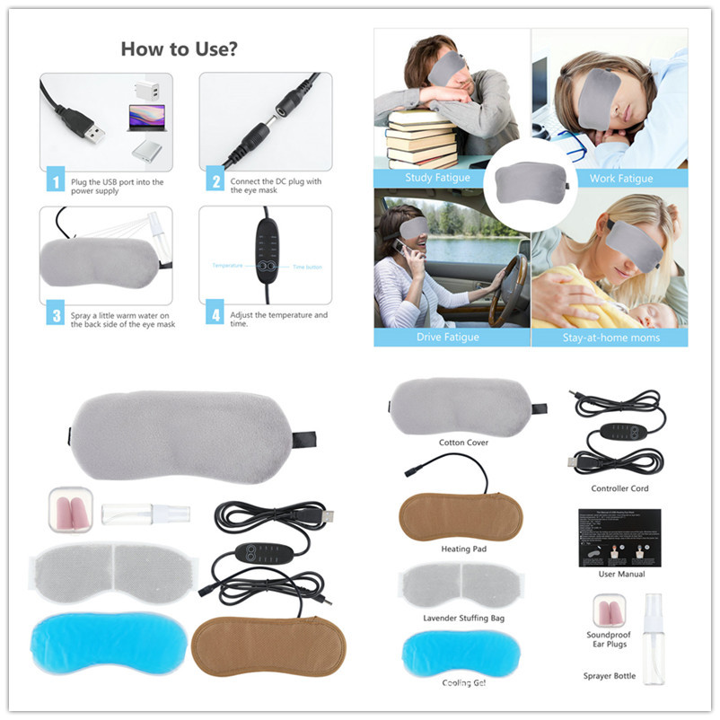 Eye mask*1, heating liner*1, borneol*1, temperature control line*1, lavender flower bag*1, spray bottle*1, earplugs*1 pair, instruction manual*1
