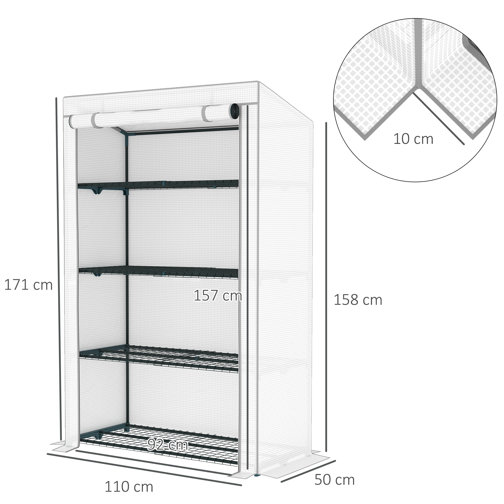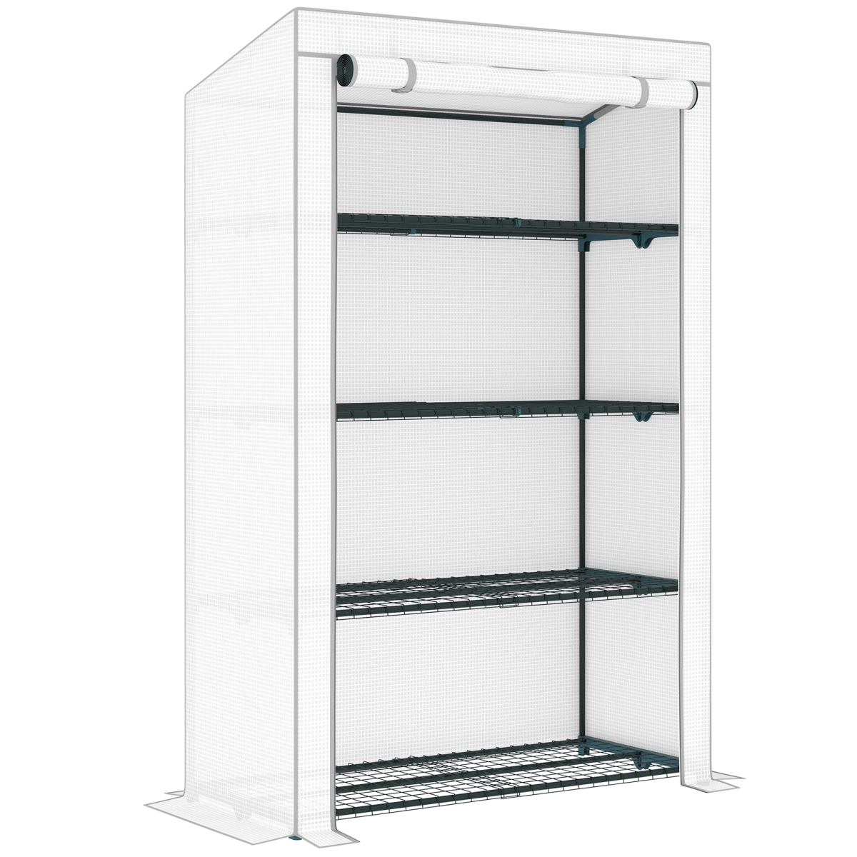 Grow greenery practically anywhere with this greenhouse. The four inner shelves offer plenty of space for plants, flower pots and seed trays; the 140g/m² plastic cover shields inside from outer weather. Complete with a zipped door, which rolls up and holds in place to allow in fresh air to promote healthy growth.
