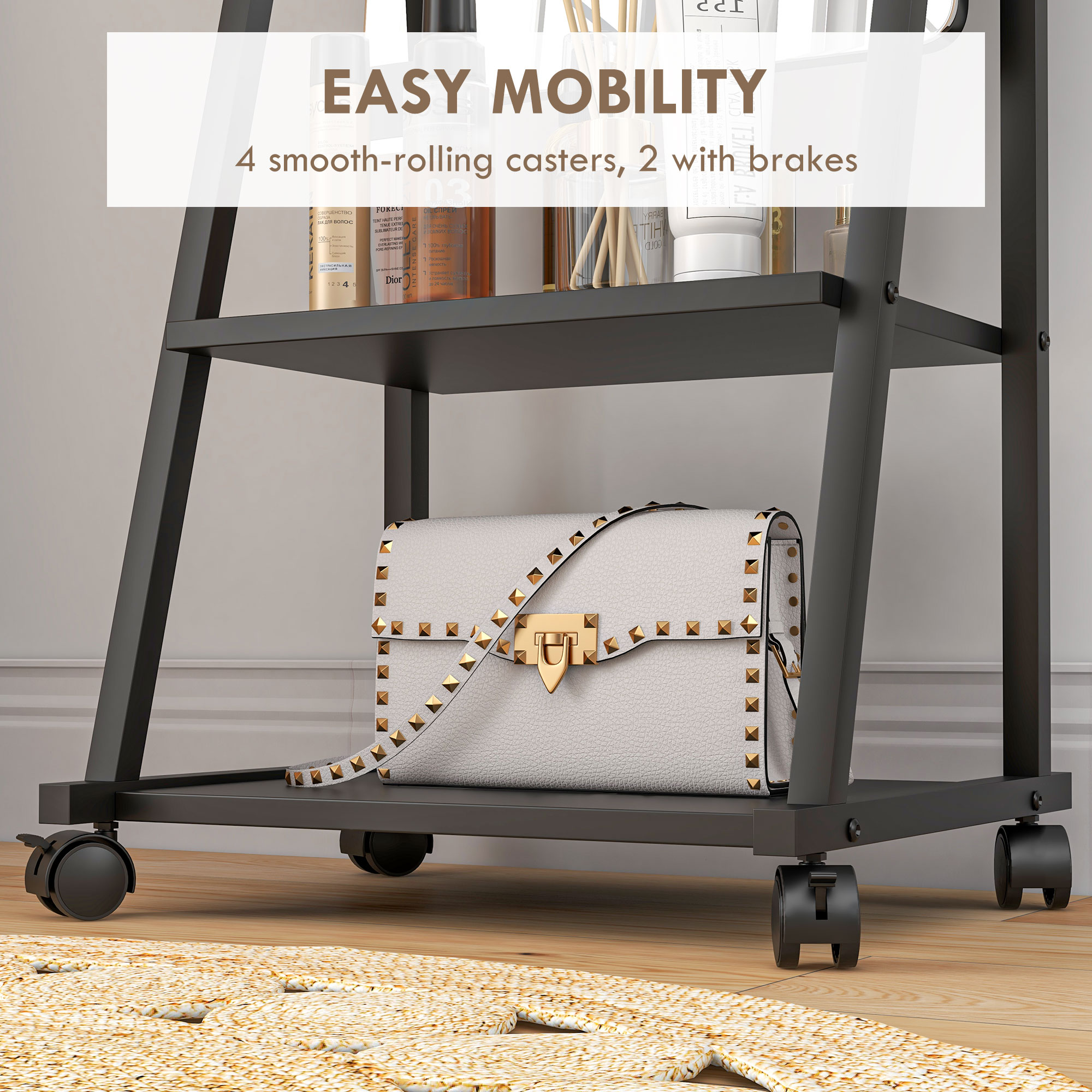 Walk out the door ready-to-go: use this freestanding mirror to ensure you are looking your best. The long length design means you can see yourself fully so you get your outfit in too. The mirror angle is adjustable to a 70°, 75°, 85° and 90° angle - select and secure to a position you want. A metal frame for a strong structure, complete with two handy bottom shelves.