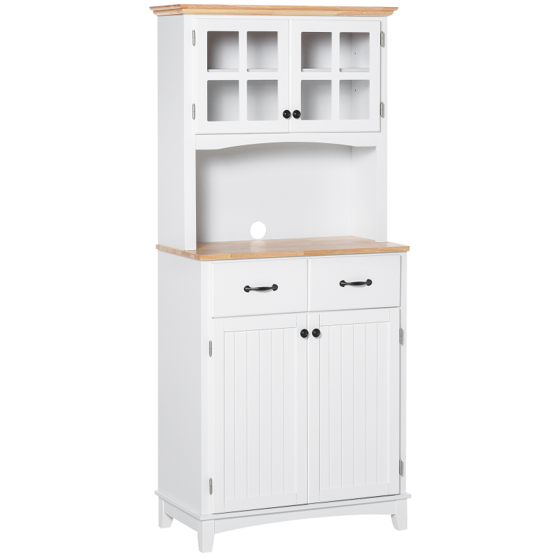 Organize your kitchenware and add more storage space with storage cabinets with doors and shelves. You can use the upper framed glass door cabinet to store plates or display your collections. And the lower cabinet for bigger items such as coffee machine, toaster and wines. Middle drawers can be used to put forks, napkins. And the rubber wood table top offers you a spacious area to place your microwave oven, coffee machine with cable management system.