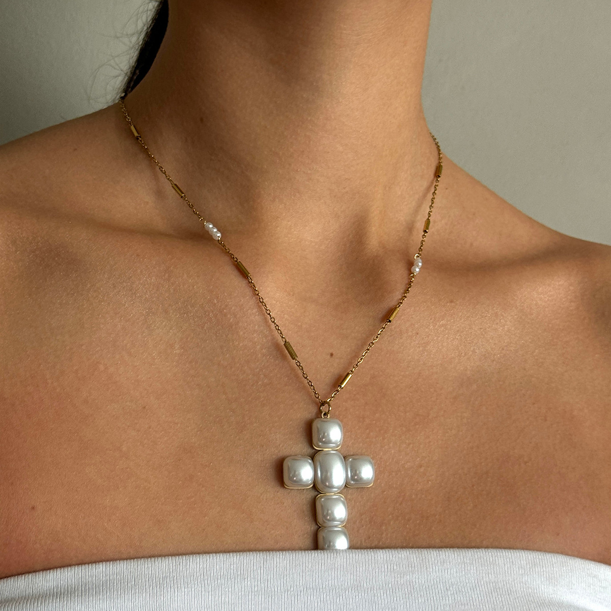 French Cross Pearl Pendant Necklace, Fresh And Simple Fashion Collarbone Chain Women's Stainless Steel Sweater Chain