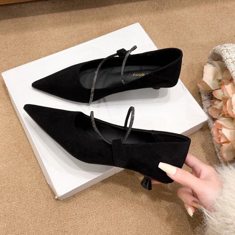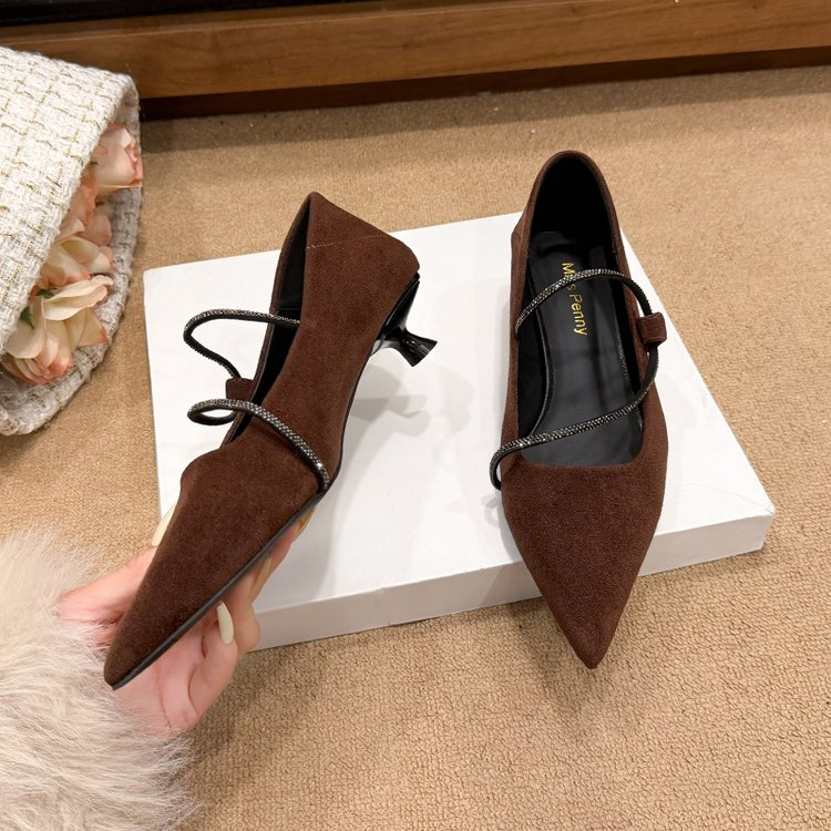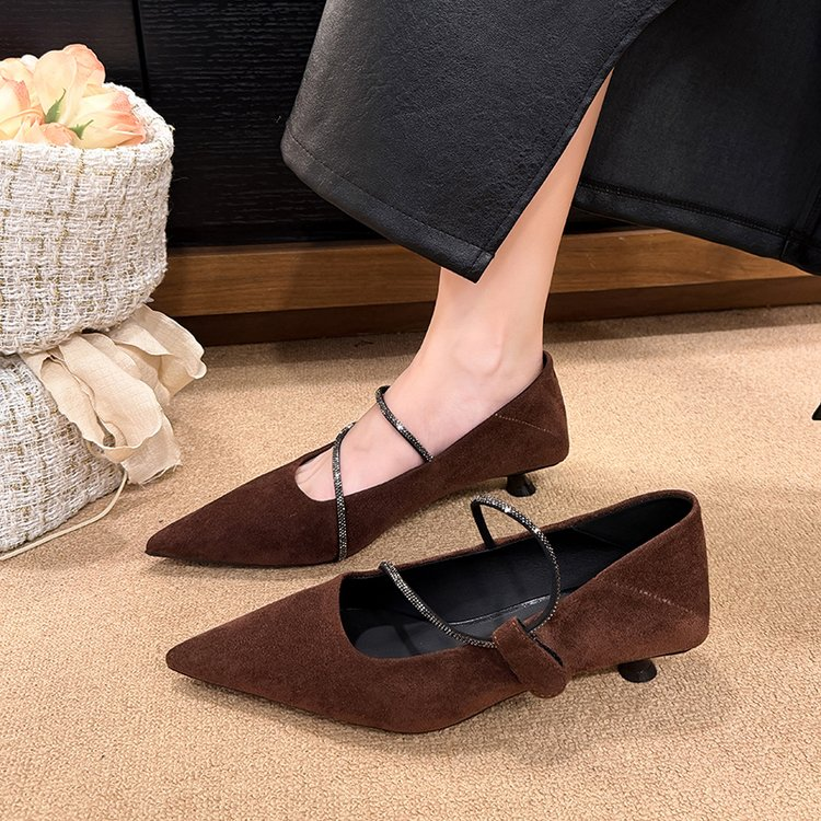 Heel Type: Stiletto heel for a subtle lift without sacrificing comfort.Toe Shape: Pointed toe for a slim, leg-lengthening aesthetic.Closure: Adjustable rhinestone strap with buckle for a secure fit.Color: Black, CoffeeHeel Height: Approx. 4-5 cm (discreet and comfortable for all-day wear)Sole: Non-slip rubber sole for stability and durability.