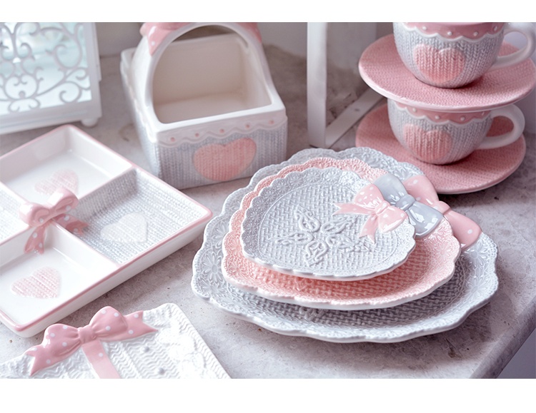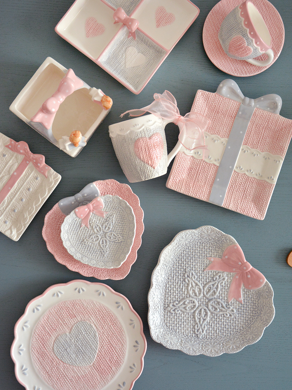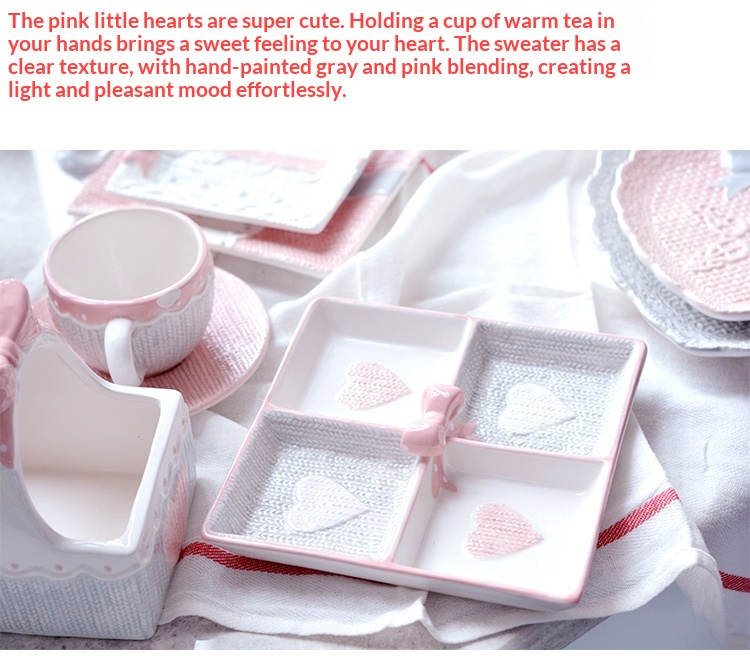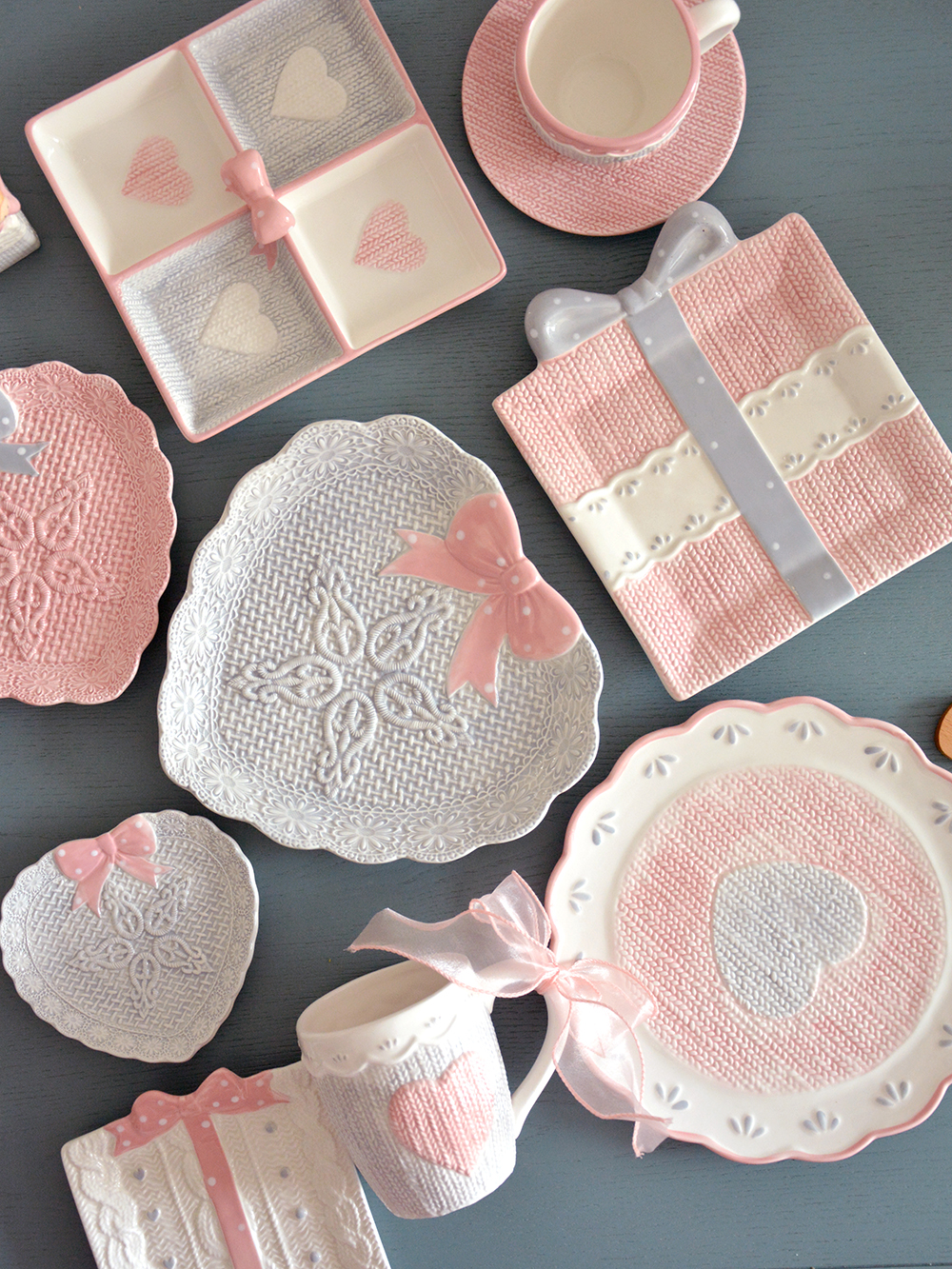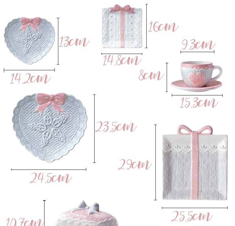 Colors: Small heart-shaped tray, medium heart-shaped tray, large heart-shaped tray, small gift box tray, medium gift box tray, small gray heart-shaped basket, multi-compartment tray, small pink heart-shaped basket; free shipping on any two items; hand sanitizer bottle; coffee cup and saucer; round tray; mug.