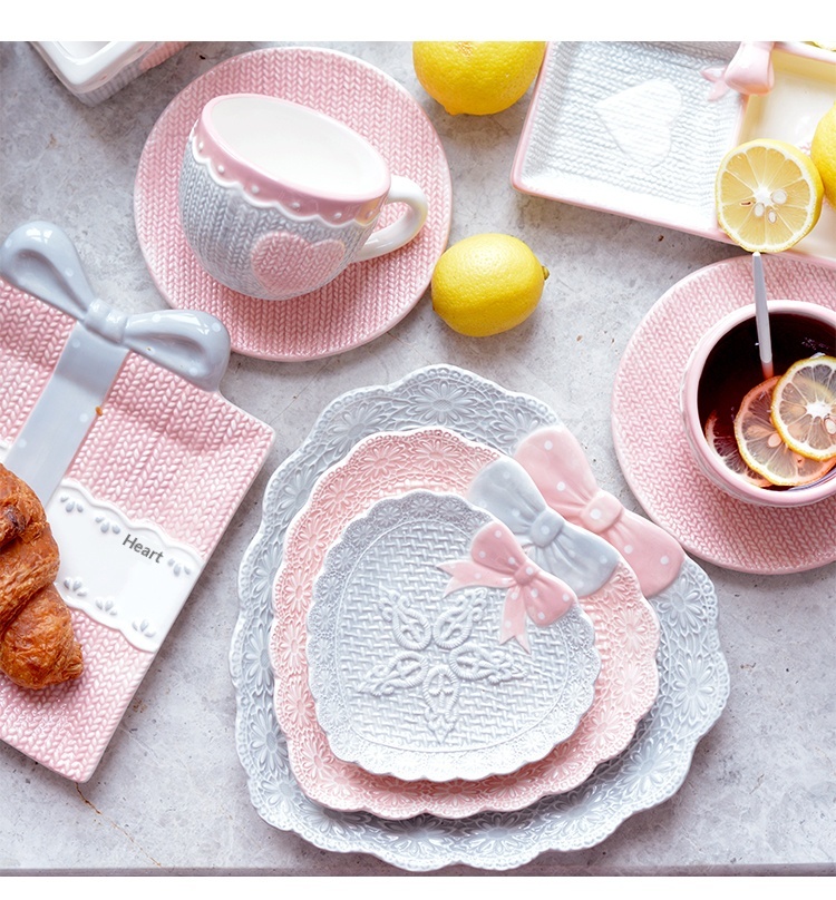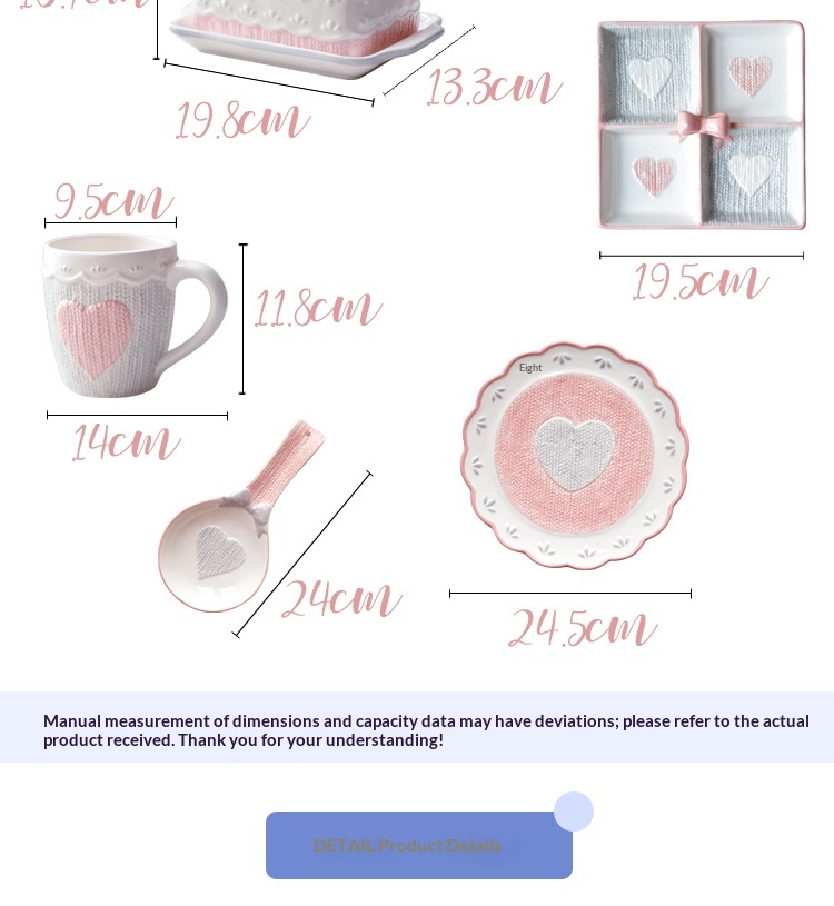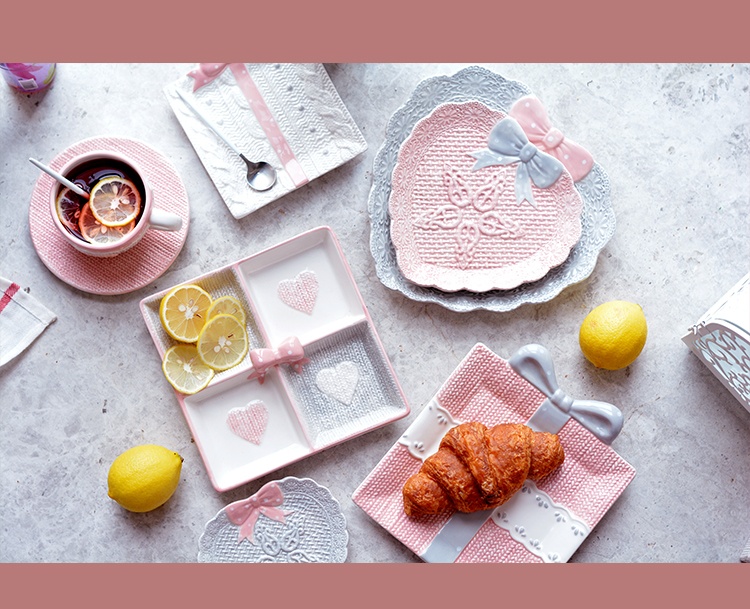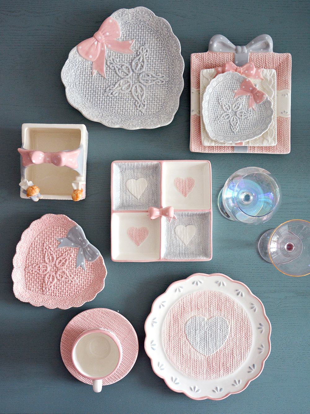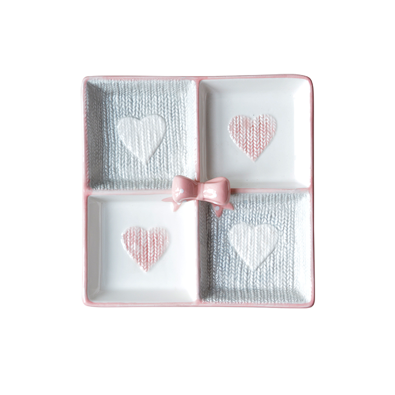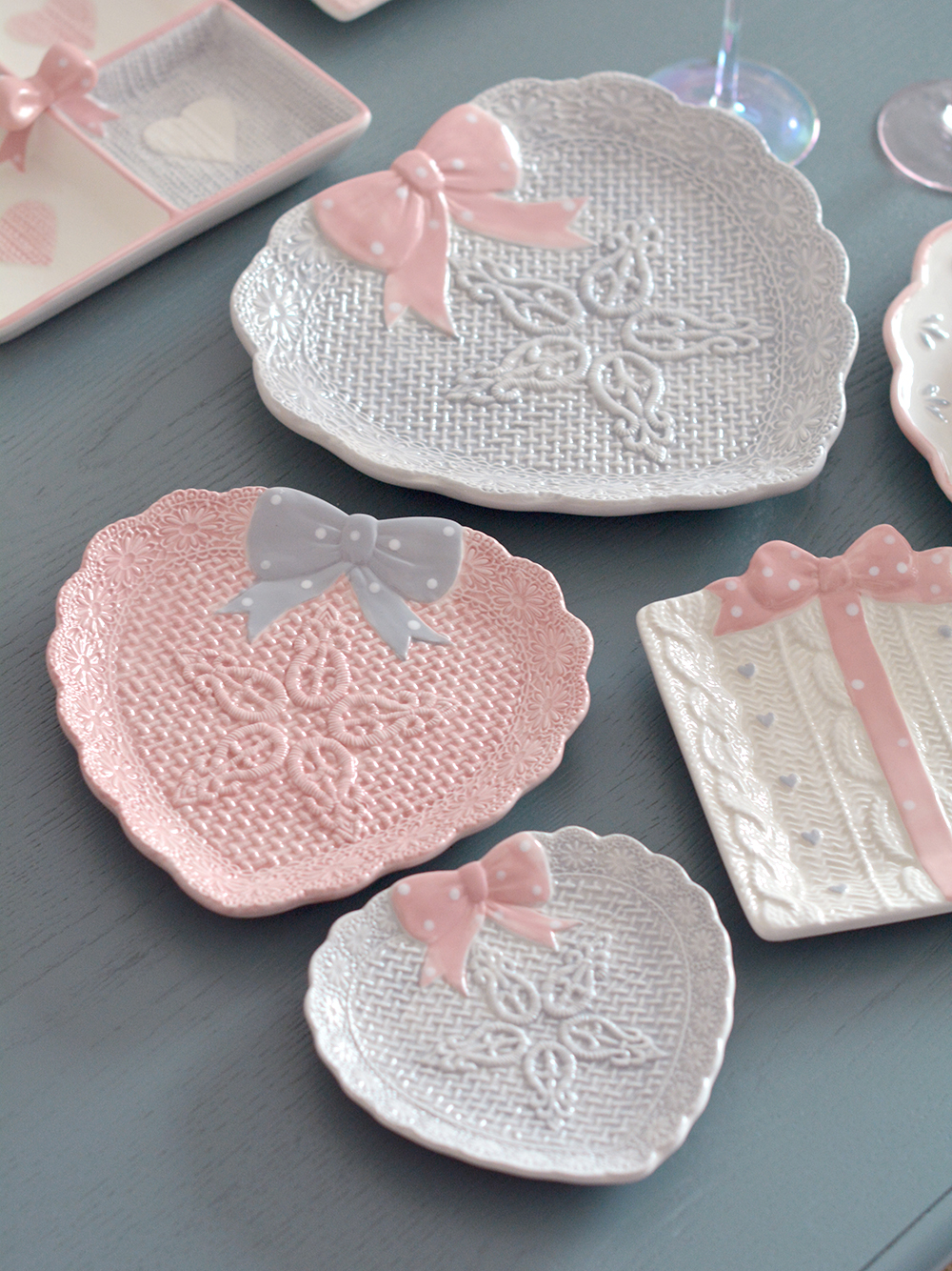 Colors: Small heart-shaped tray, medium heart-shaped tray, large heart-shaped tray, small gift box tray, medium gift box tray, small gray heart-shaped basket, multi-compartment tray, small pink heart-shaped basket; free shipping on any two items; hand sanitizer bottle; coffee cup and saucer; round tray; mug.