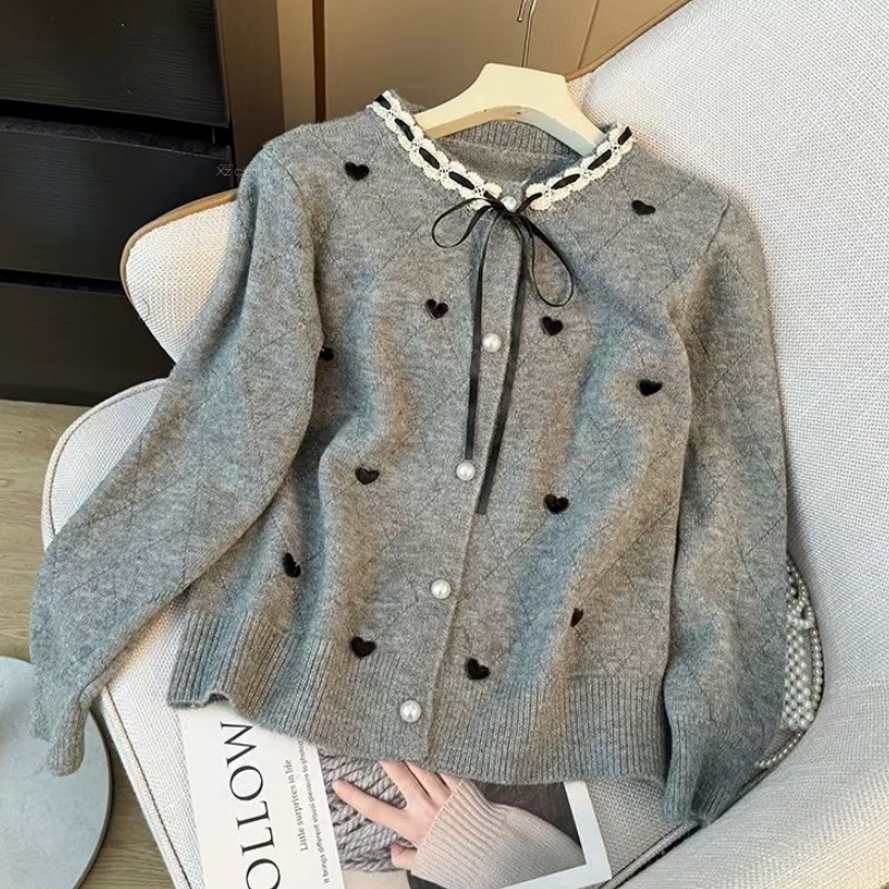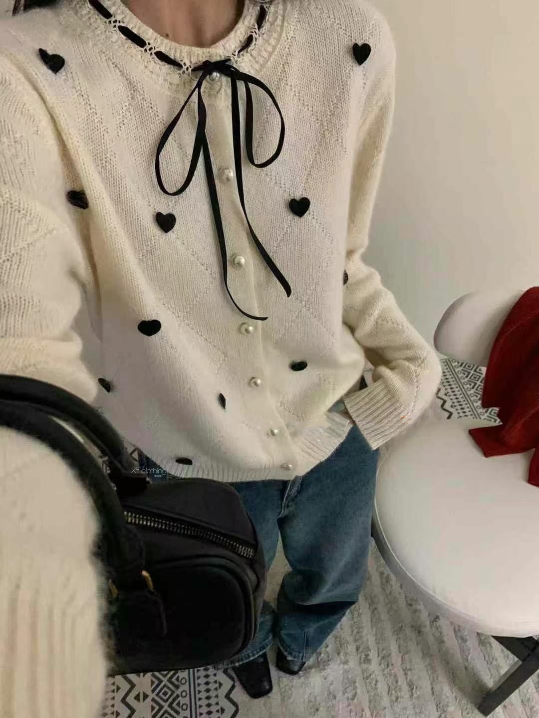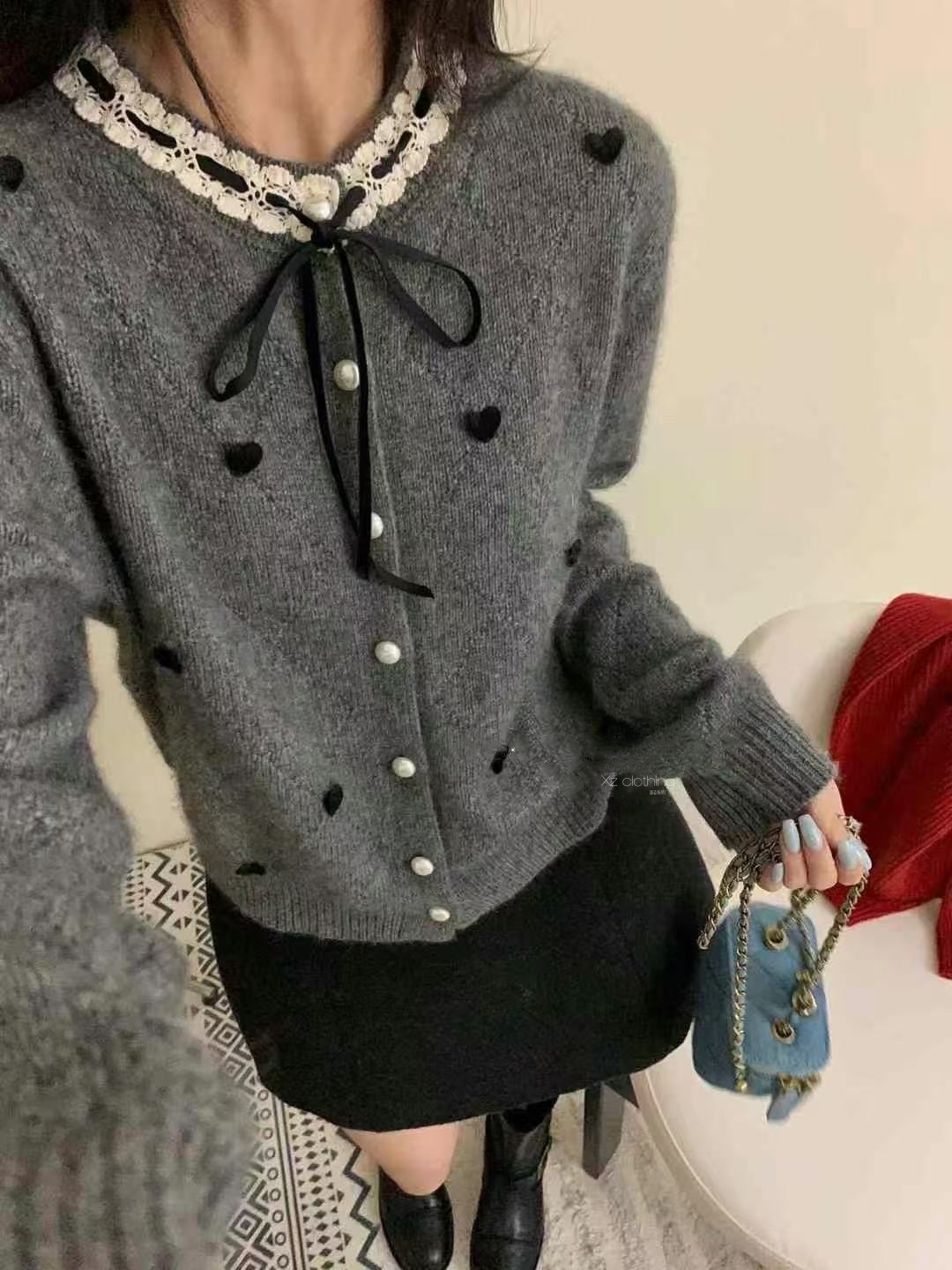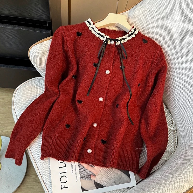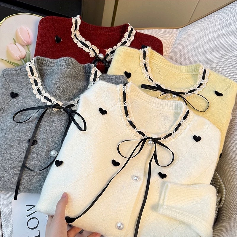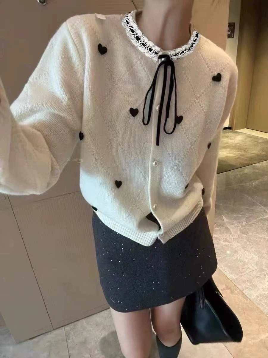 French High-end Lace Trim Age-reducing Love Bow Tie Sweater For Women