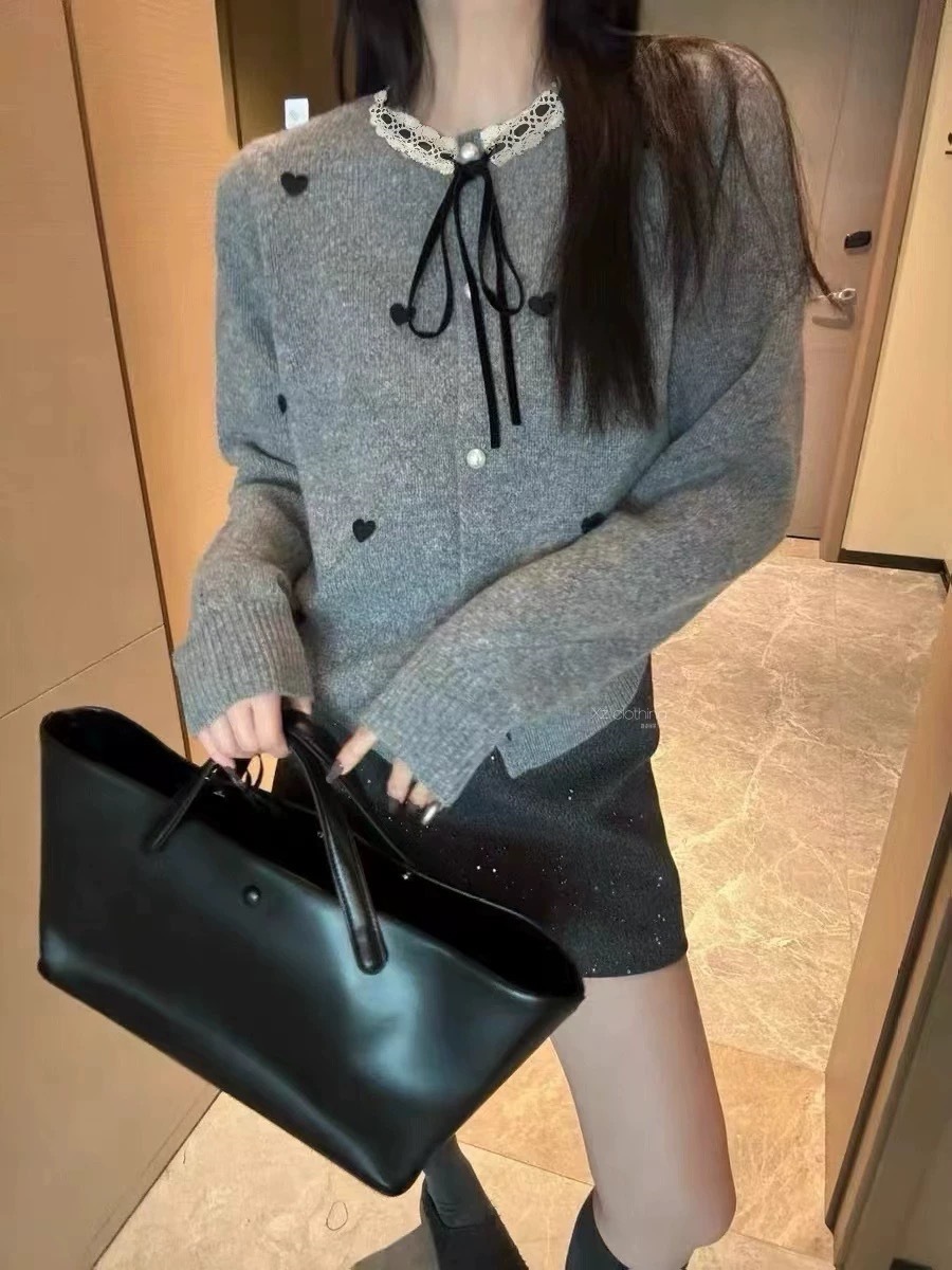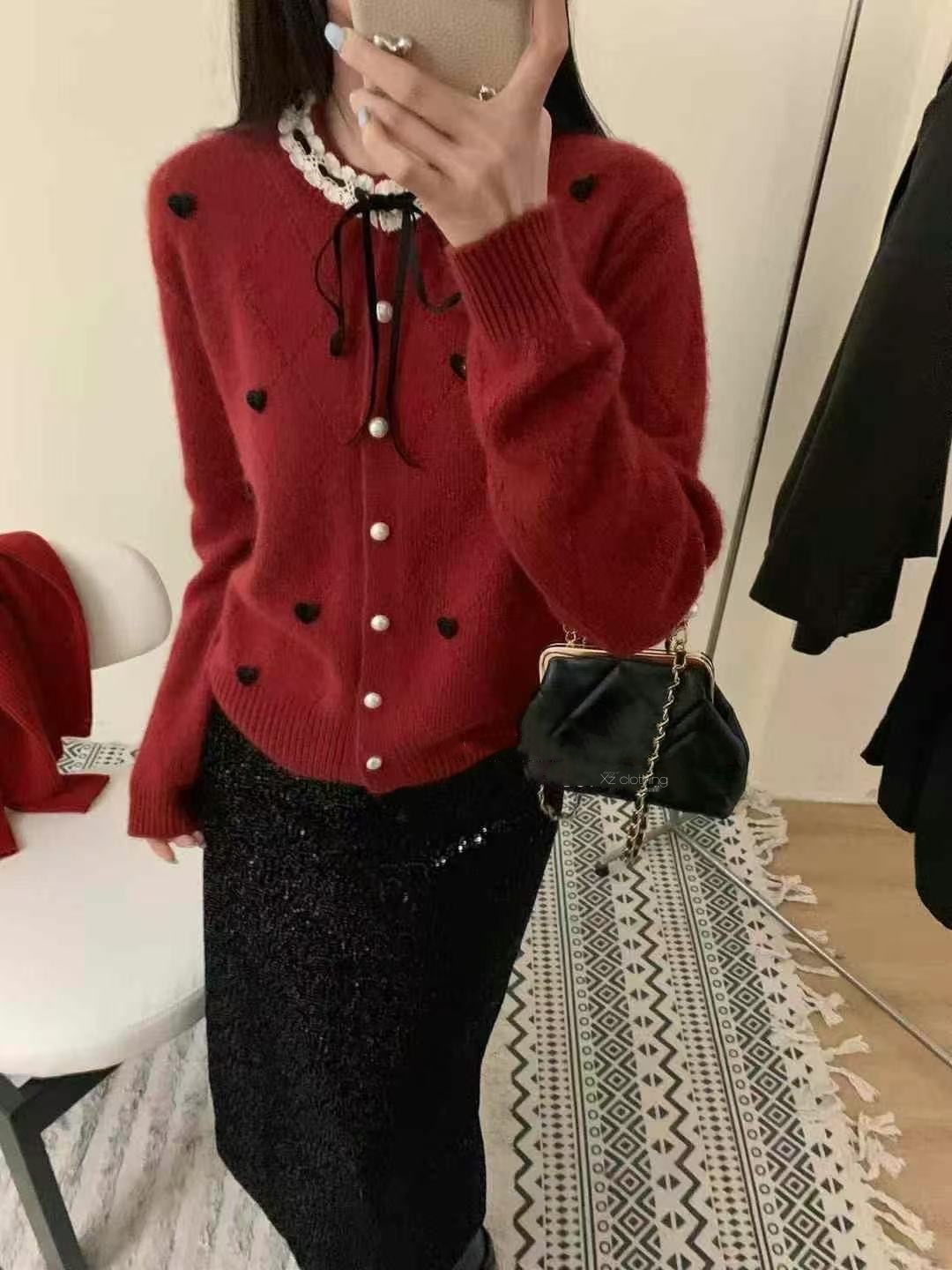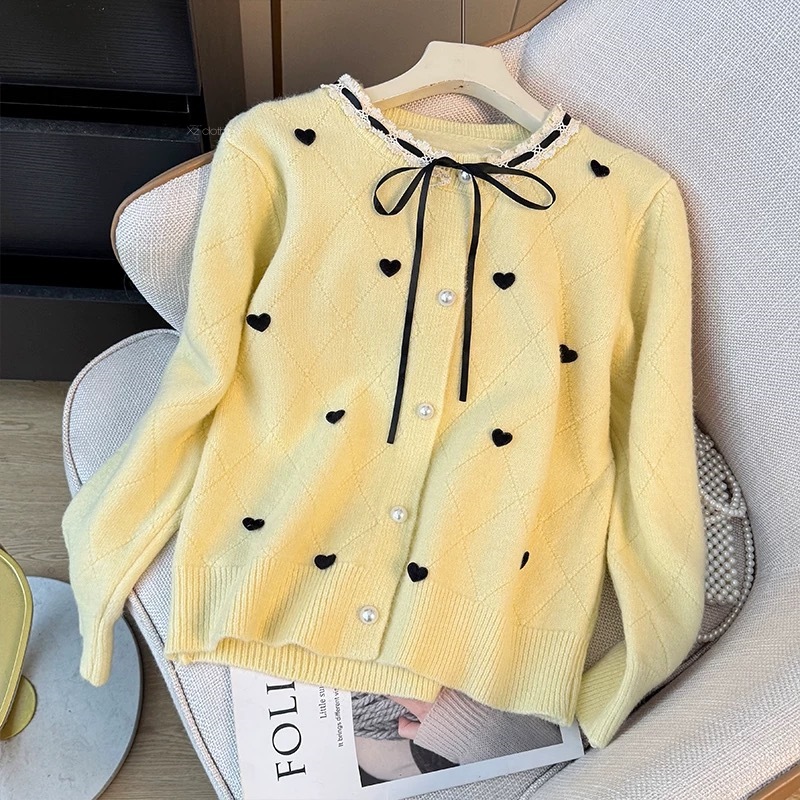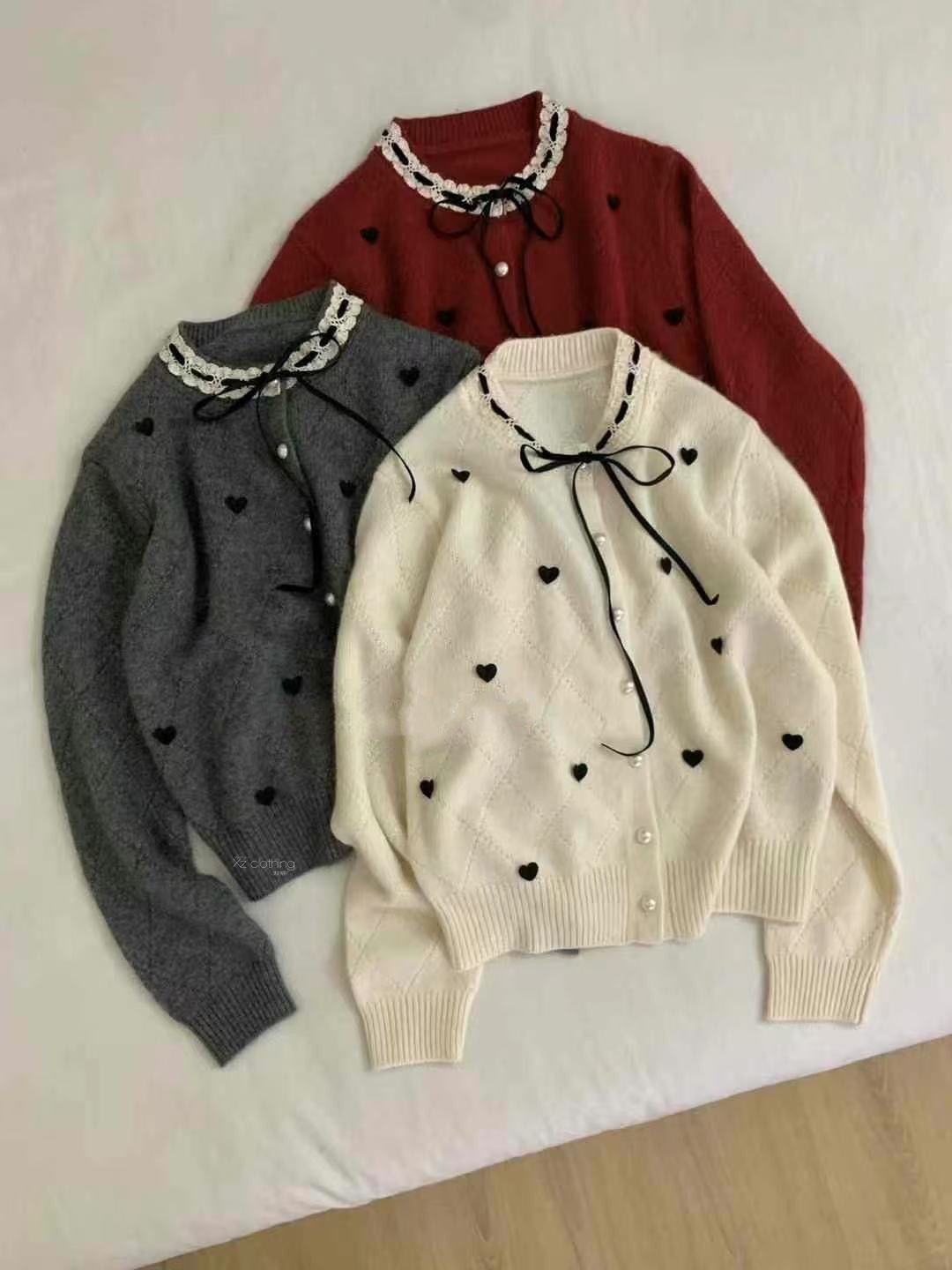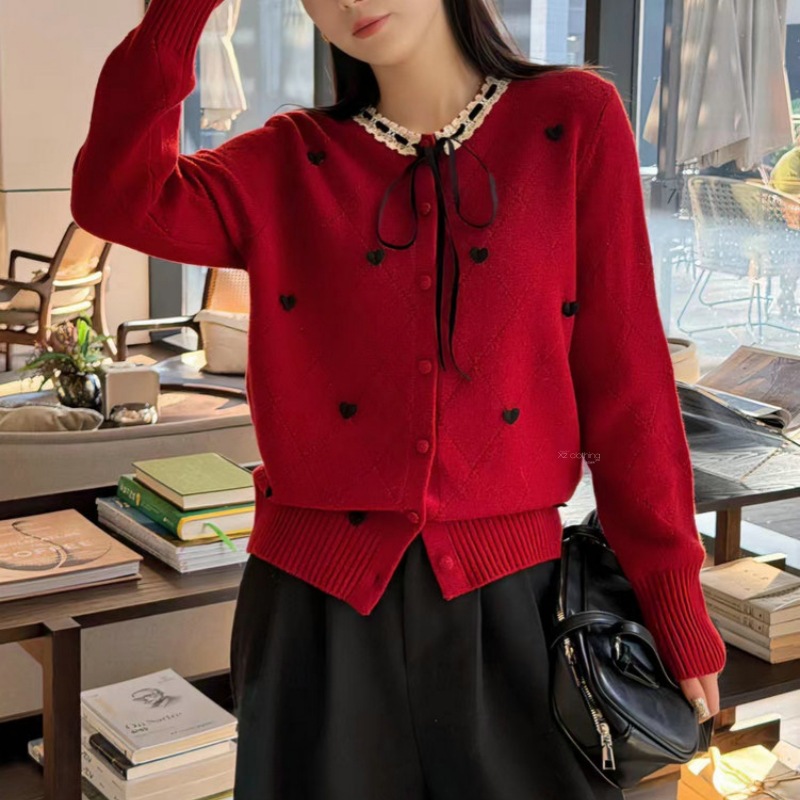 French High-end Lace Trim Age-reducing Love Bow Tie Sweater For Women