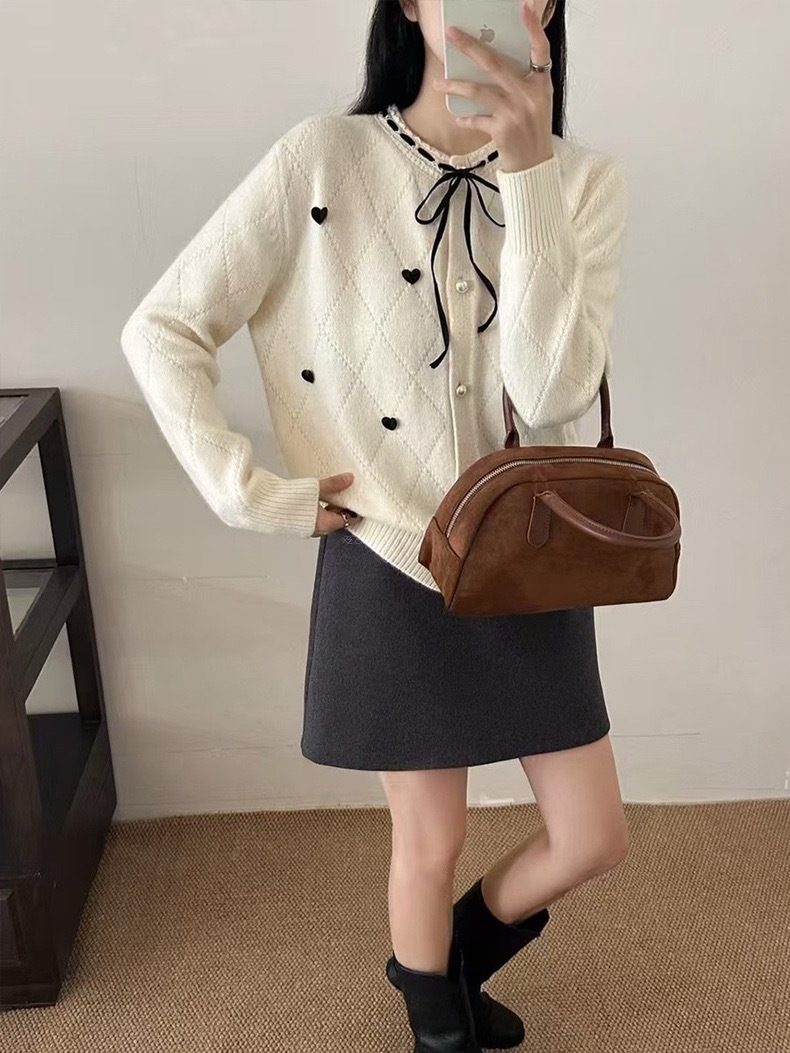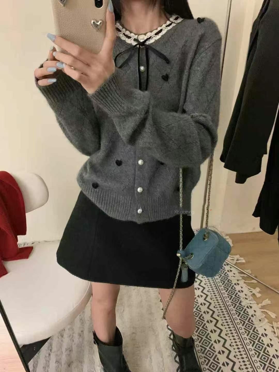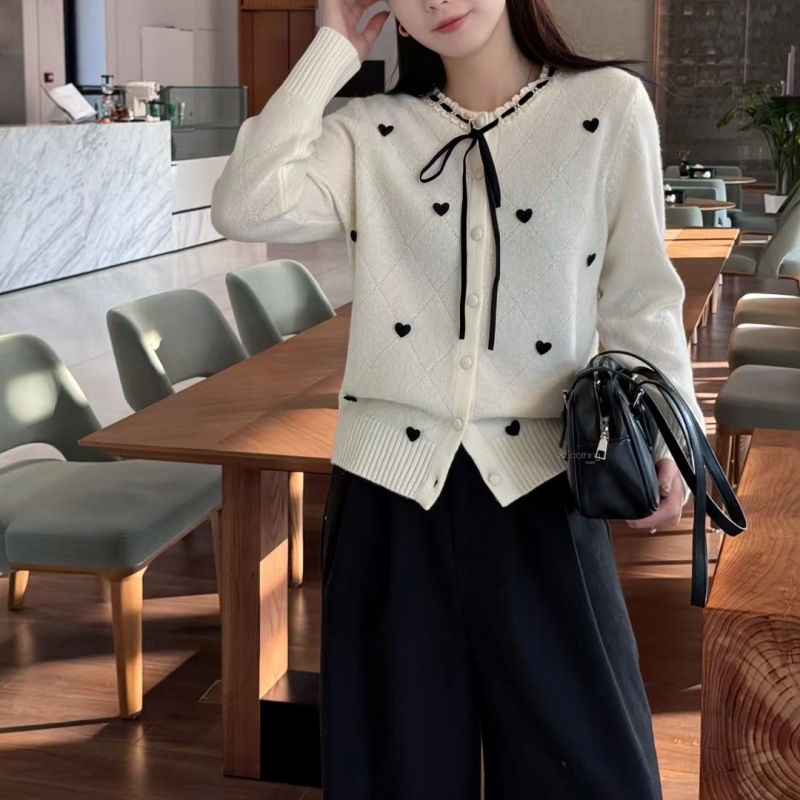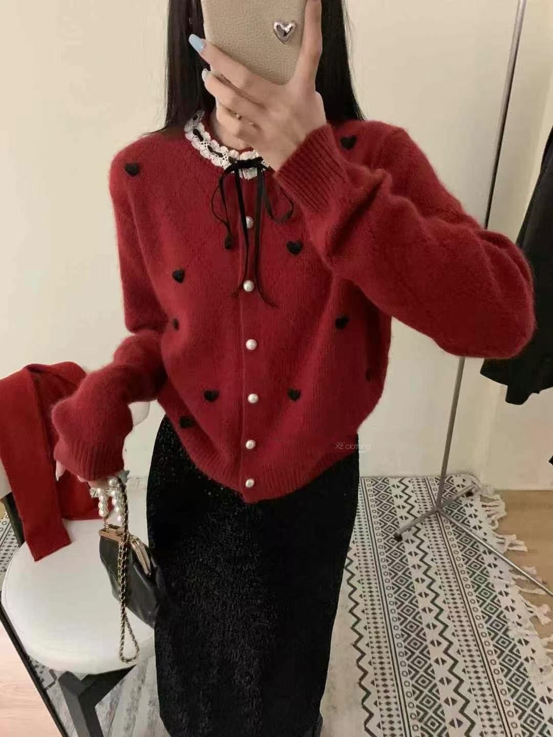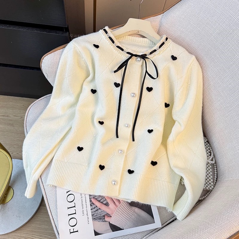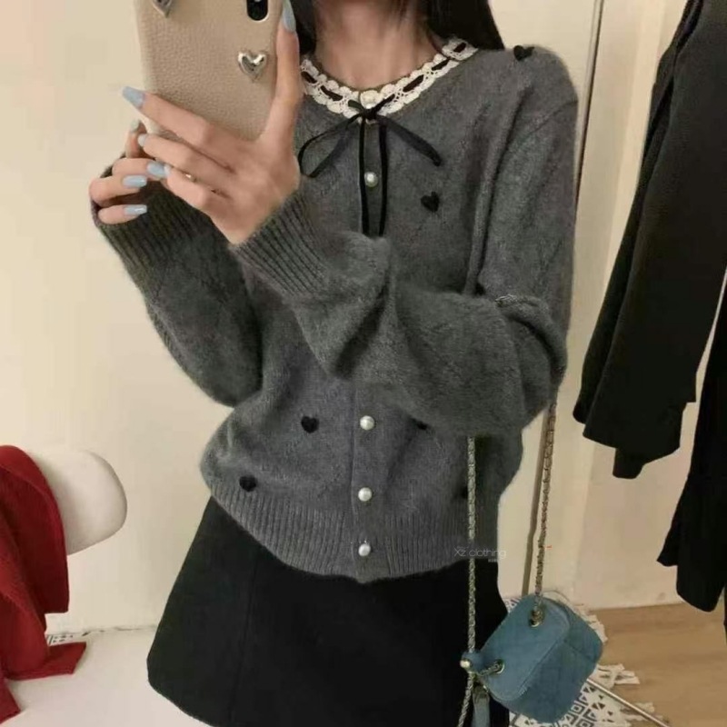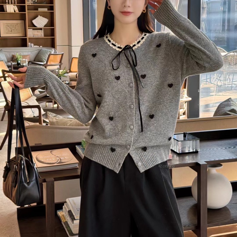 French High-end Lace Trim Age-reducing Love Bow Tie Sweater For Women