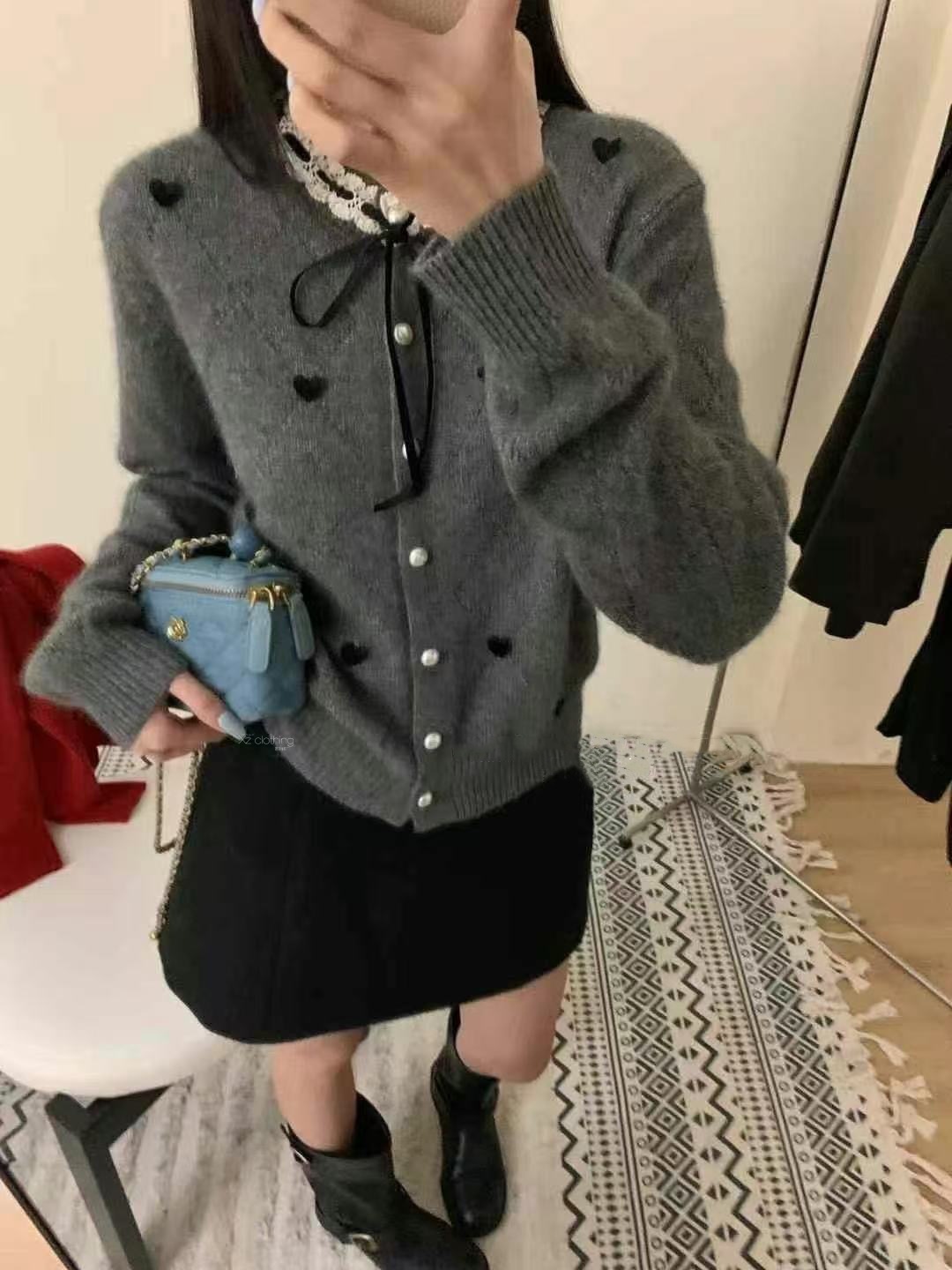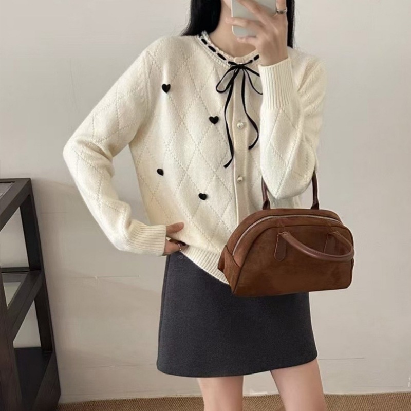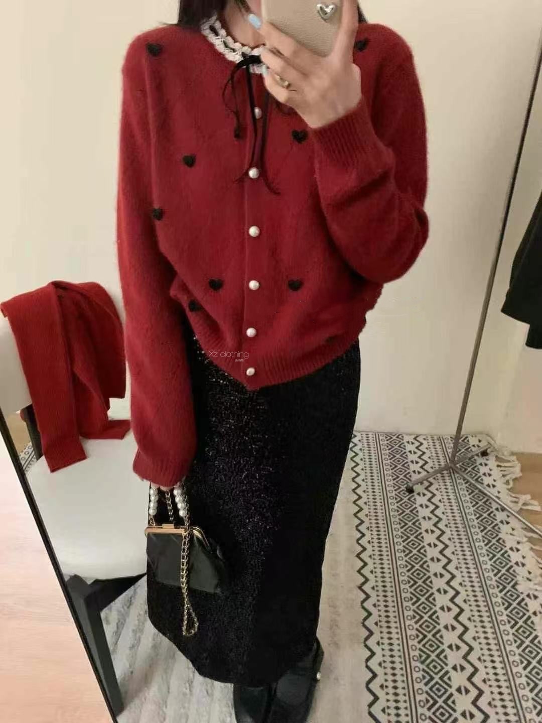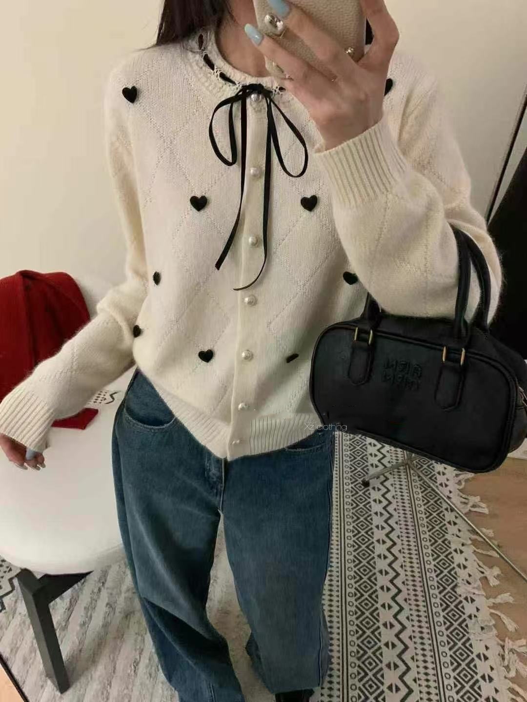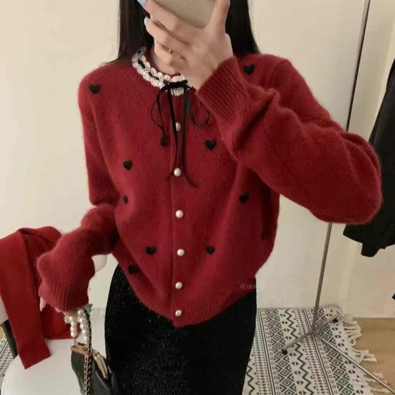 French High-end Lace Trim Age-reducing Love Bow Tie Sweater For Women