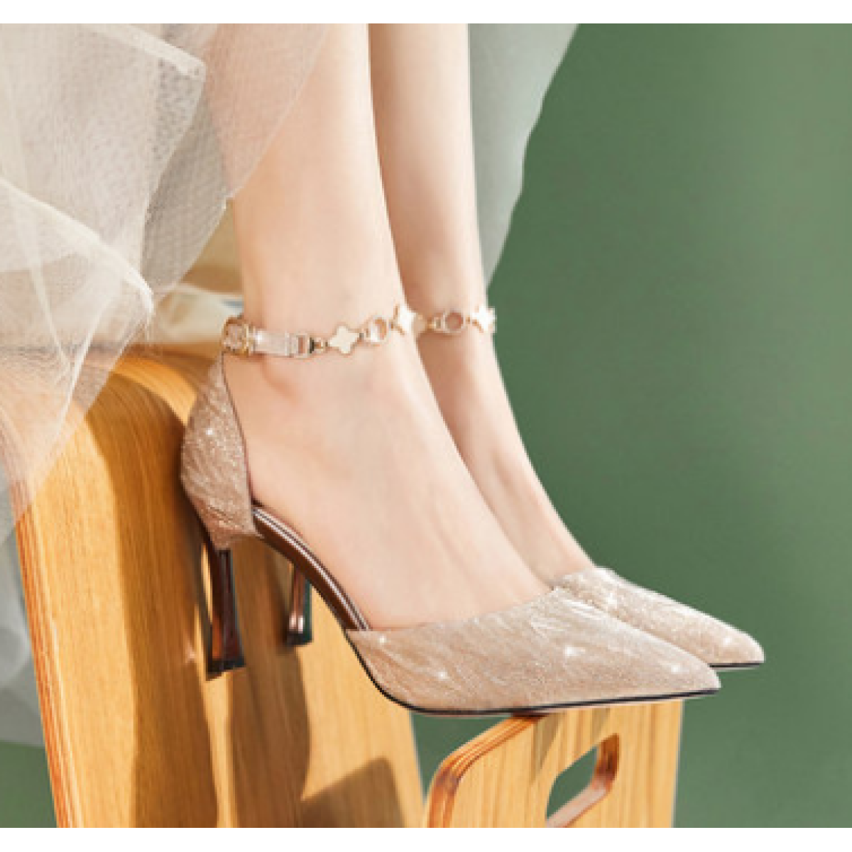 Elements: Shallow mouth, buckle, sequins, bright silk