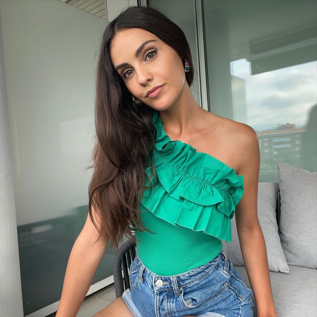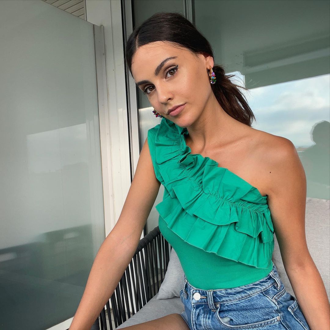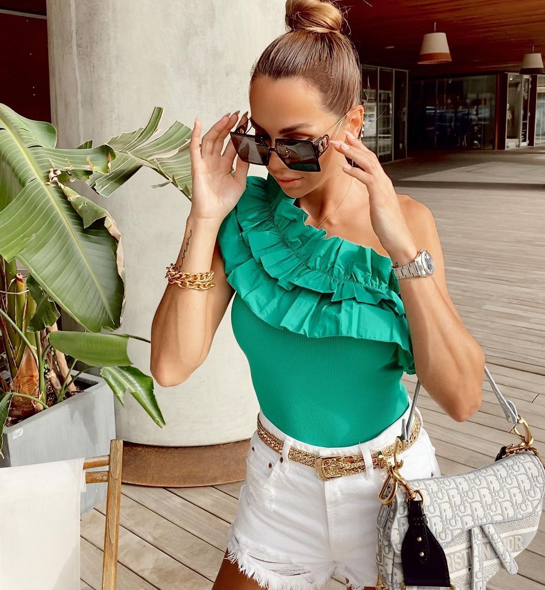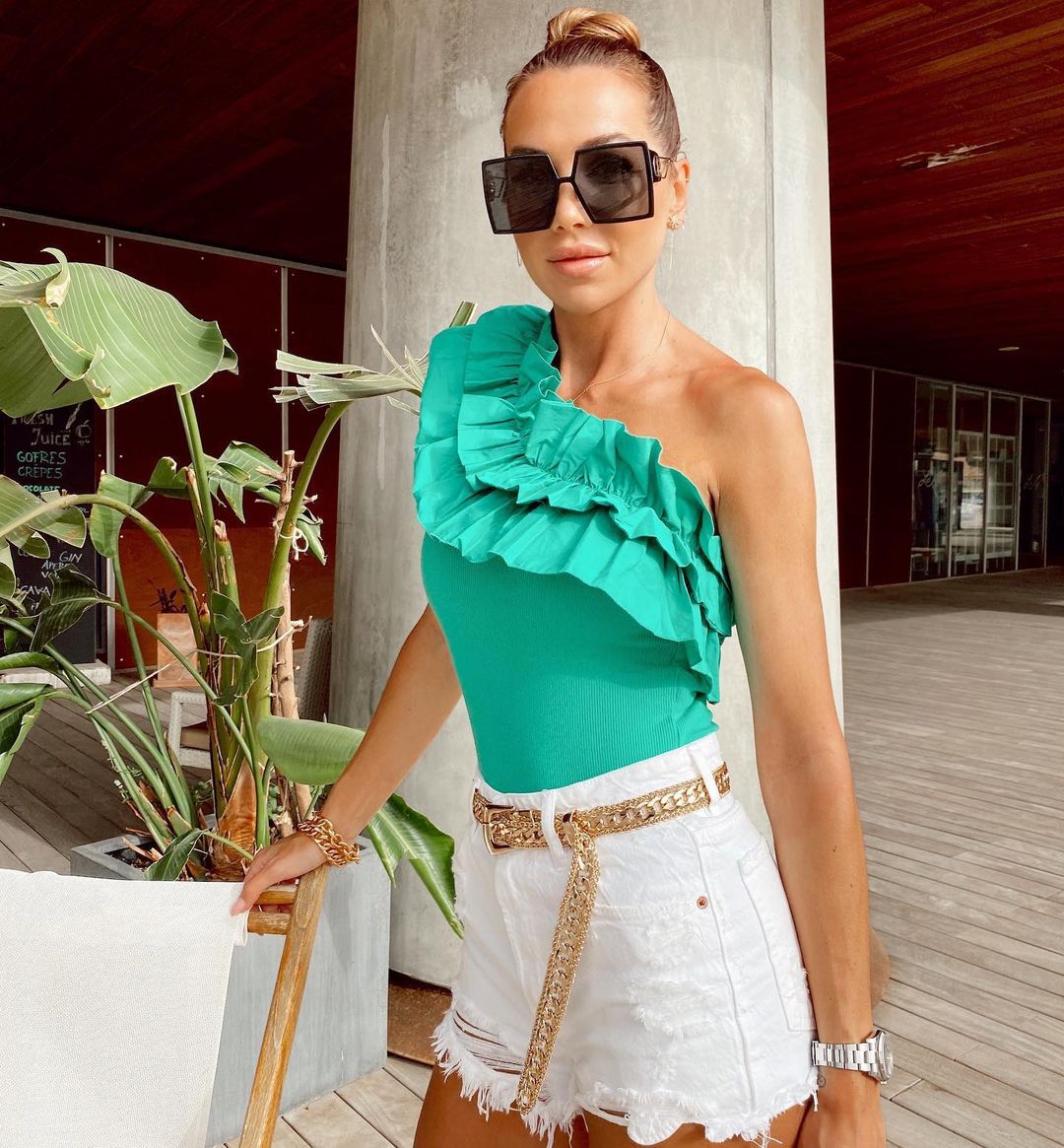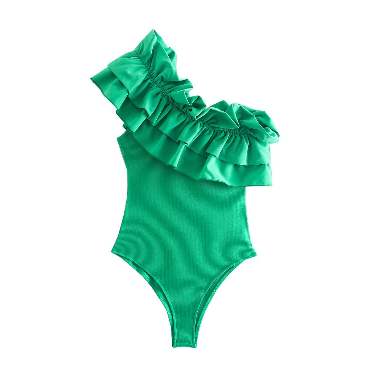 French One-shoulder Green Ruffle Shorts Jumpsuit