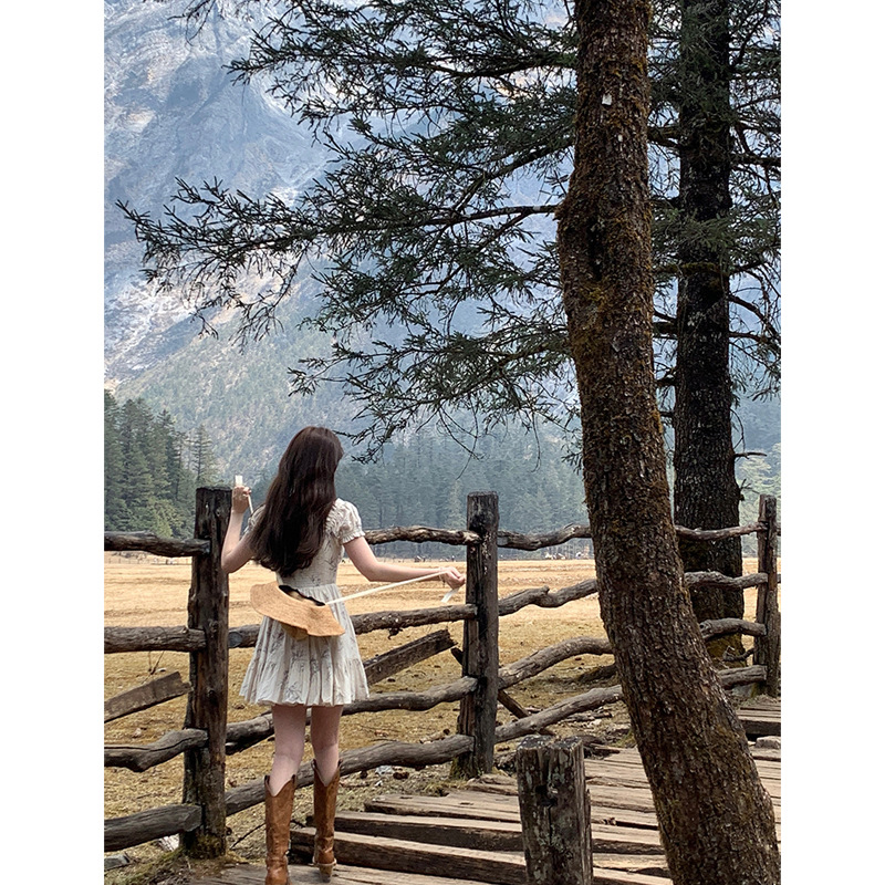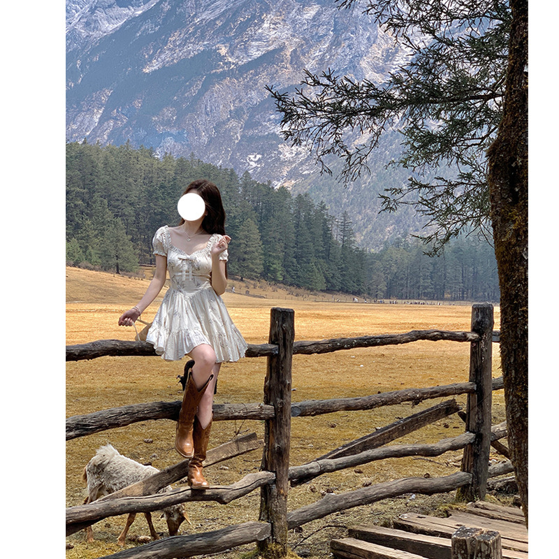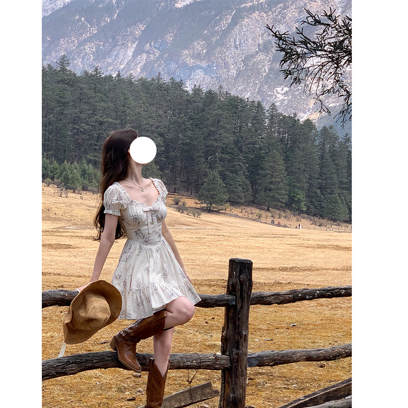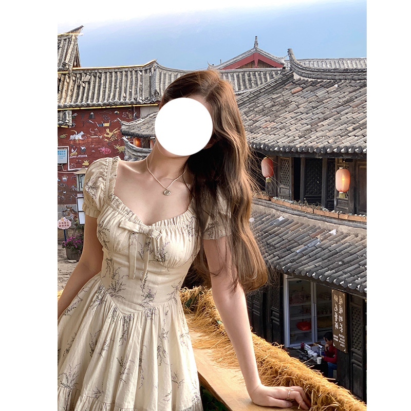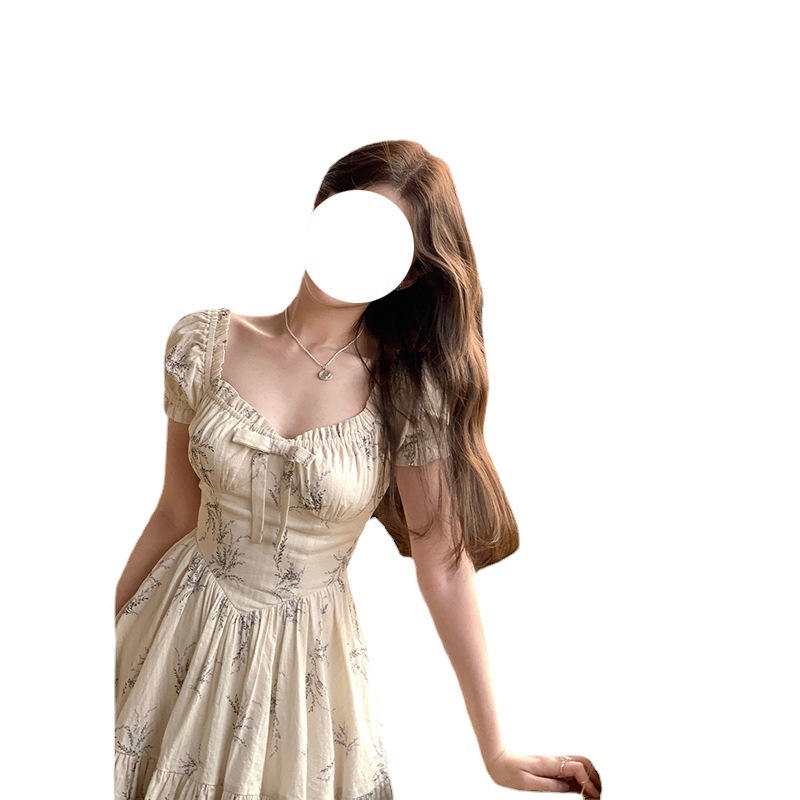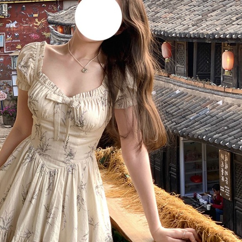 French Retro Square Neck Bow Floral Dress
