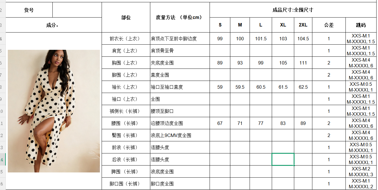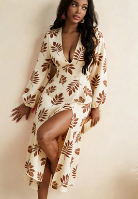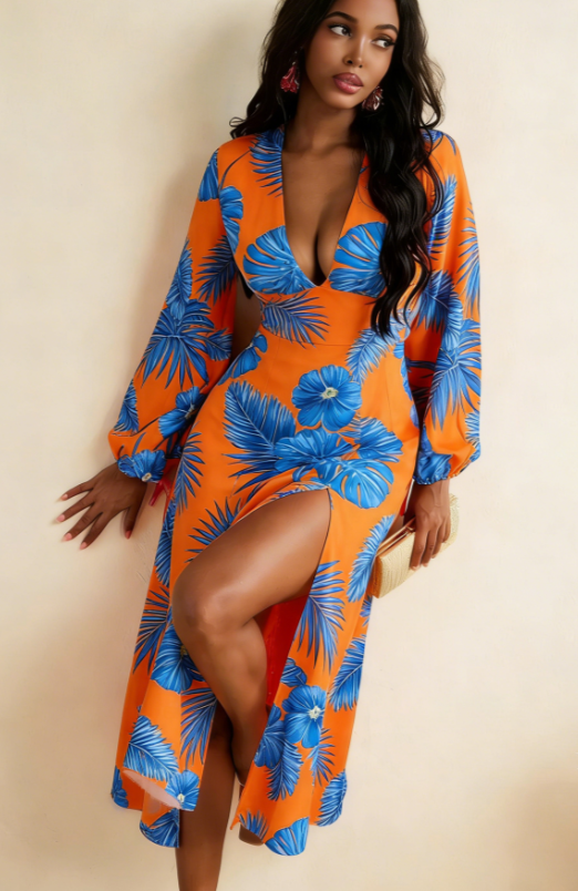 Design: Deep V-neck, puff cuff long sleeves, high-waisted A-line skirt with side slit, retro, sexy, and elongating
