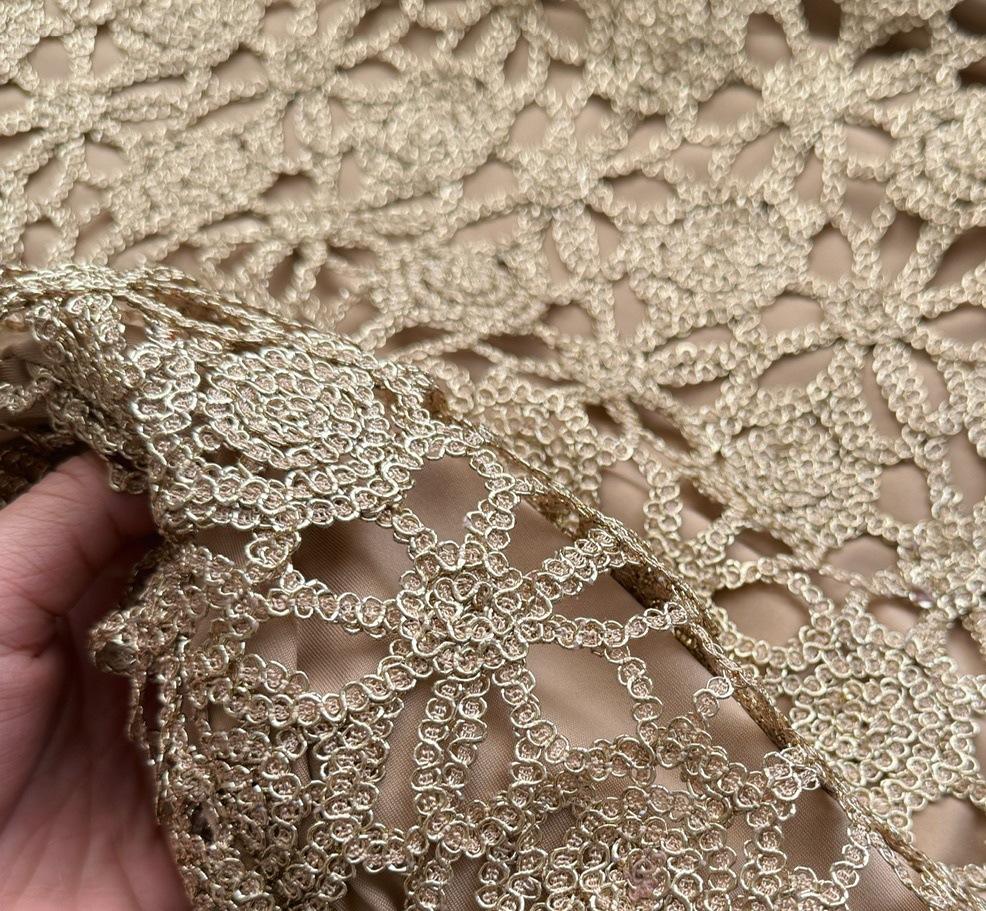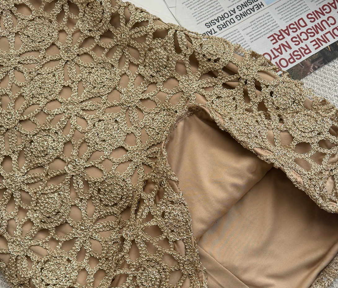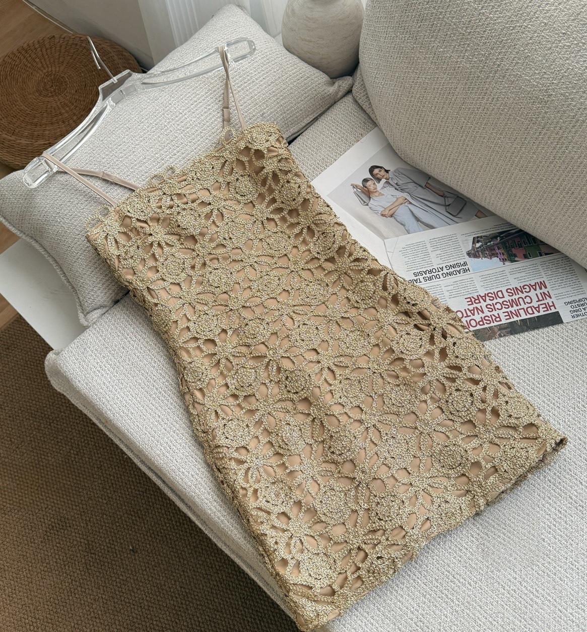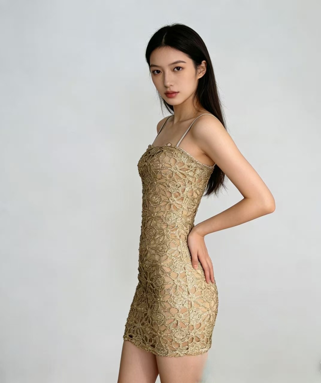 French-Style Delicate Champagne-Gold Hollowed-Out Camisole Dress