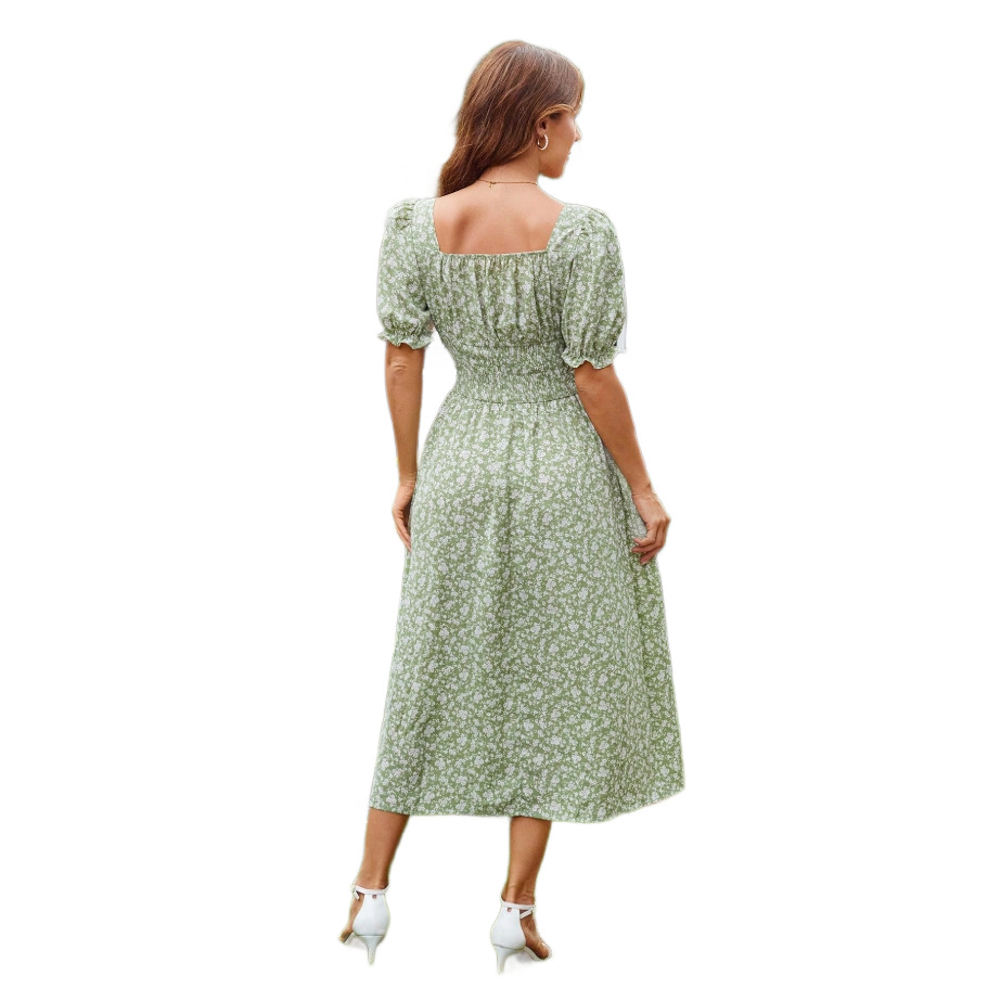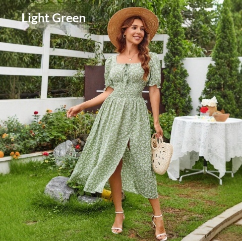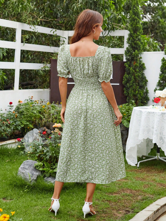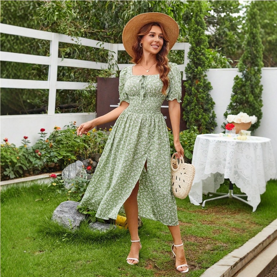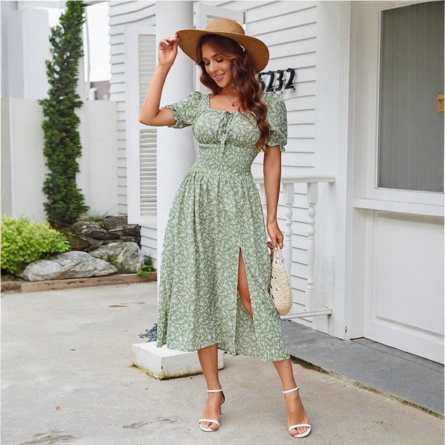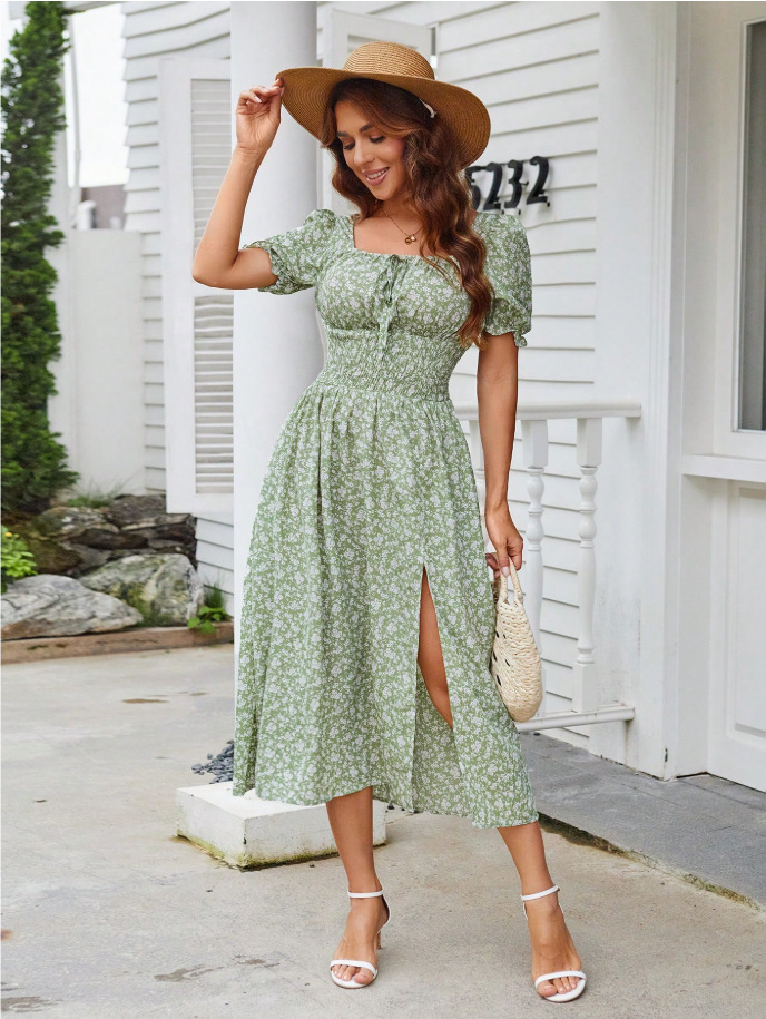 Trendy Elements: Lace-up, Floral Print, Slit, Puff Sleeves, Ruching