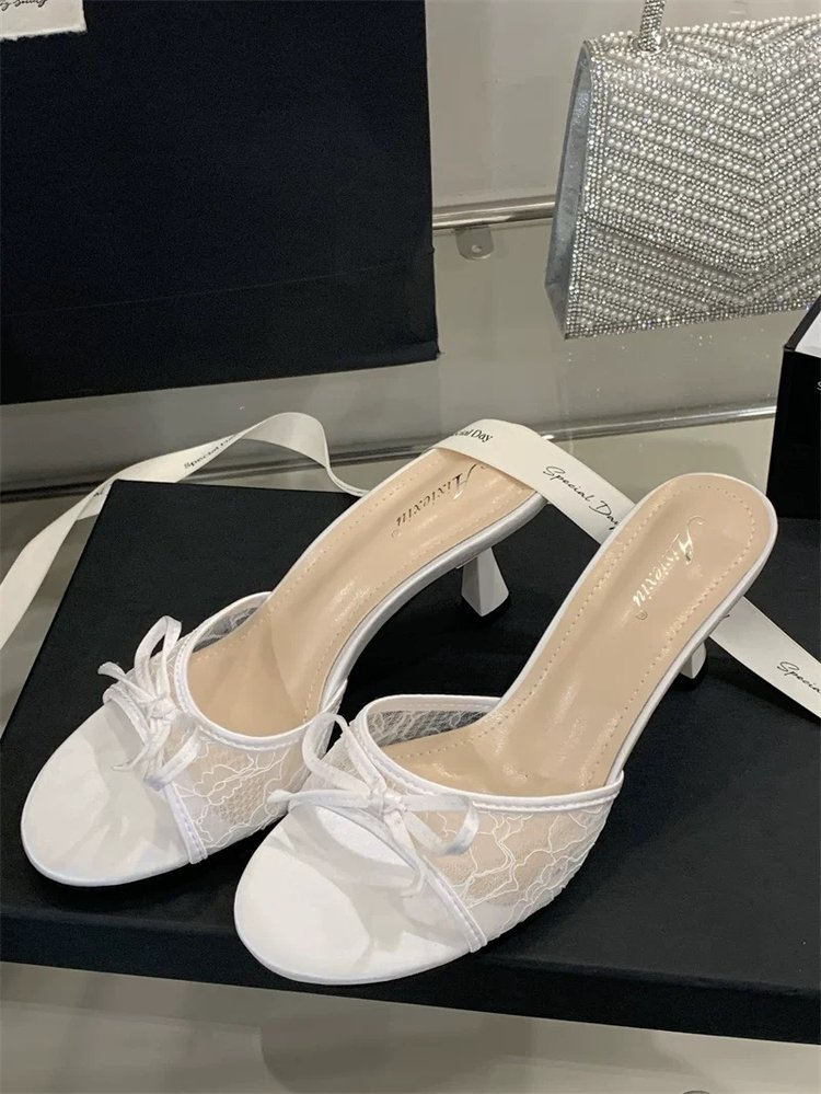 Step into delicate elegance with these French-inspired lace mules. Featuring a romantic floral lace upper, a sweet satin bow accent, and a slender kitten heel, these slip-on sandals blend vintage charm with modern comfort. The soft satin toe cap adds a luxurious touch, making them perfect for pairing with dresses, skirts, or feminine outfits for brunch, dates, or special occasions.