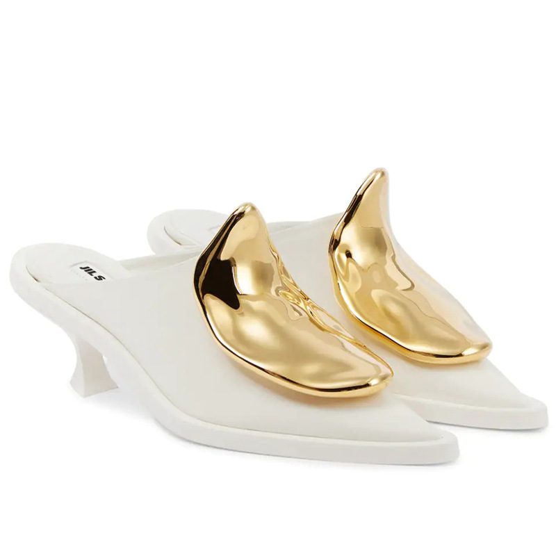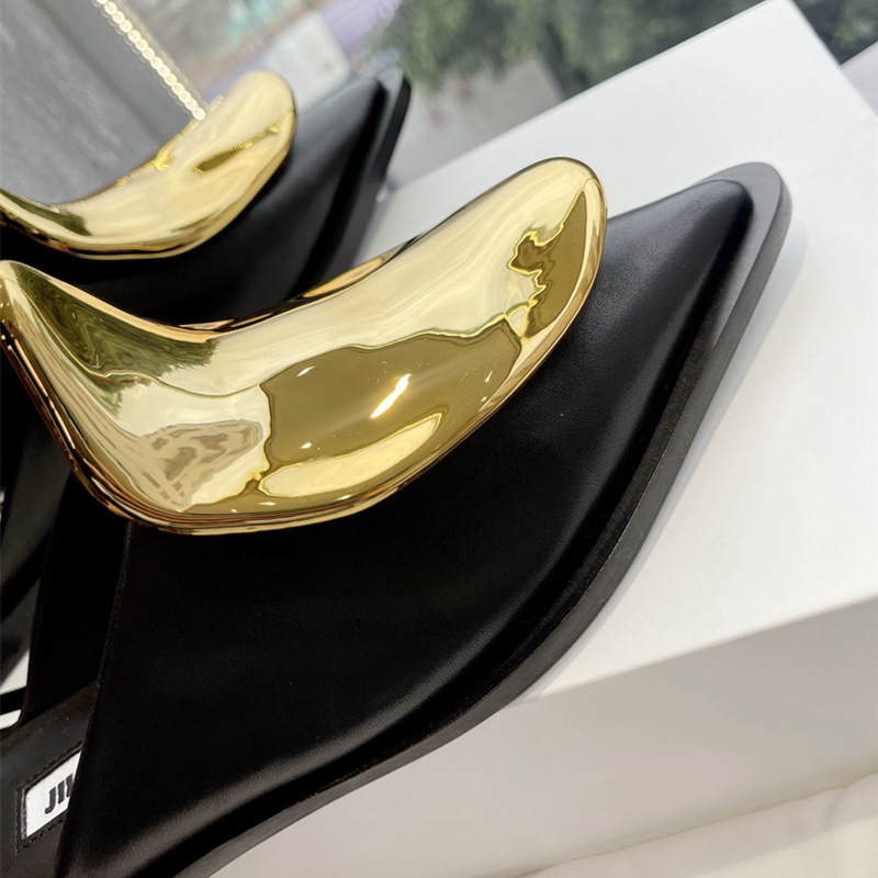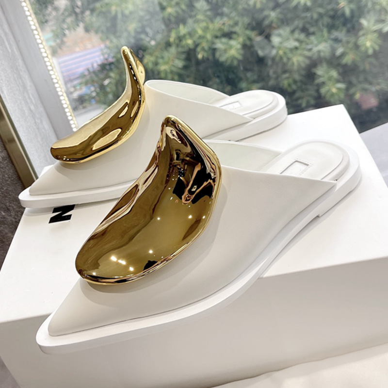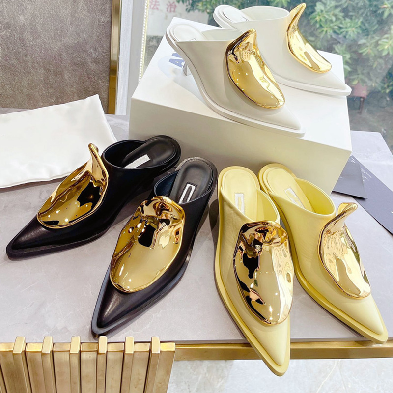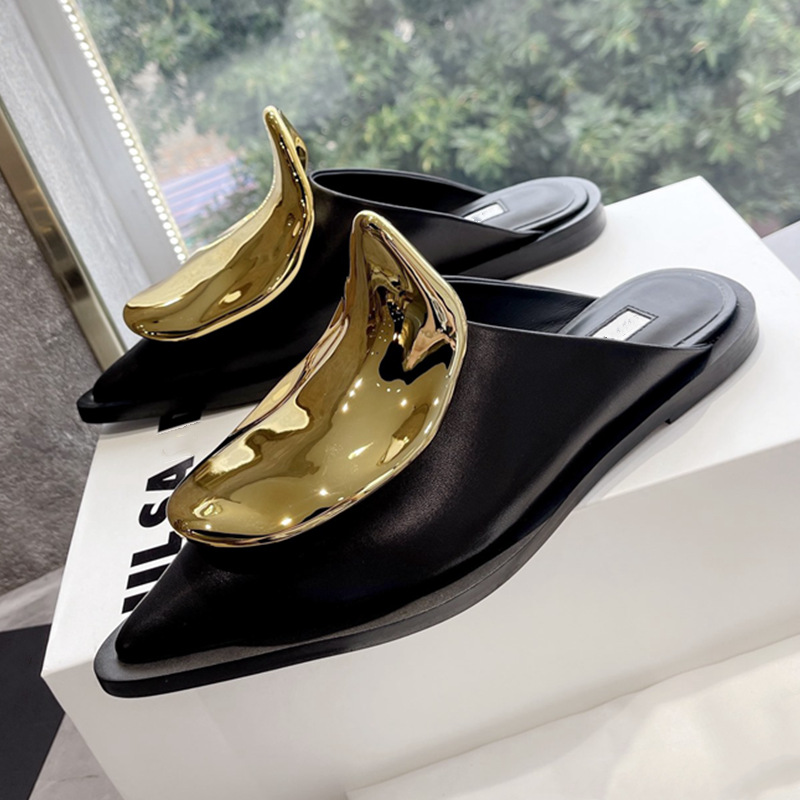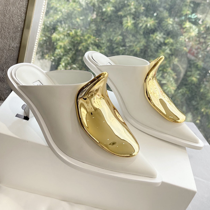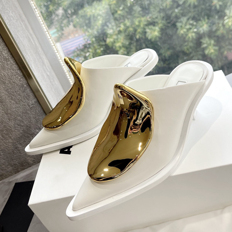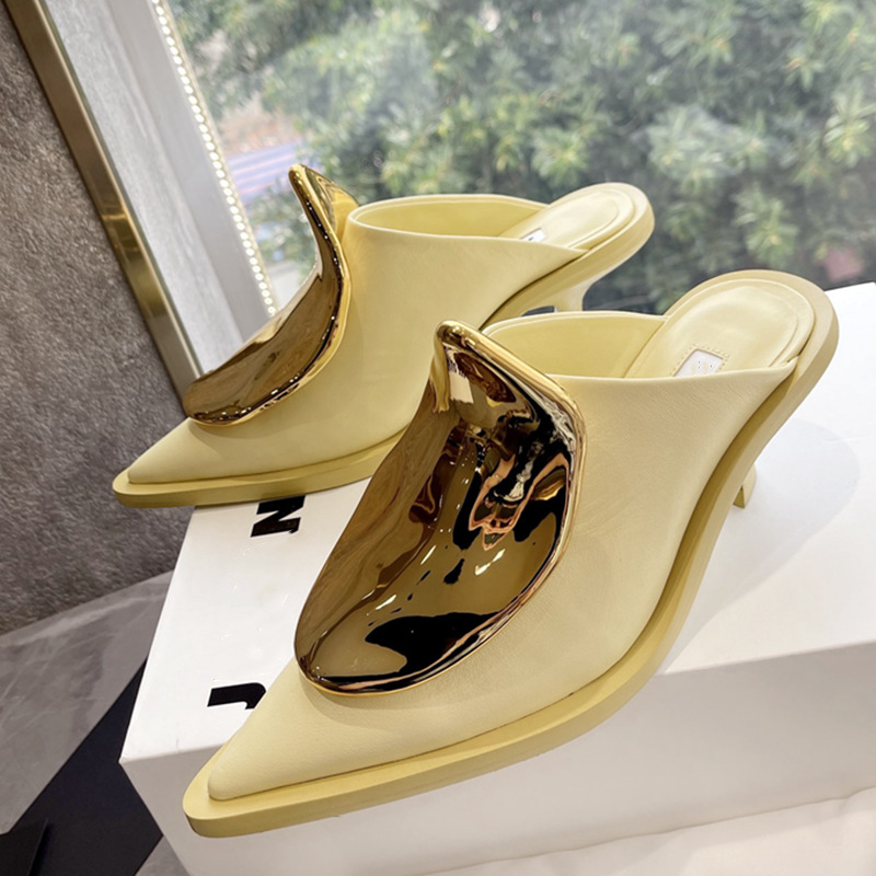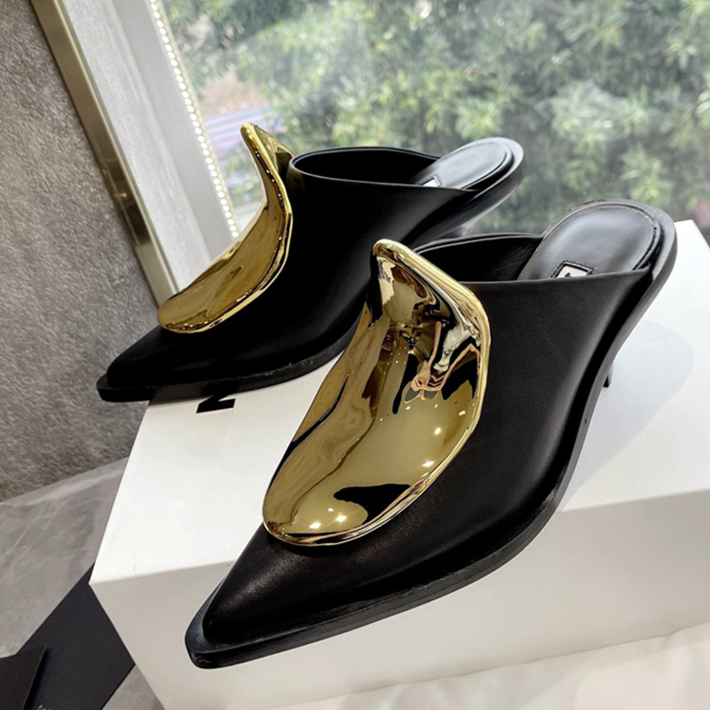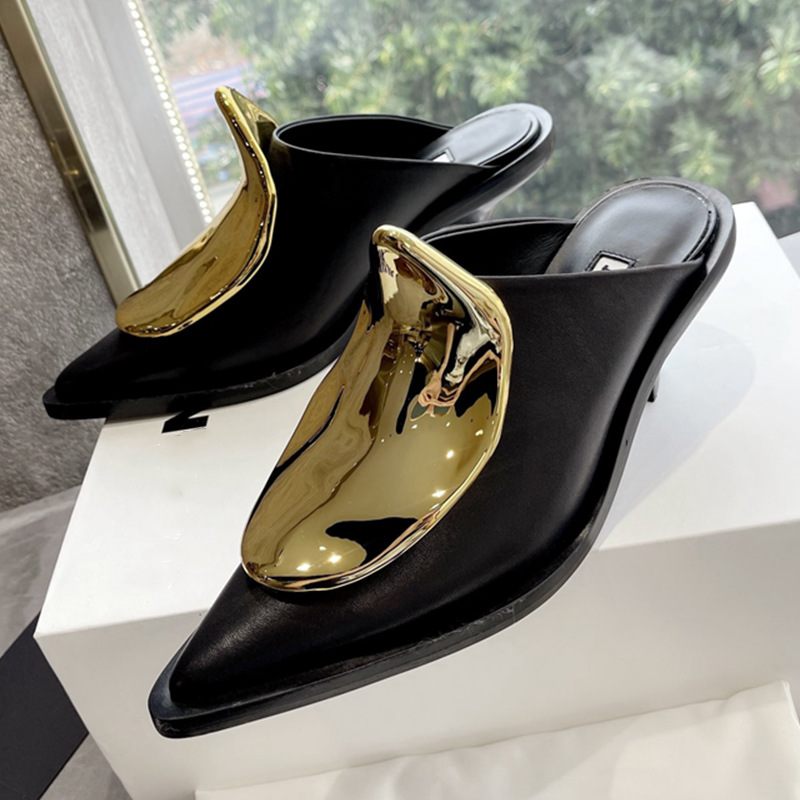 French Style Pointed Toe Kitten Heel Muller Closed-toe Slippers Metal Decoration