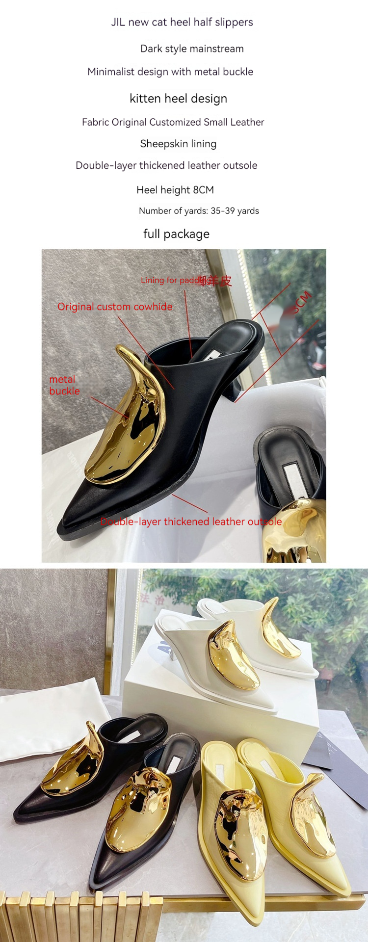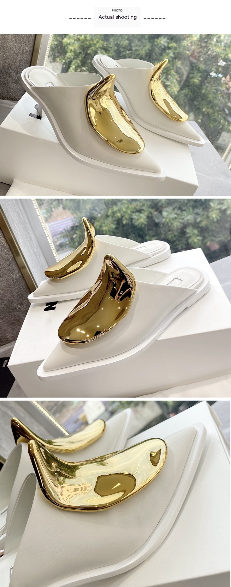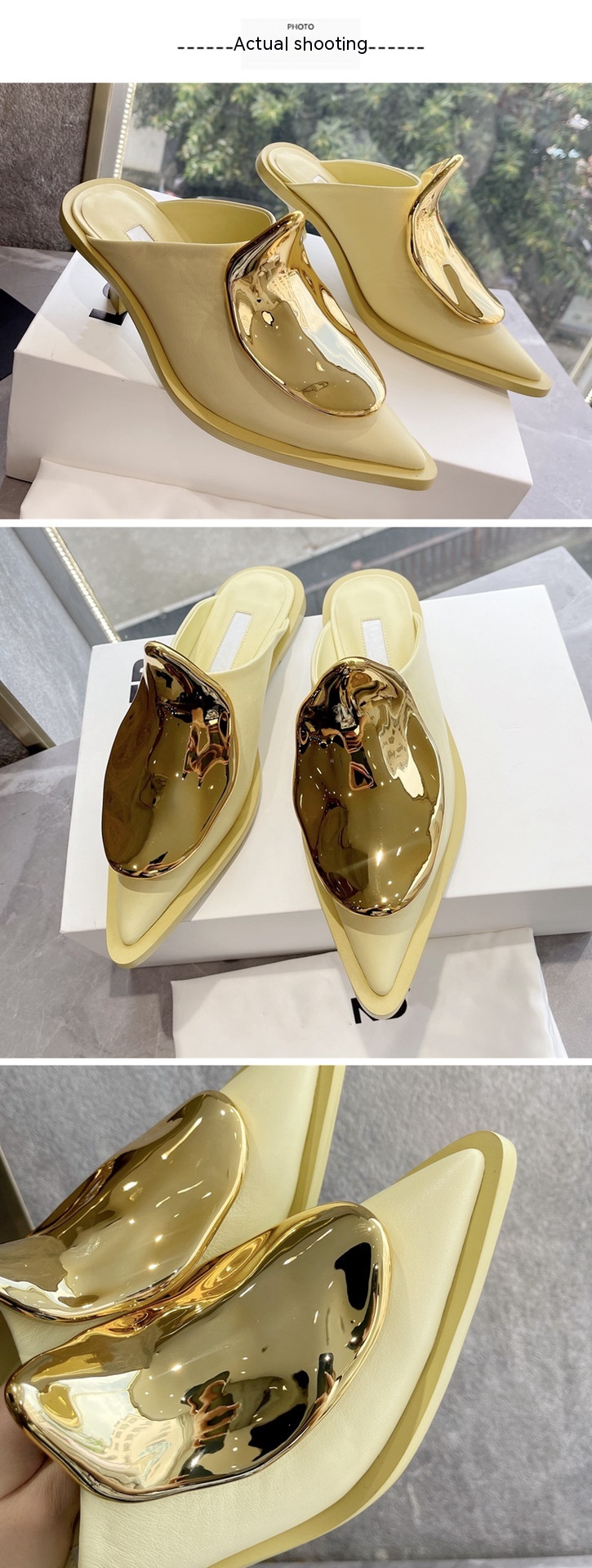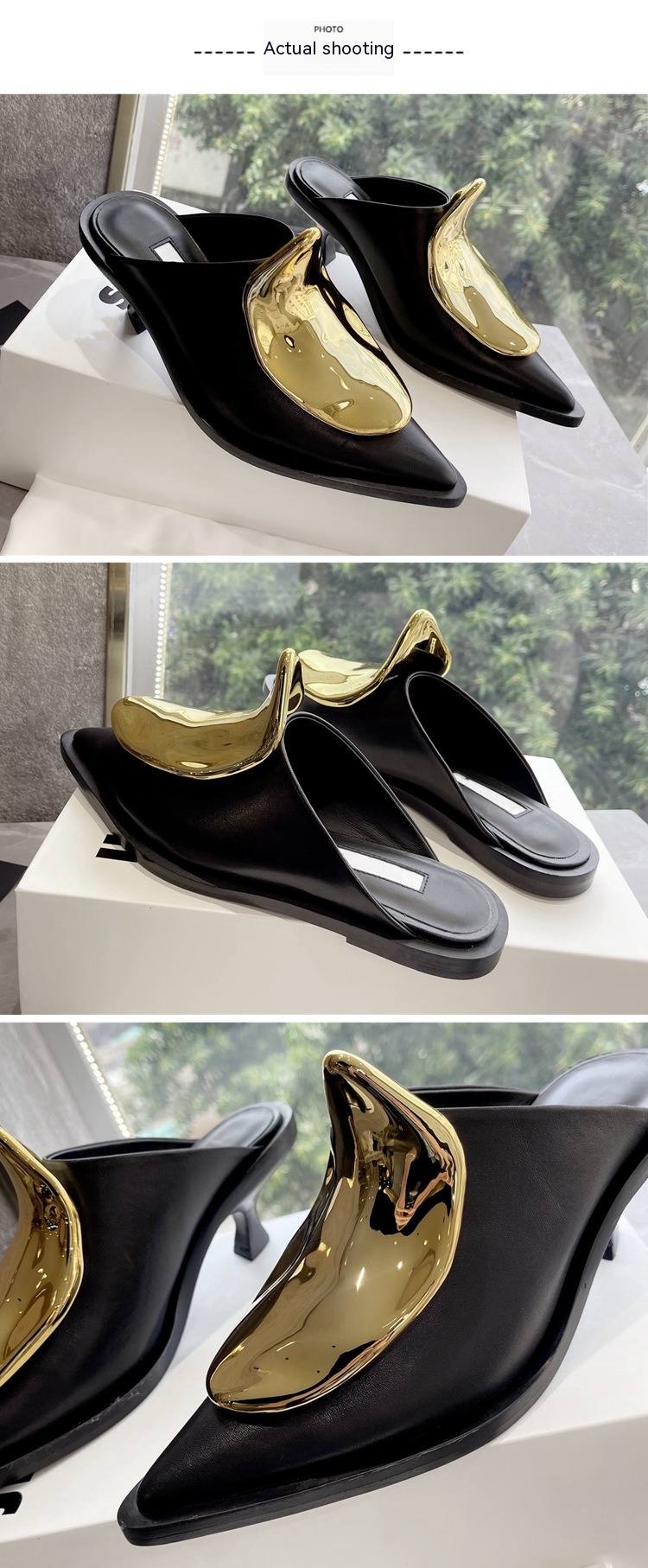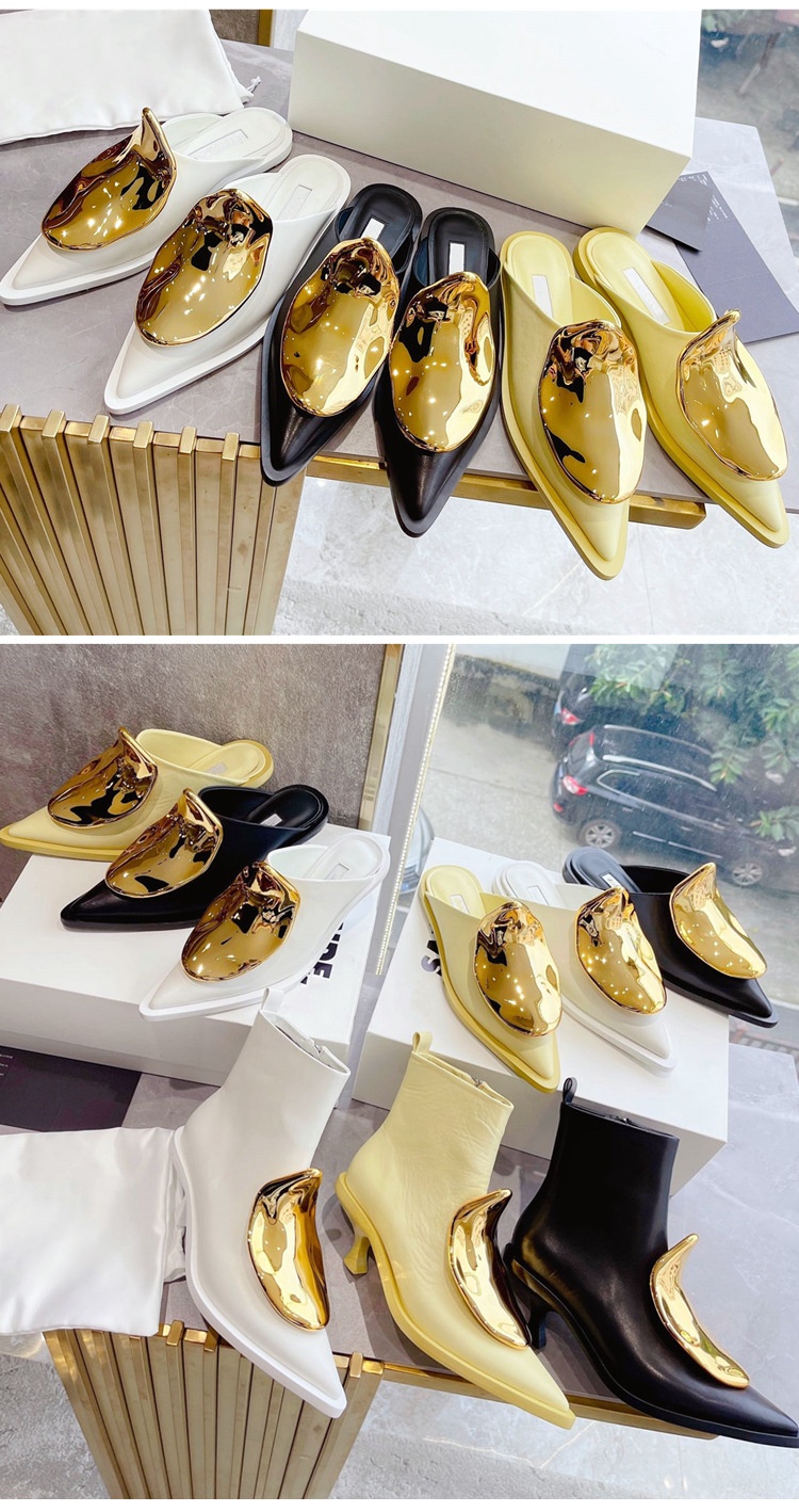 French Style Pointed Toe Kitten Heel Muller Closed-toe Slippers Metal Decoration