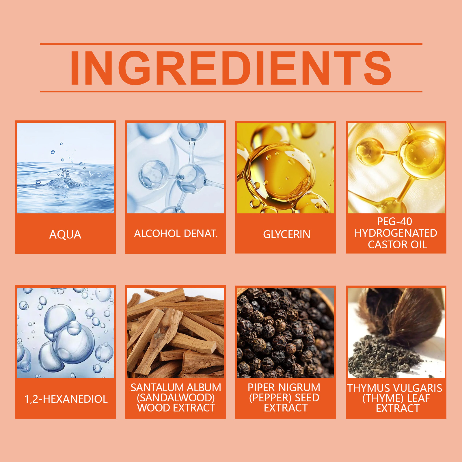 Ingredients: water, denatured ethanol, glycerin, PEG-40 hydrogenated castor oil, 1,2-hexanediol, sandalwood extract, pepper extract and musk extract.
