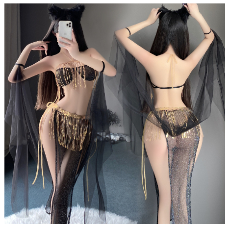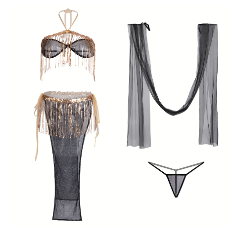 Color: Black [Bra + Shawl + Tulle Skirt + Thong]