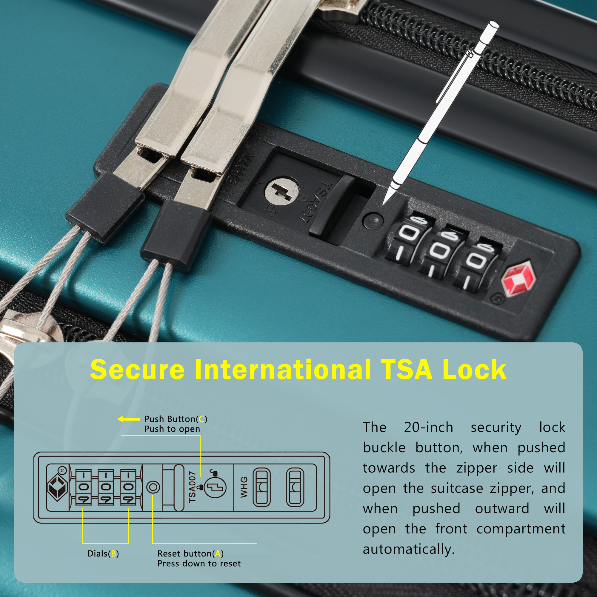 Accessories Introduction: 20-inch Exclusive Accessories: Front-opening design with multiple internal compartments USB port with built-in charging cable 24-inch Suitcase Accessories: Side carry handle Lightweight foot Expansion layer Common Accessories for All 2 Sizes: 3-stage telescopic handle Double 360° spinner wheels TSA-approved lock Top carry handle Explosion-proof zipper Internal divider compartments TSA COMBINATION LOCK 20-inch luggage combination lock Push the button (in the direction of the dial) to unlock the front opening and zipper compartment. Instructions for Reset the 3 Digit Secure TSA Lock--20 inch 1) With the lock in the original combination 0-0-0. 2) Press down the reset button [A] with a pen or other tool until you hear a "click" sound. 3) Set your own combination by tumning the dials [B]. For example,8-8-8. 4) Push the button [C] in the direction of the arrow until you hear the"click"sound again,confirming that you have set your personal combination. Instructions for Reset the 3 Digit Secure TSA Lock--24 inch 1. The initial password of lock is 0-0-0. 2.Press the reset hole with the tip of the pen. 3.Set the new 3-digit code while pressing. 4.Now you can open the lock with the new password.