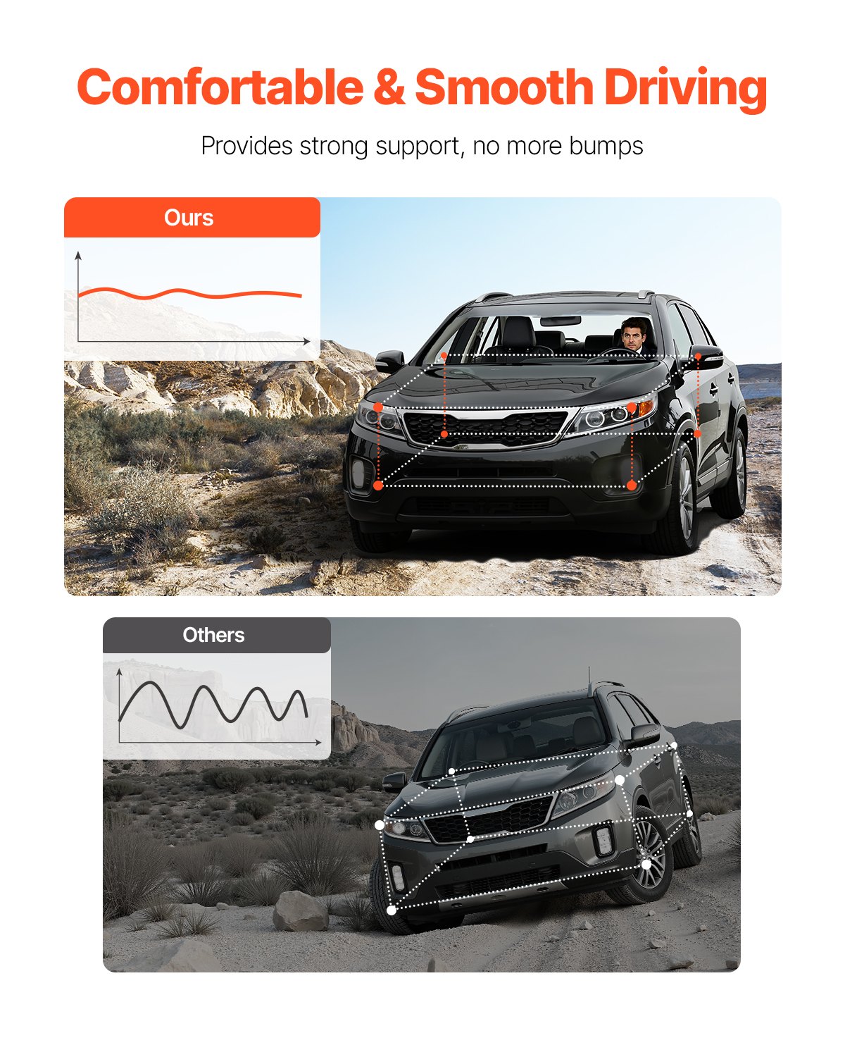 Restores Performance: Featuring high-tensile springs and dust boots, these shock and strut assemblies effectively absorb road impacts, restore suspension performance, stabilize the vehicle, and enhance comfort and control.