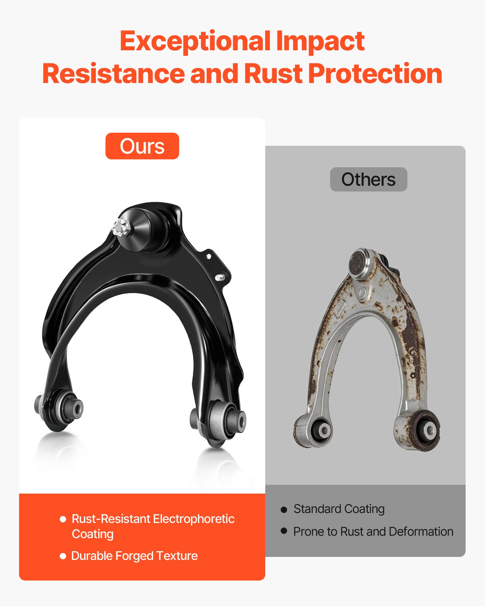 Long-Lasting Use: Crafted from forged steel and finished with an electrophoretic coating, our control arms ensure excellent impact, rust and corrosion resistance, delivering long-lasting durability and a longer lifespan
