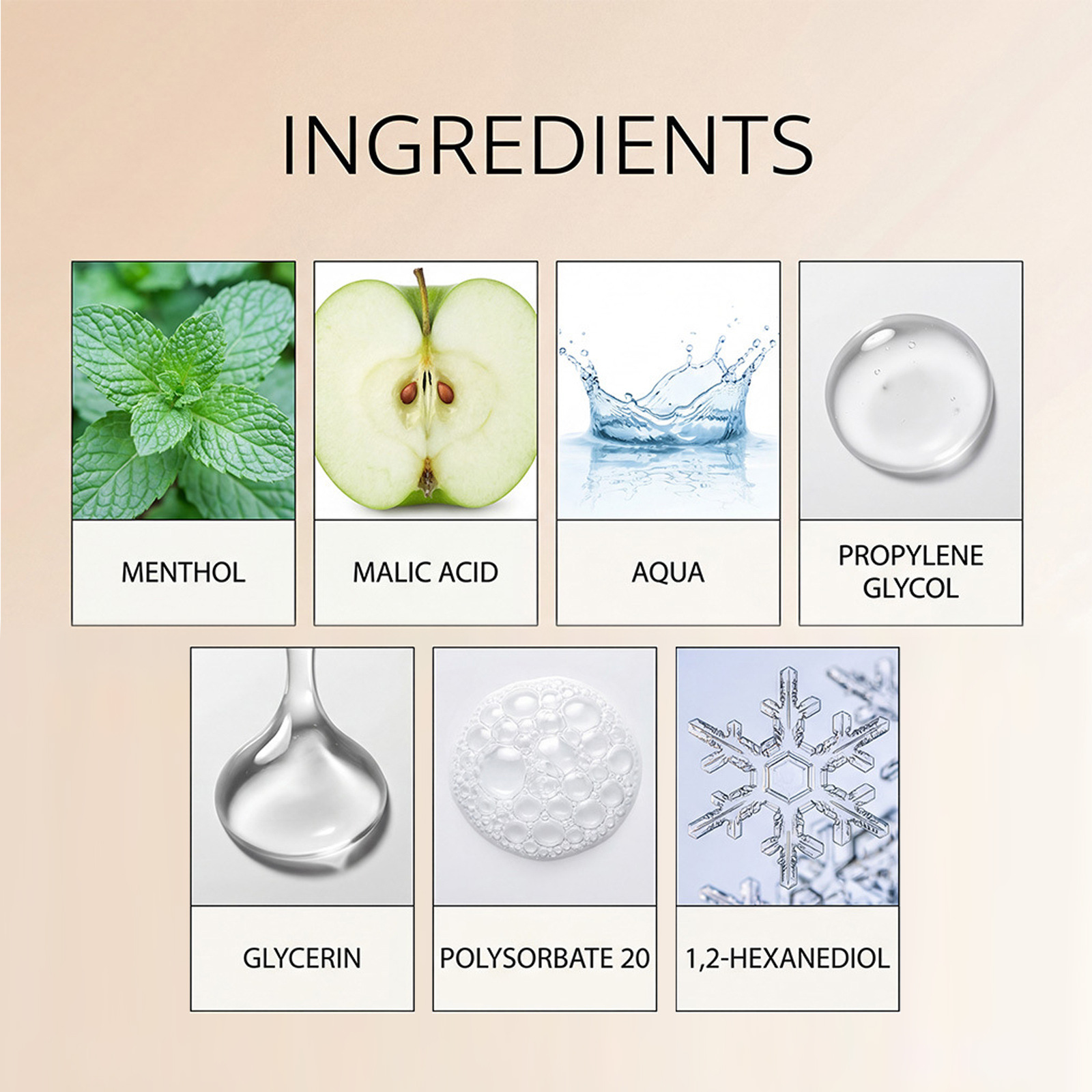 Water, propylene glycol, ethanol, glycerol, polysorbate-20, 1,2-hexanediol.