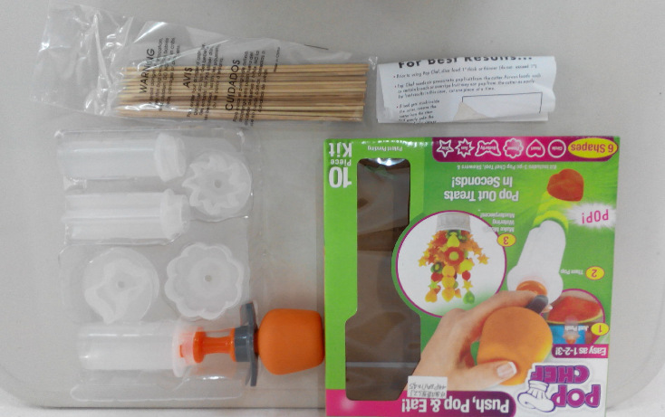 This kit includes a 3-piece tool, bamboo skewers and six fun shapes. The shapes in this