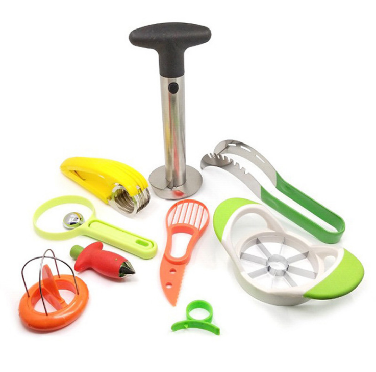 product name Nine sets Product specifications 23*13*16 cm Product Size As shown Qty 20 PCS product material Stainless steel, environmentally friendly plastic Box gauge 65*47*32 cm Product weight 700 g Gross weight 14/15 KG Product packaging Carton (support customization) Package included Pineapple meat extractor*1, watermelon meat extractor*1, apple slicer*1, hand clip banana slicer*1, strawberry to pedicle*1, digging avocado device*1, peeling ball digger*1, digging Kiwifruit*1, open orange*1