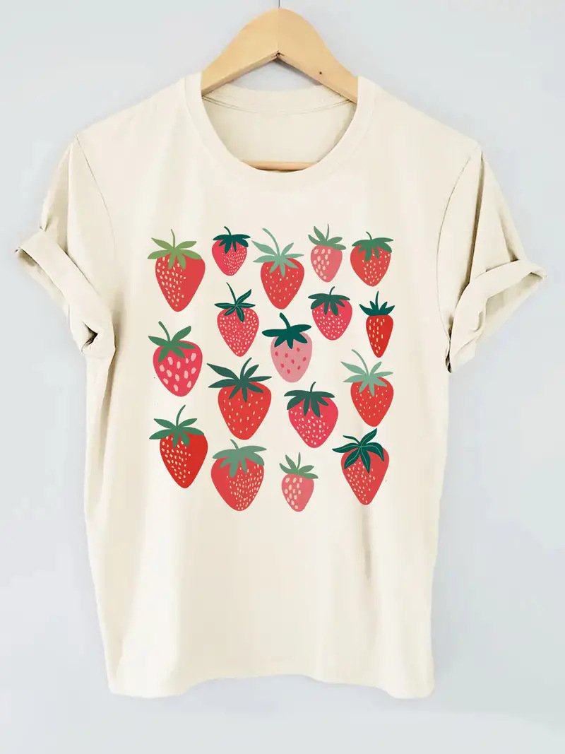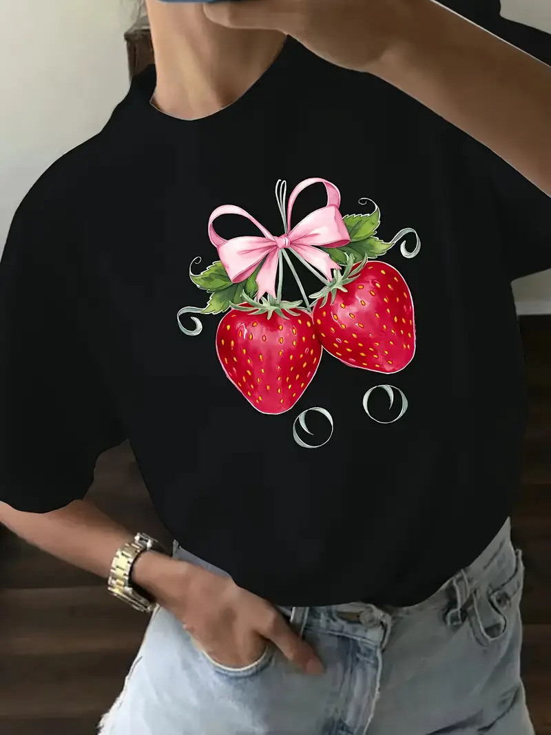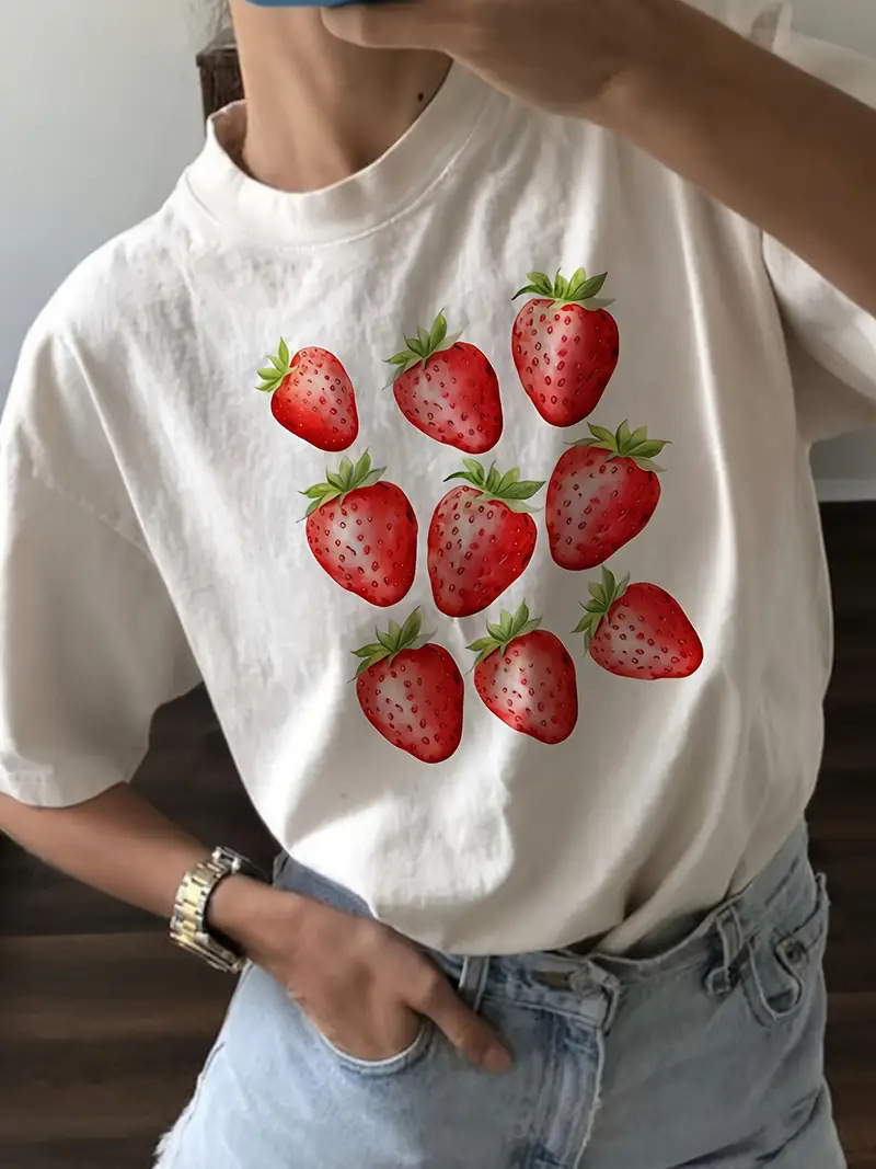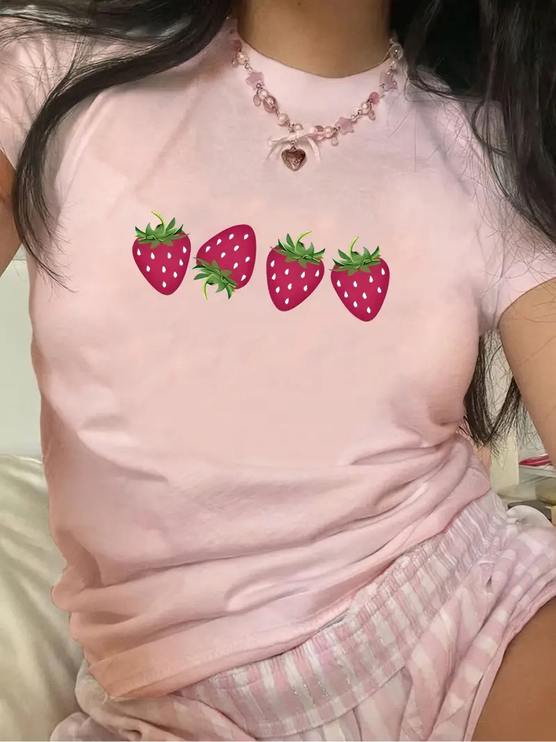 Fruit Strawberry Round Neck Short Sleeve Top For Women