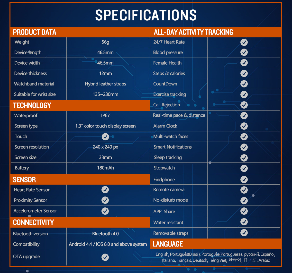 Additional features: health monitoring, information push, exercise tracking, smart reminders, sleep analysis, step counting, remote control selfie, blood pressure