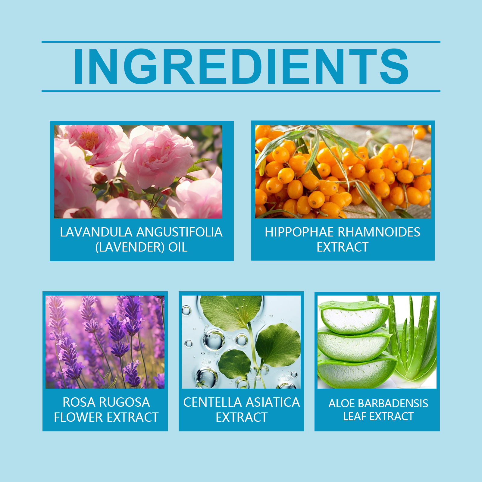 Ingredients: asiatic centella extract, aloe extract, lavender oil, sea buckthorn sea buckthorn extract, rose extract