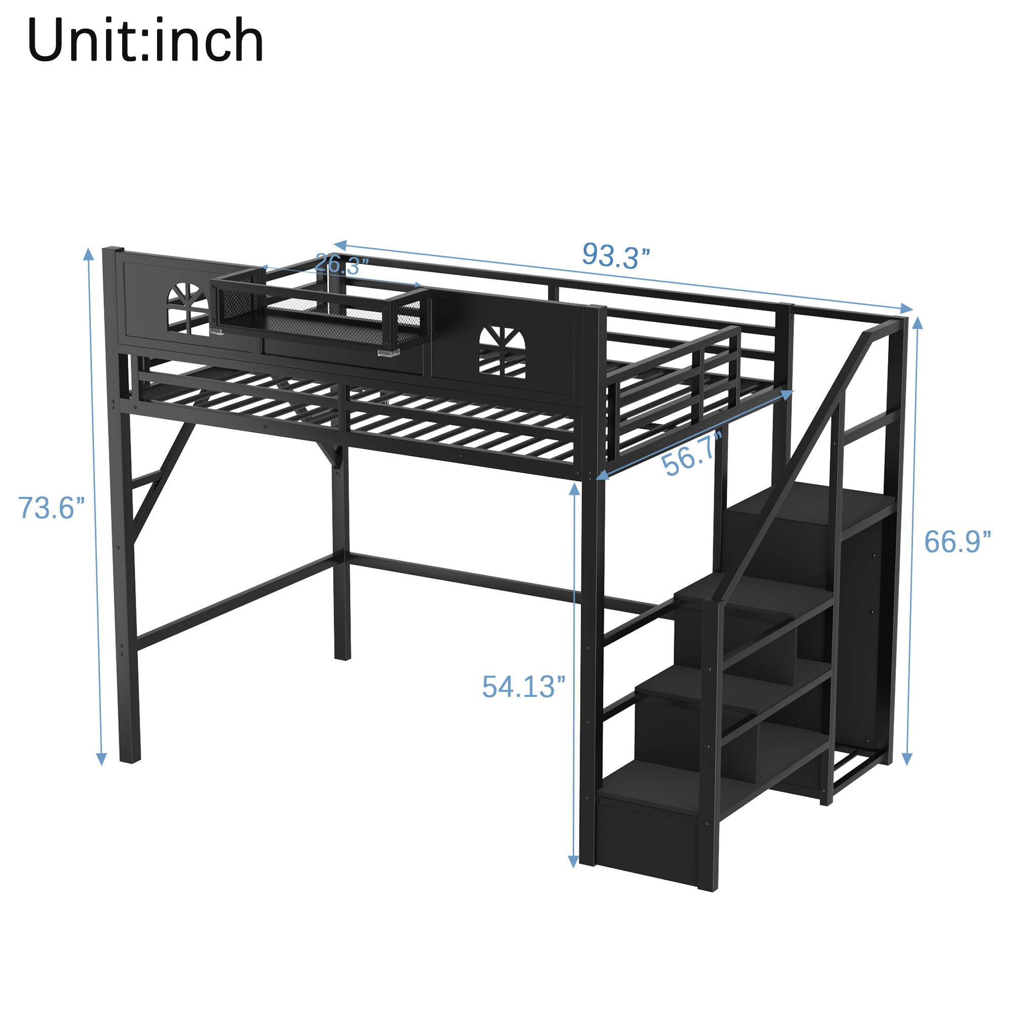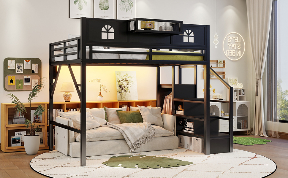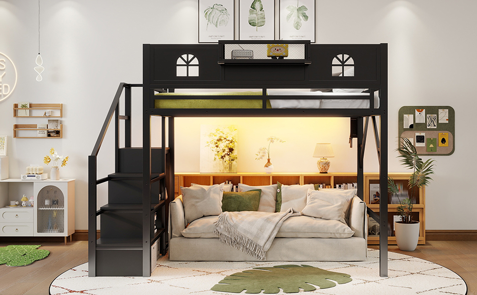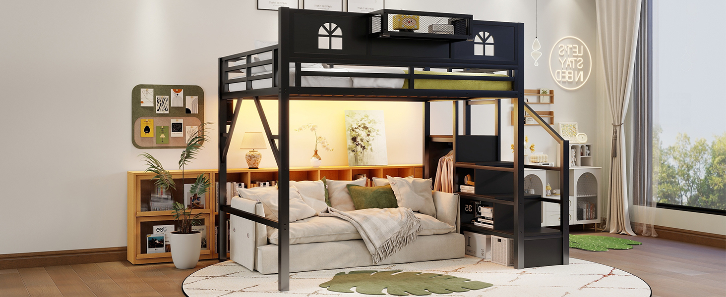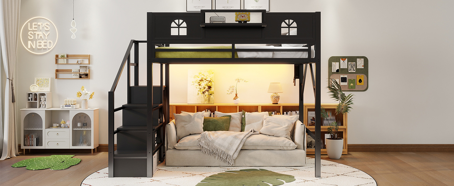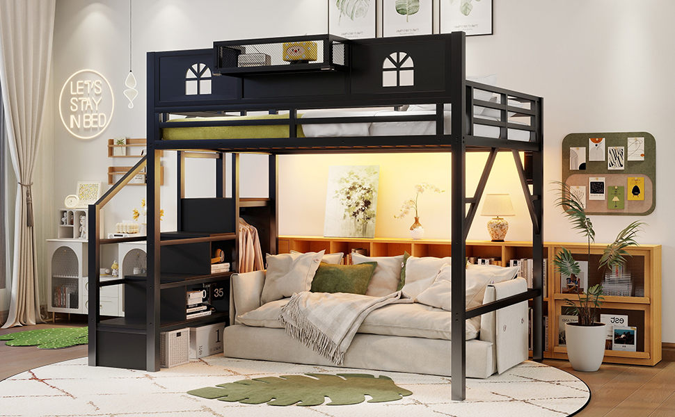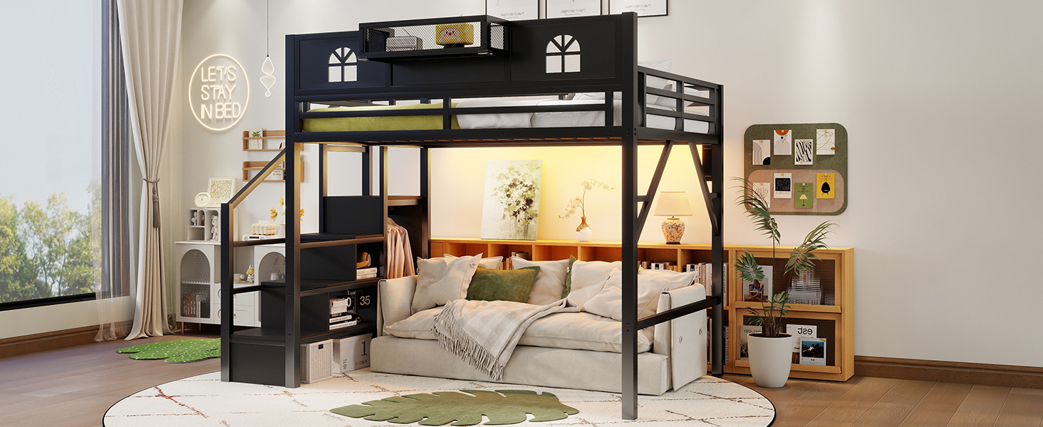 Product Name:Full Size Loft Bed with Stairs, Metal Full Loft Bed with High and House Shaped Guardrails, High Loft Bed with Wardrobe for Kids Teens, black( Expect Arrival Date2026/3/17)