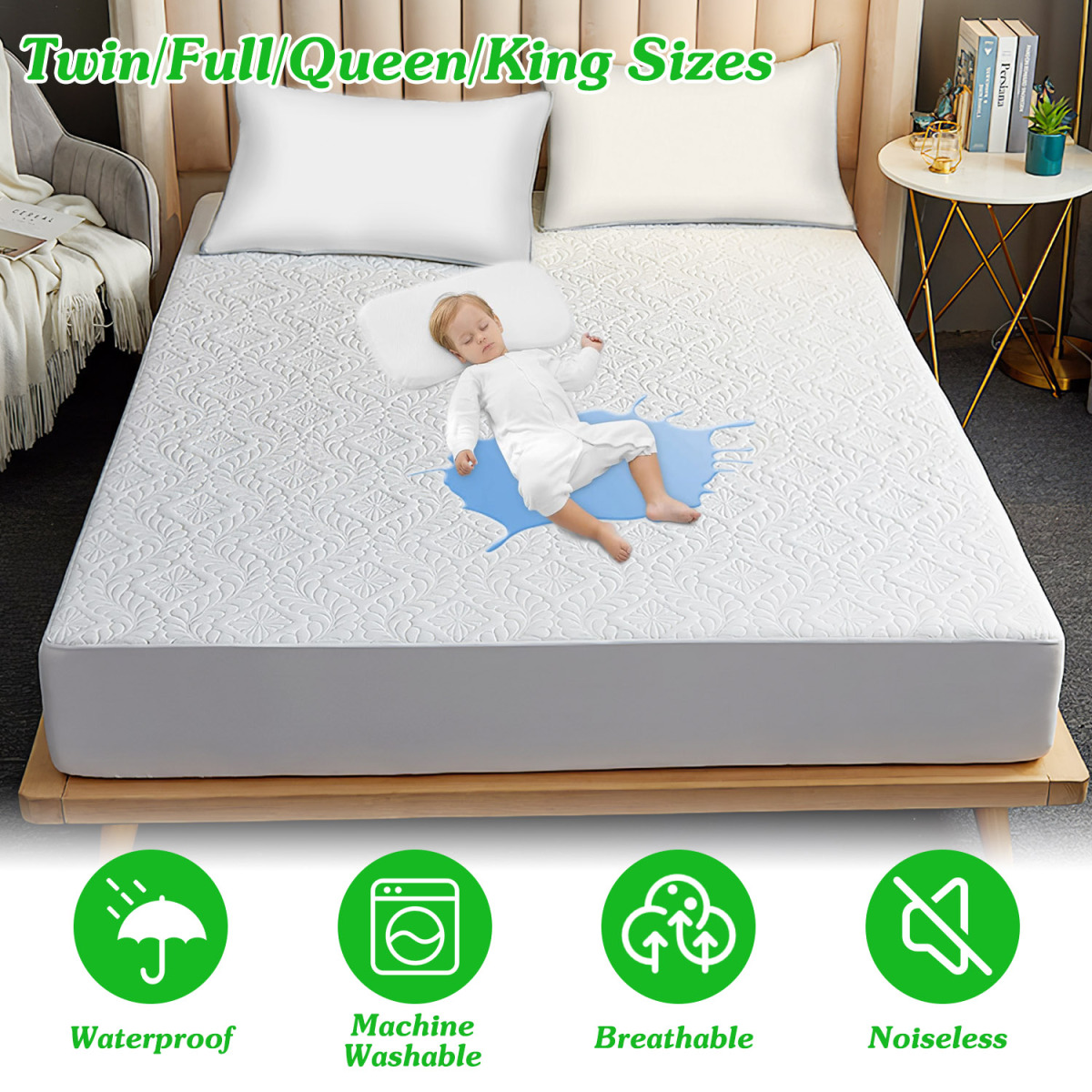 *Waterproof & Dustproof Protector*:Covered by enhanced-strength TUP membrane,our cotton mattress cover is definitely waterproof. Urine,sweat or any other spilled liquids can be quickly absorbed and locked in a cotton filling layer,while the TUP film effectively prevents any leakage,keeping your mattress as dry,clean,and fresh as always.
