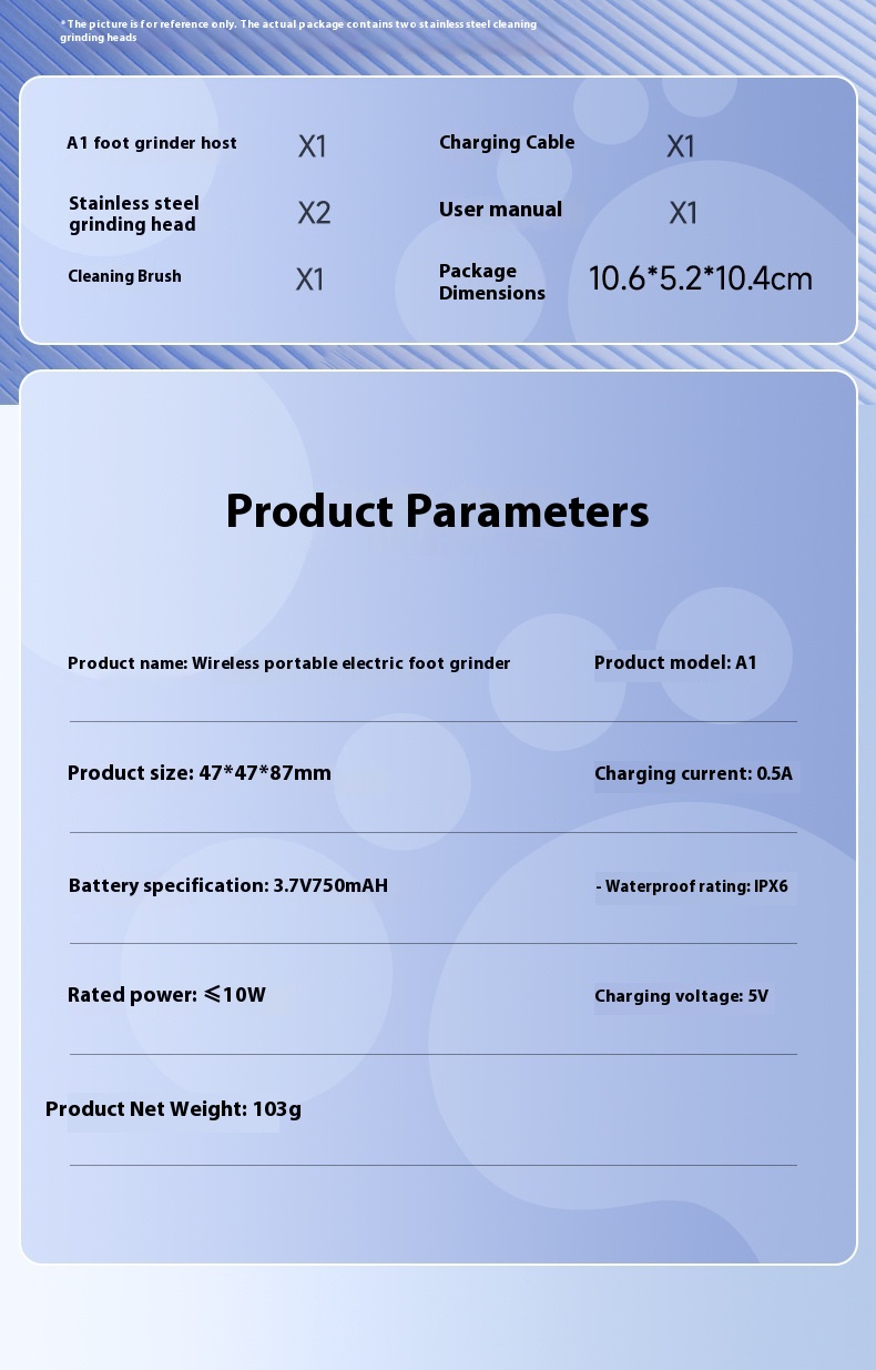 Packing List: Host * 1, charger * 1, grinding head * 2, cleaning brush * 1, manual * 1