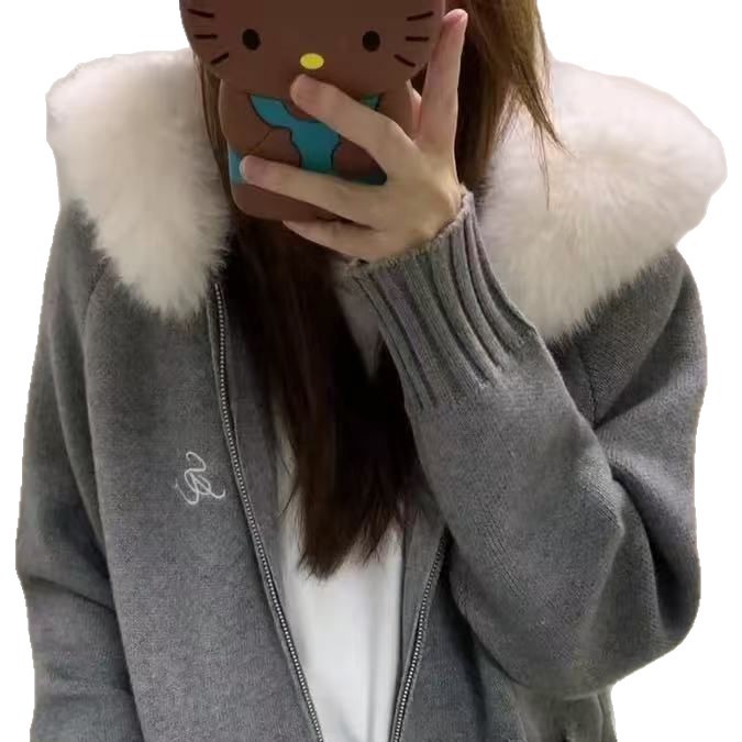 Fur Collar Hooded Knit Cardigan Women