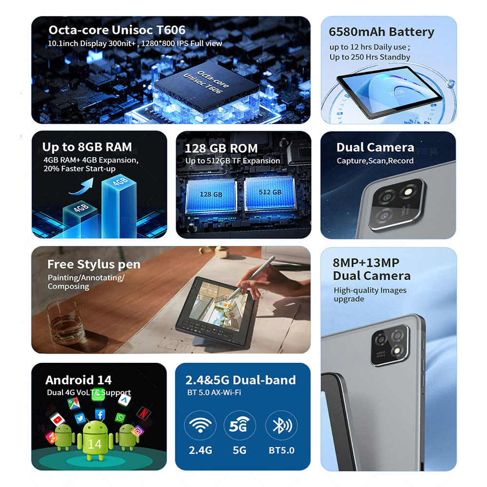 G-tab T11 Android 14 Tablet 10.1 Inch 1280&800 IPS Screen Unisoc T606 8 Core Max 1.6GHz 8GB RAM 4GB&4GB Expansion128GB ROM 2.4&5GHz WiFi Bluetooth 5.0 6580mAh Battery 8MP&13MP Camera Dual 4G
