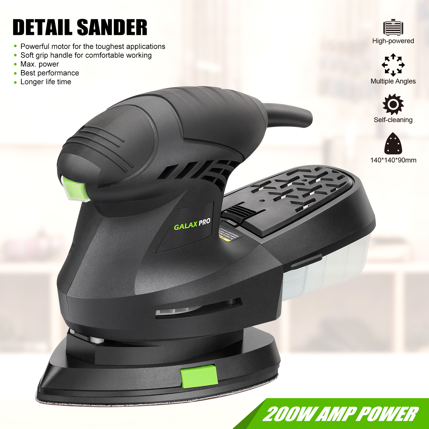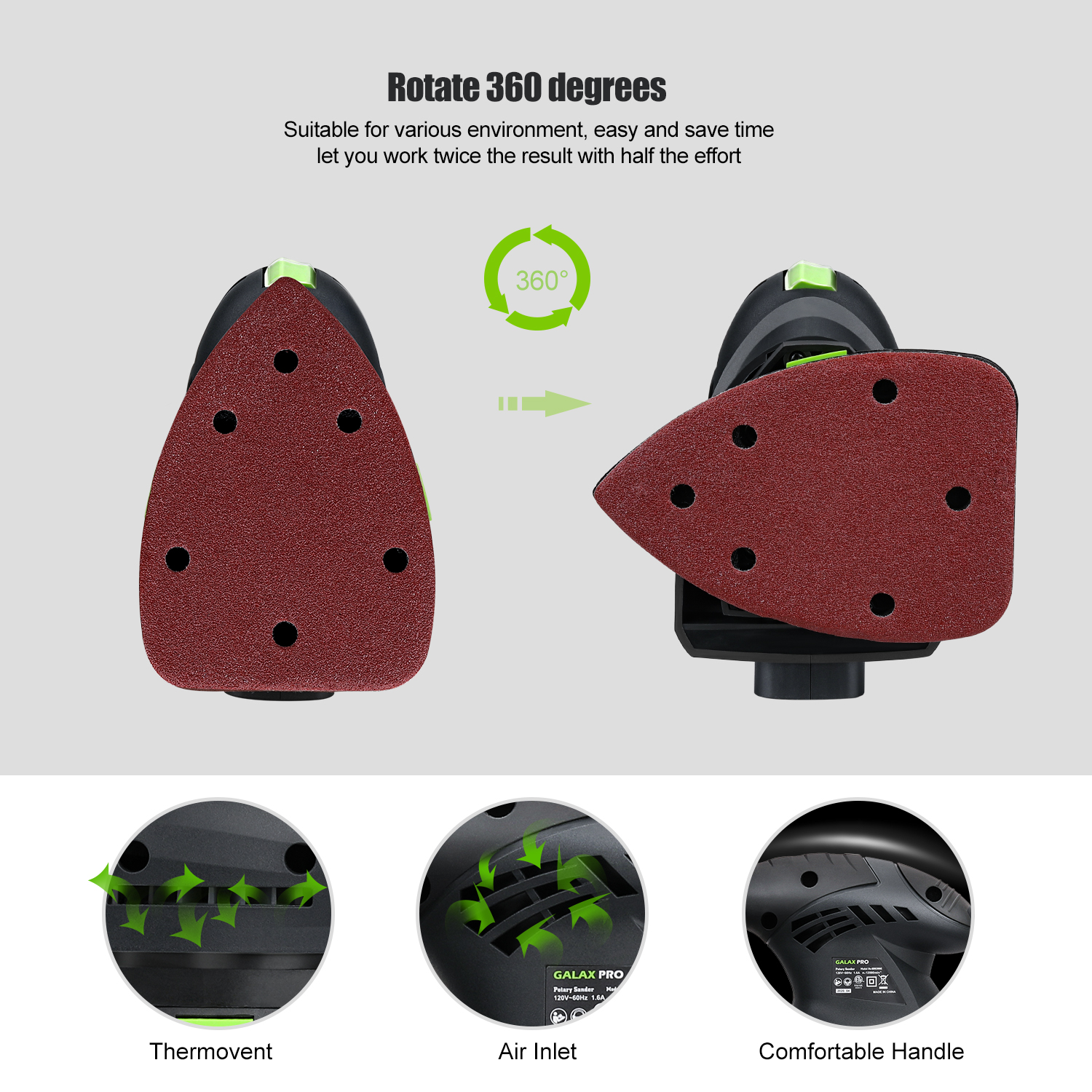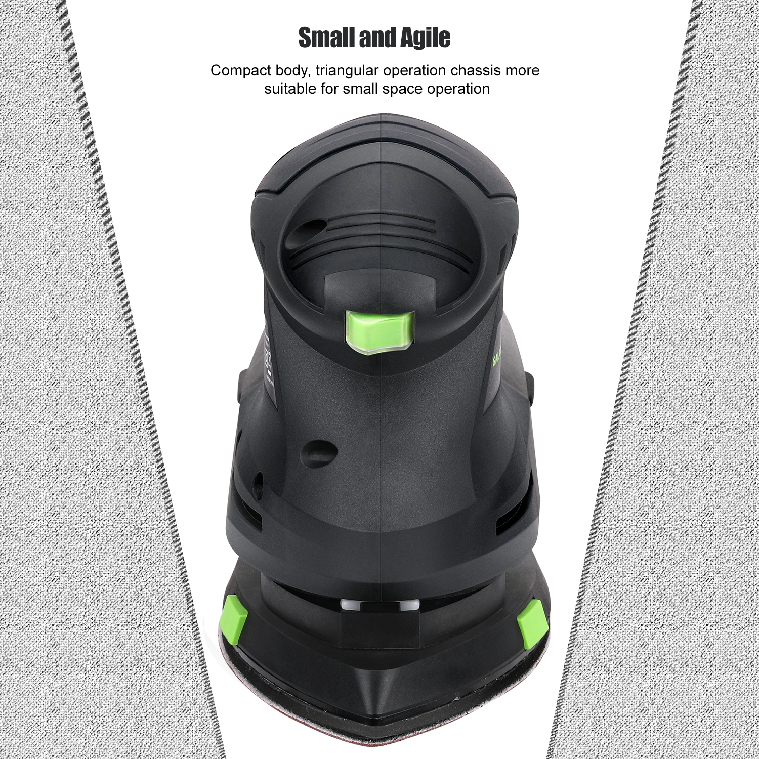 Compact detail sander, suitable for sanding wood, polishing surfaces, buffing rusted materials, and more. Its small, ergonomic design makes it ideal for various tight spaces, while its triangular shape allows for polishing and sanding even in corners.