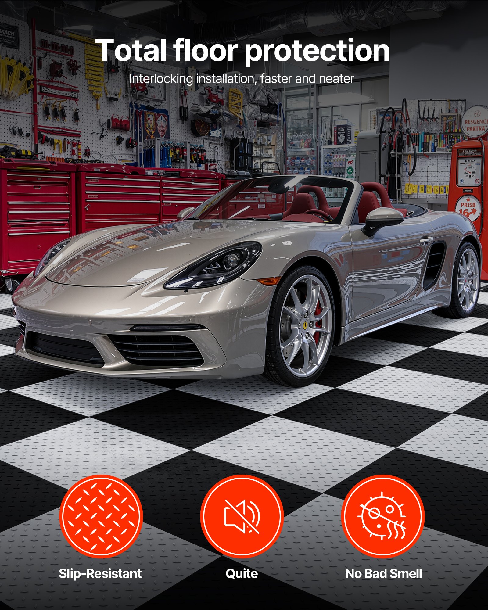 Non-Slip & Quiet: One set of 8 pieces covers 22.7 sq.ft / 2.1 m². These PVC interlocking garage floor tiles reduce slip risks and footsteps noise. No unpleasant smell, ideal for garages, warehouses, or commercial aisles