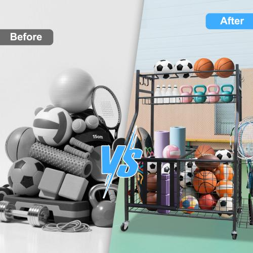 [Multi-functional Storage Rack] 1.Dedicated baseball bat holder: stable anti-tilt side design with extended slots; 2.Top ball rack and metal mesh basket for storing small balls and kettlebells; 3.Two large-capacity storage boxes: convenient for storing basketballs, volleyballs, yoga mats, and other sports equipment; 4.Thickened anti-slip hooks: can be used to hang helmets and other items.