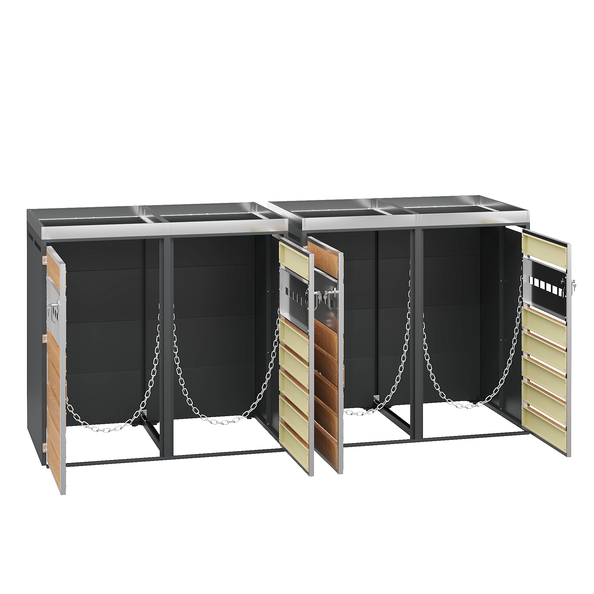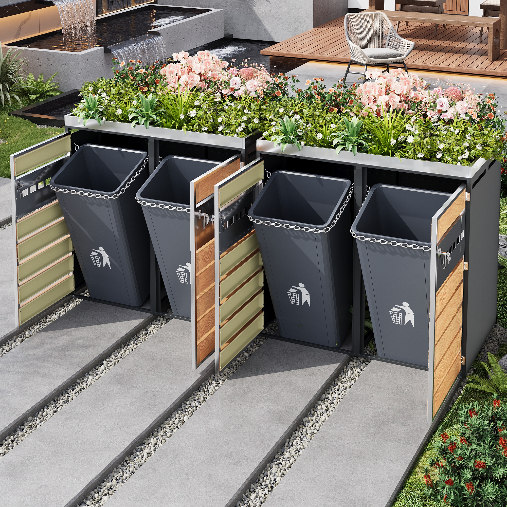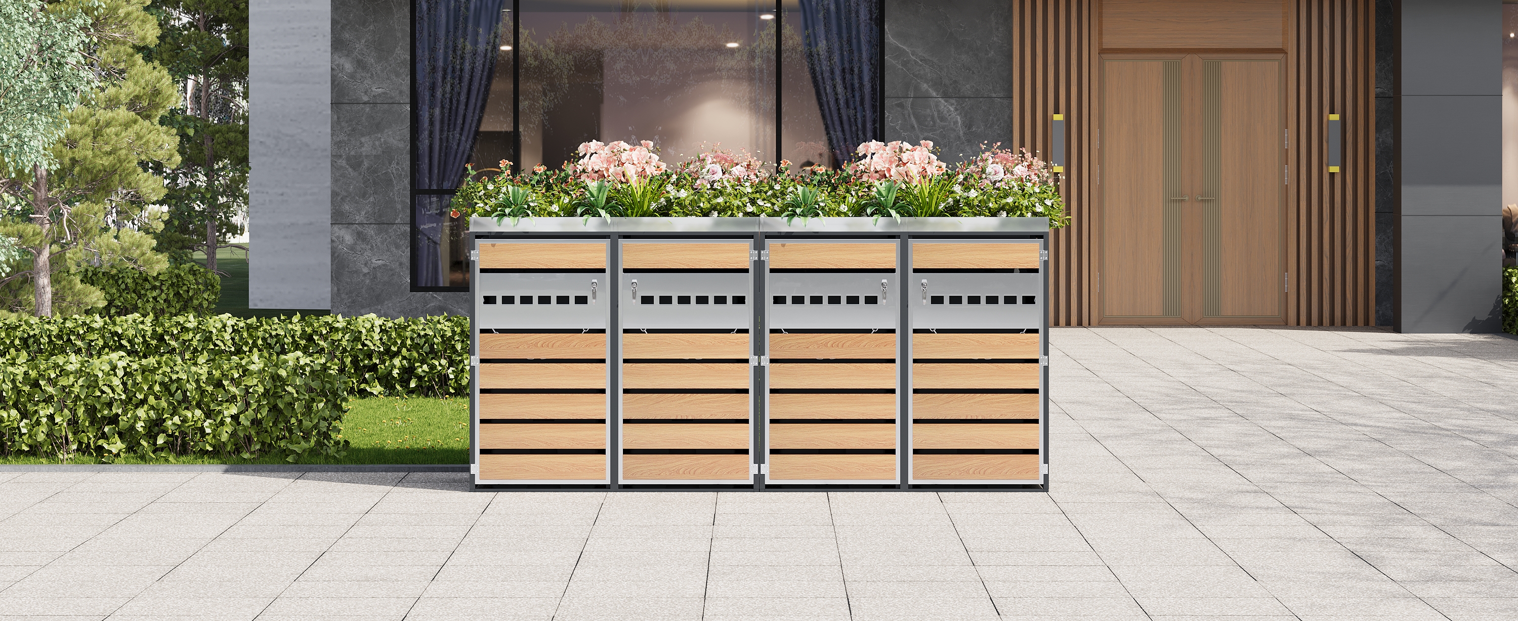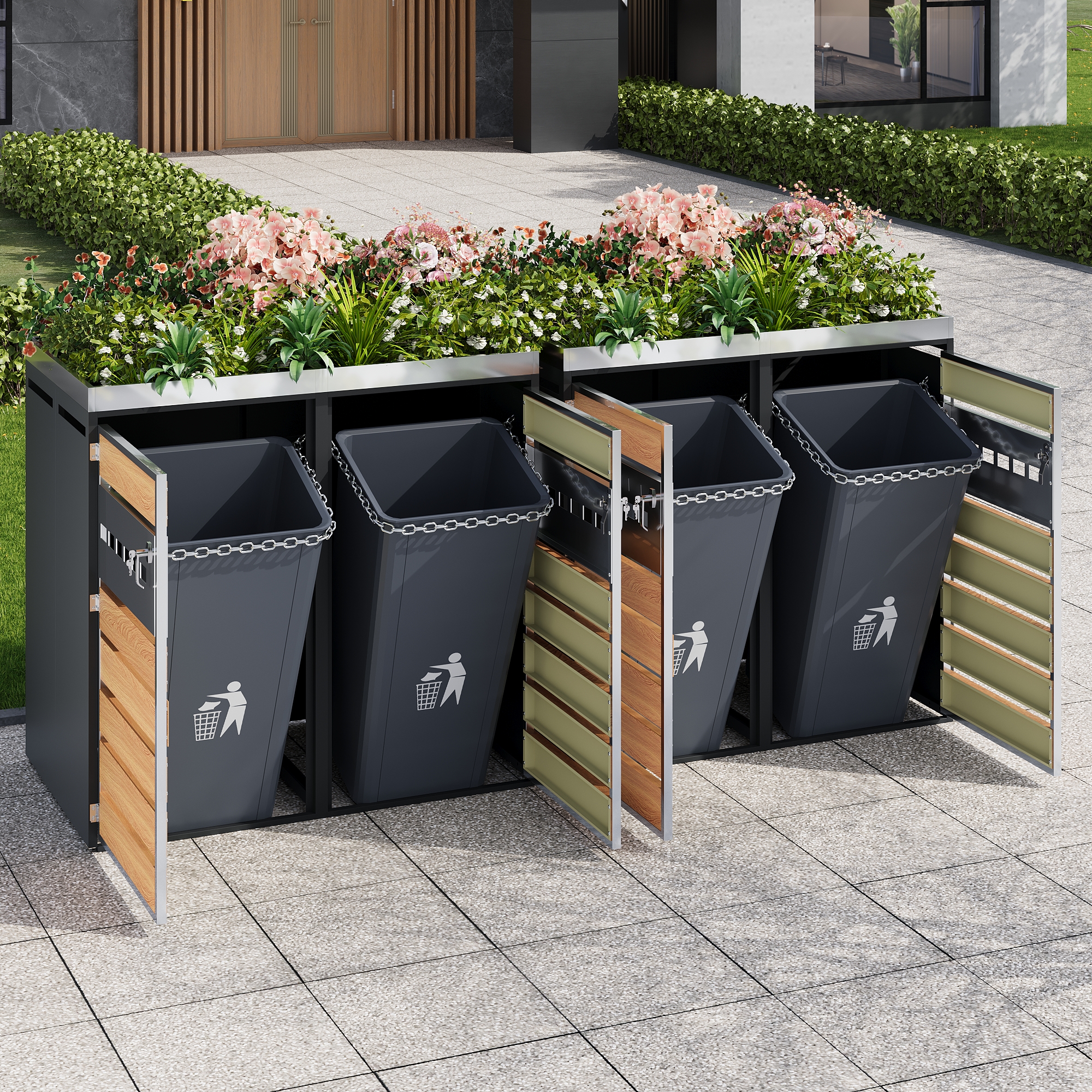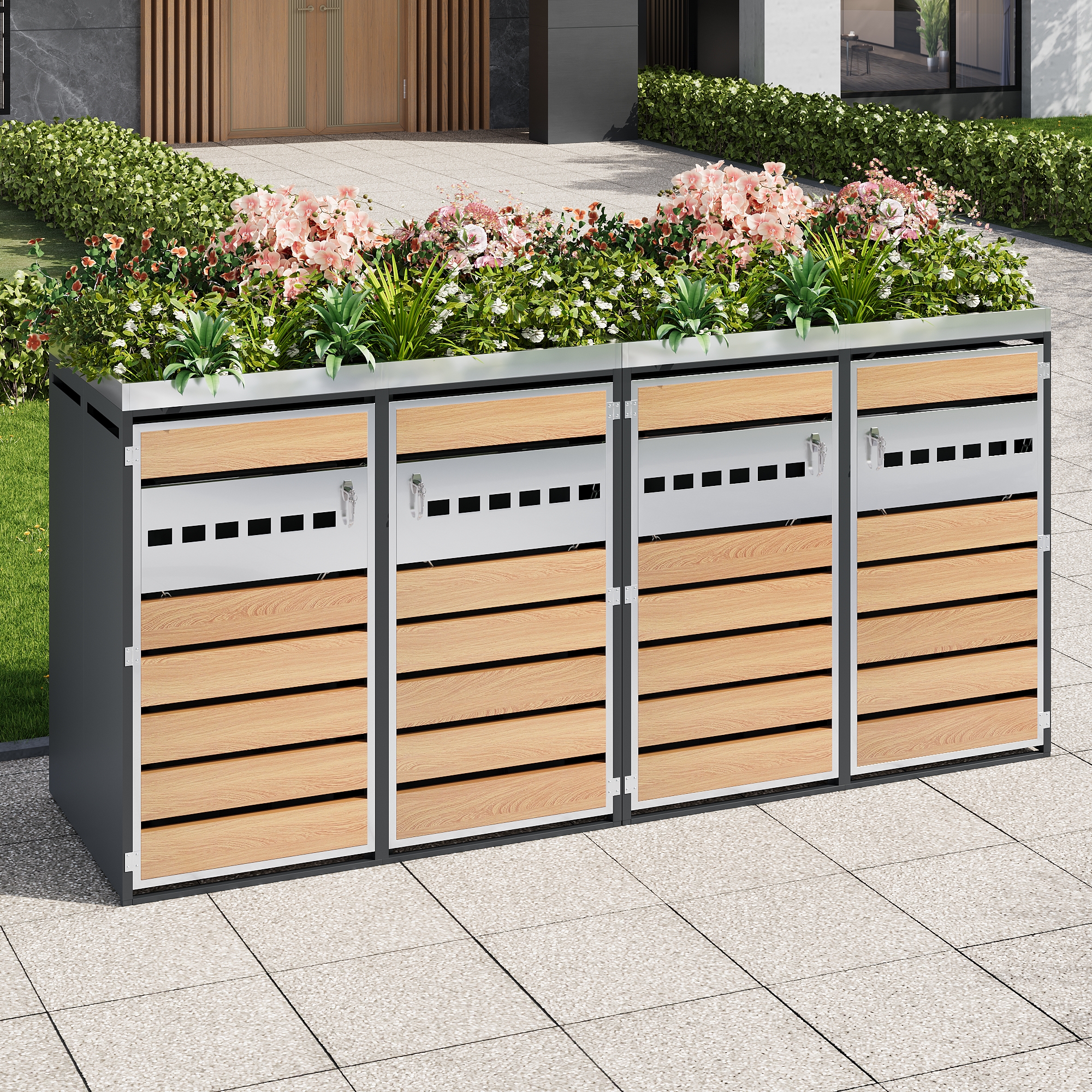 This modular waste bin cabinet with four compartments and an integrated planter features horizontally perforated doors, combining functionality with an attractive design. The four separate compartments offer ample storage space for various types of waste, while the perforated doors ensure ventilation and reduce odors. The body is constructed from thickened, galvanized steel, making it water- and rust-resistant – ideal for long-term outdoor use. Lockable doors with safety stops ensure secure and convenient access. Thanks to its simple yet elegant design and robust, durable construction, it is the perfect choice for making yards, gardens, and public outdoor spaces cleaner and more attractive.