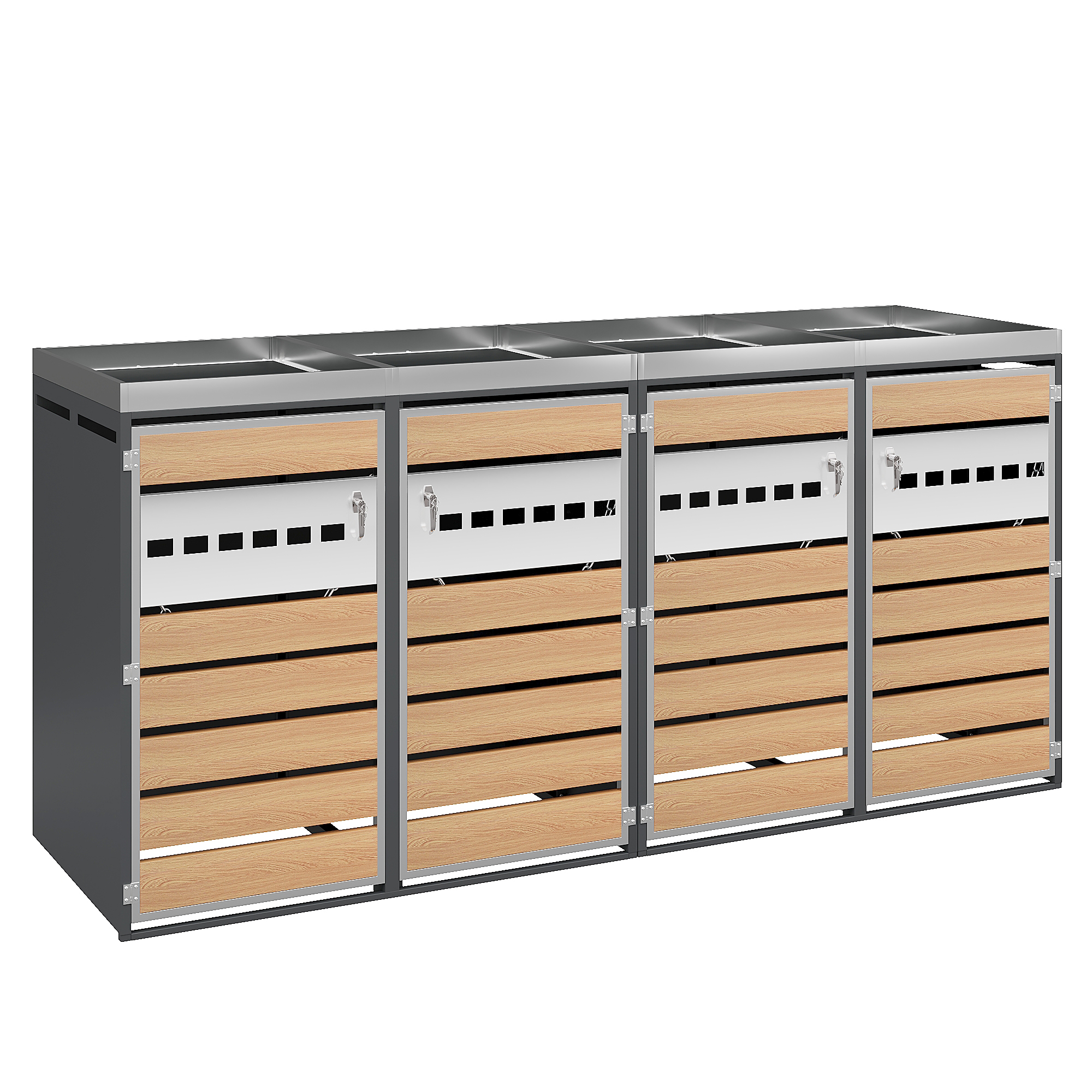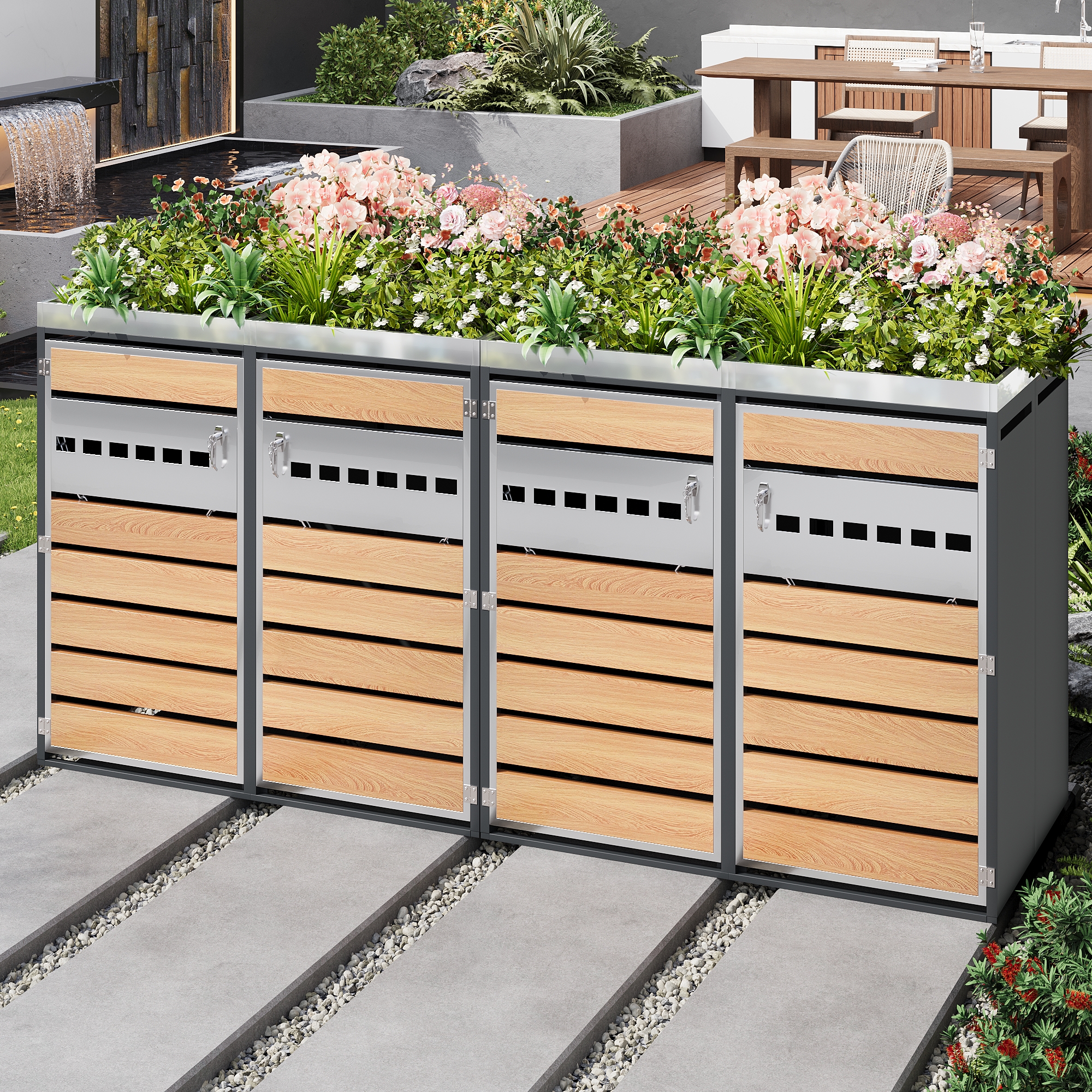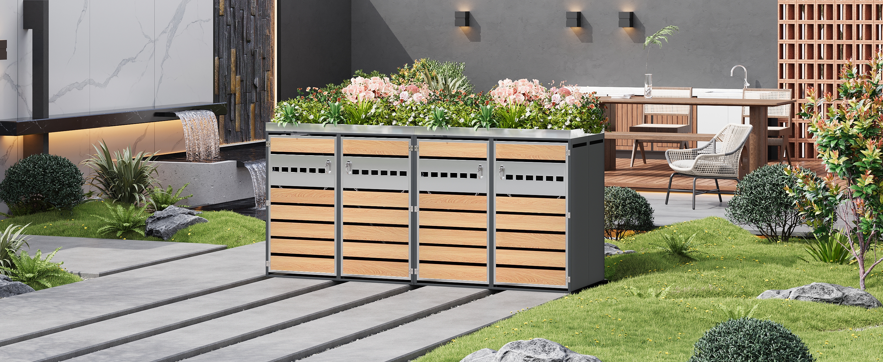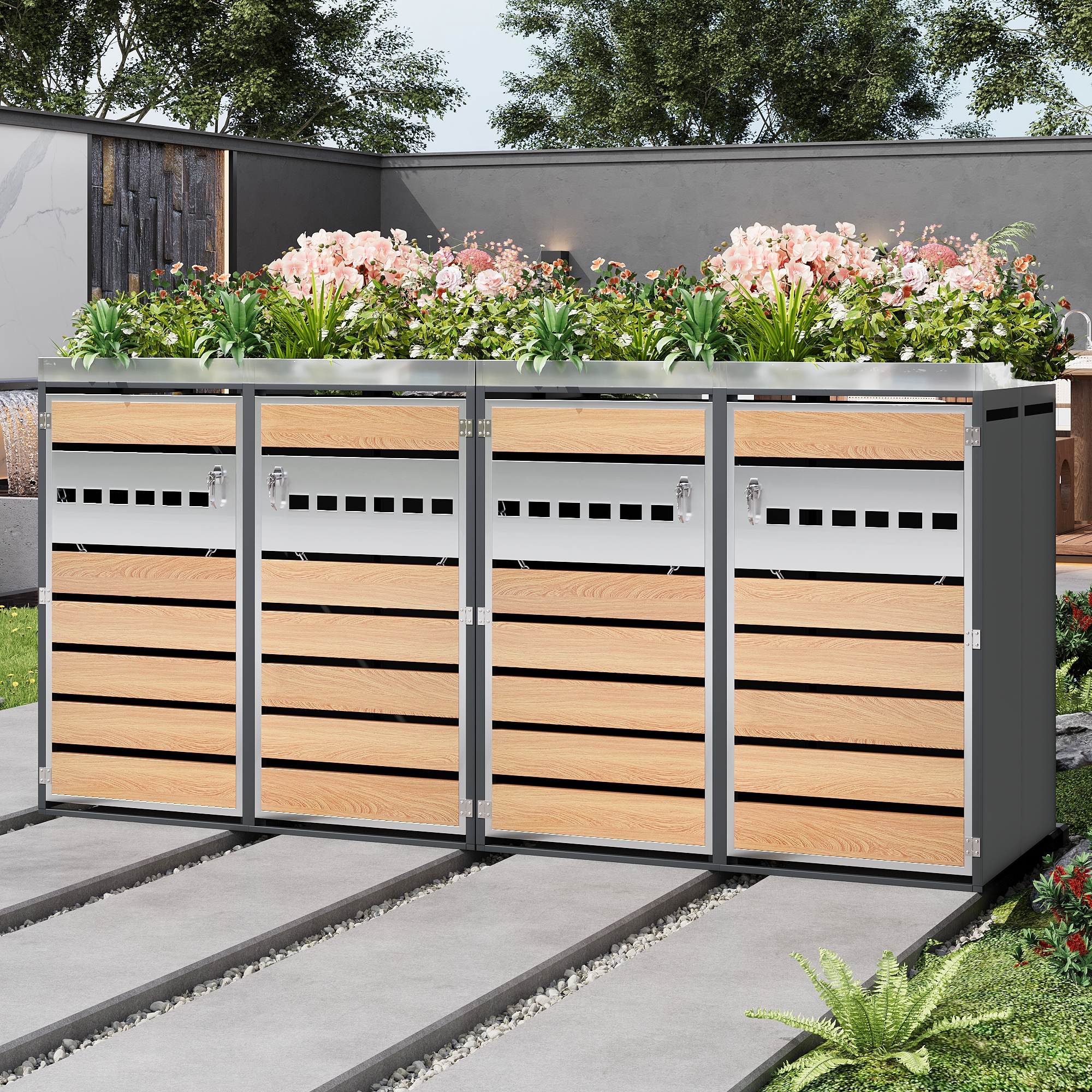 1. Integrated planter in the upper section for houseplants 2. Horizontally perforated door front, simple and elegant design 3. Perforated ventilation to reduce odors 4. Four-unit combination for ample storage space and versatile organization 5. Galvanized steel construction, rustproof, weather-resistant, and durable 6. Separate, lockable cabinet doors for added security and stability 7. Suitable for various outdoor areas