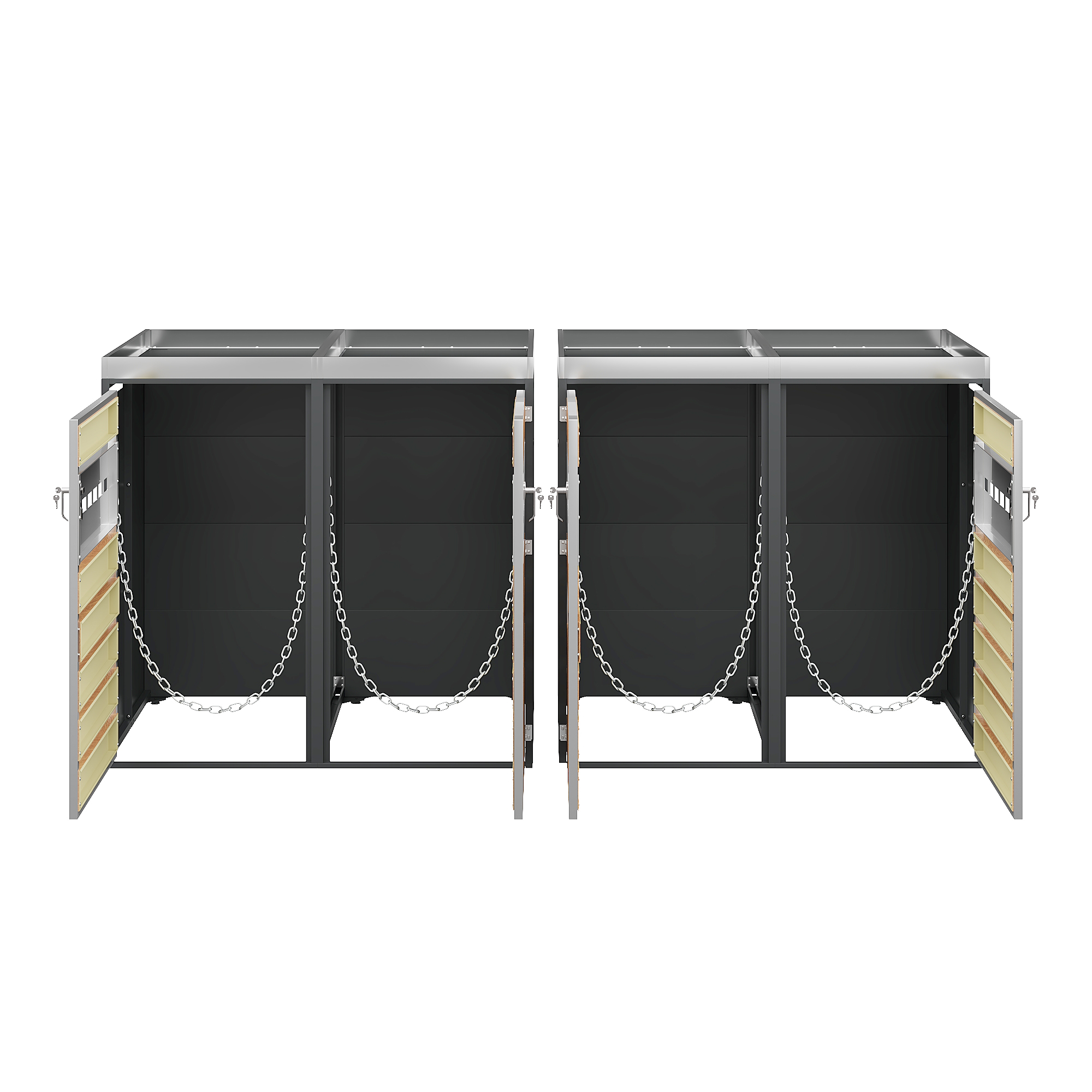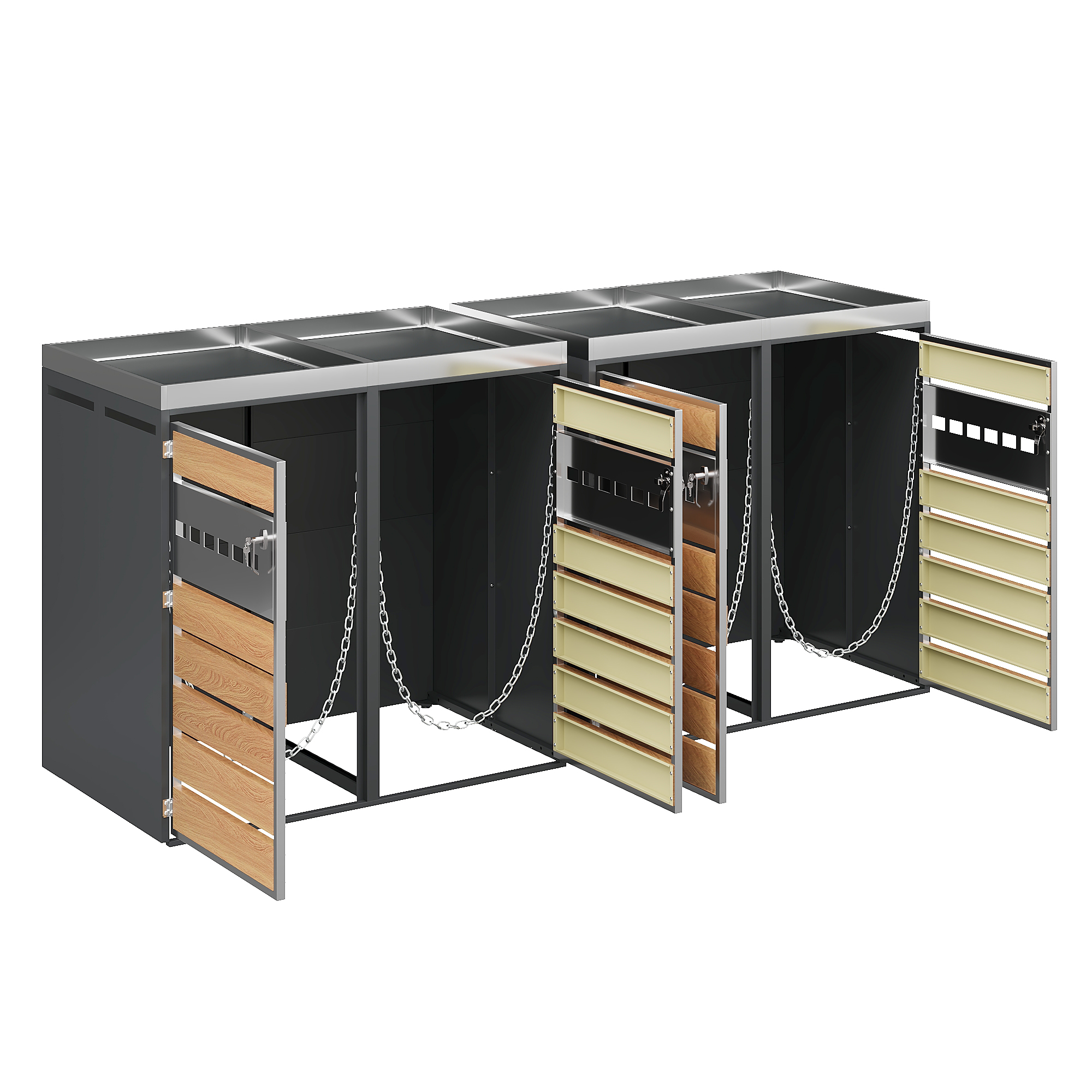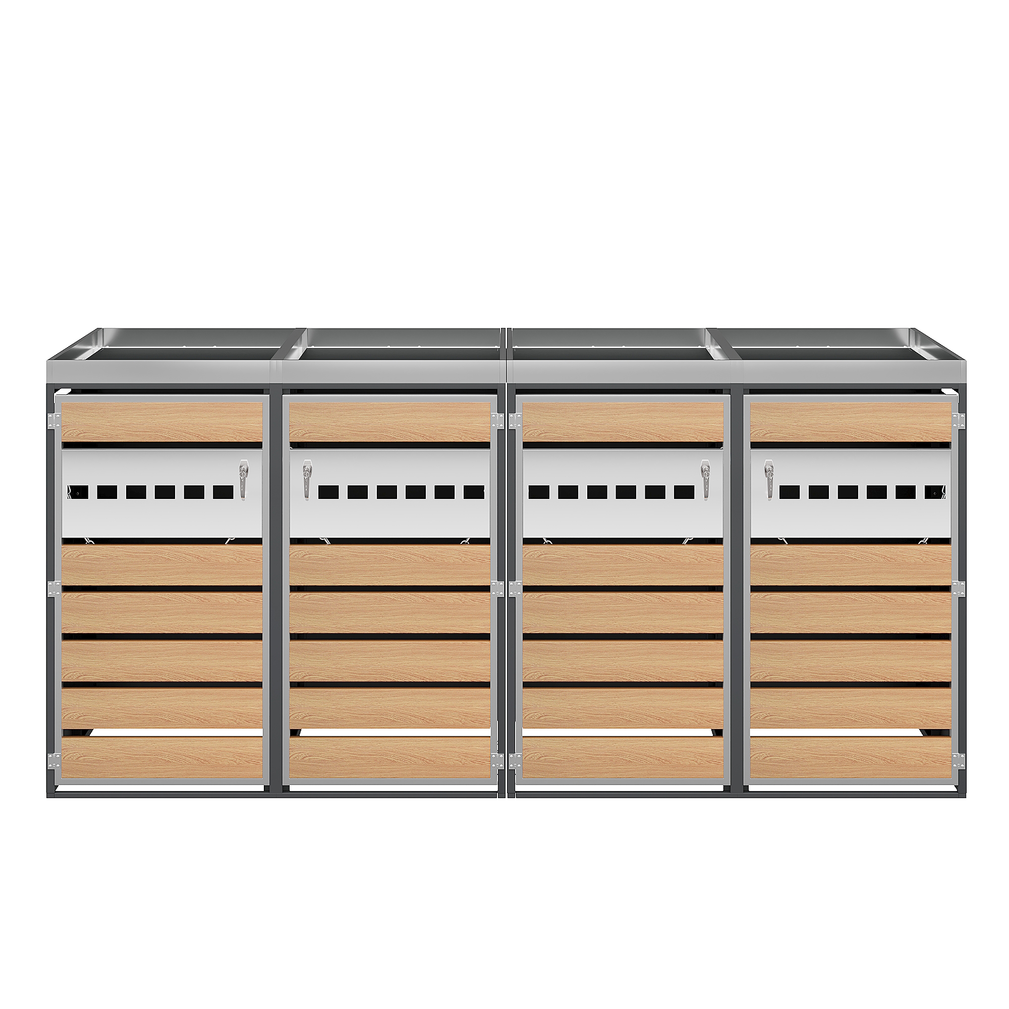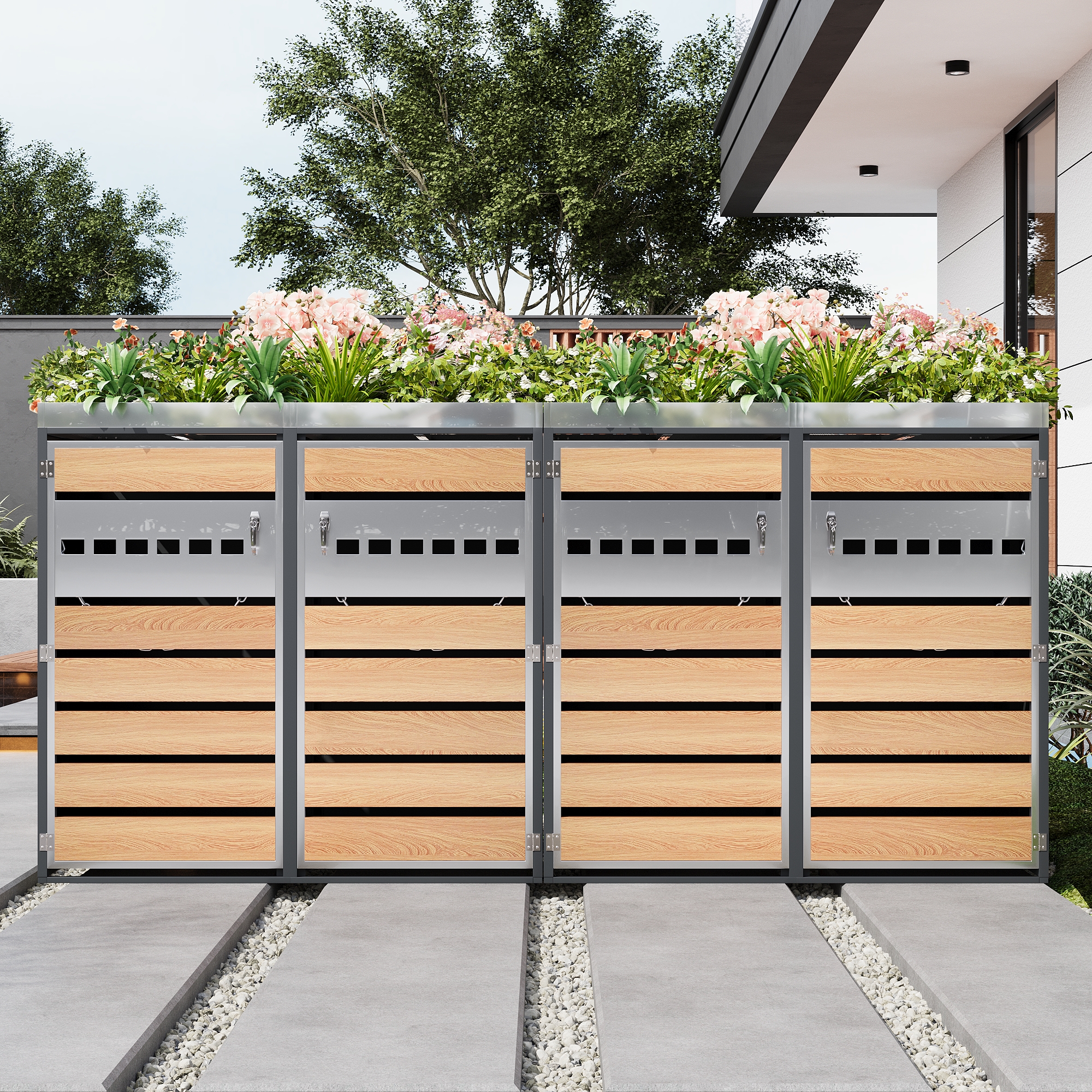 1. Integrated planter in the upper section for houseplants 2. Horizontally perforated door front, simple and elegant design 3. Perforated ventilation to reduce odors 4. Four-unit combination for ample storage space and versatile organization 5. Galvanized steel construction, rustproof, weather-resistant, and durable 6. Separate, lockable cabinet doors for added security and stability 7. Suitable for various outdoor areas