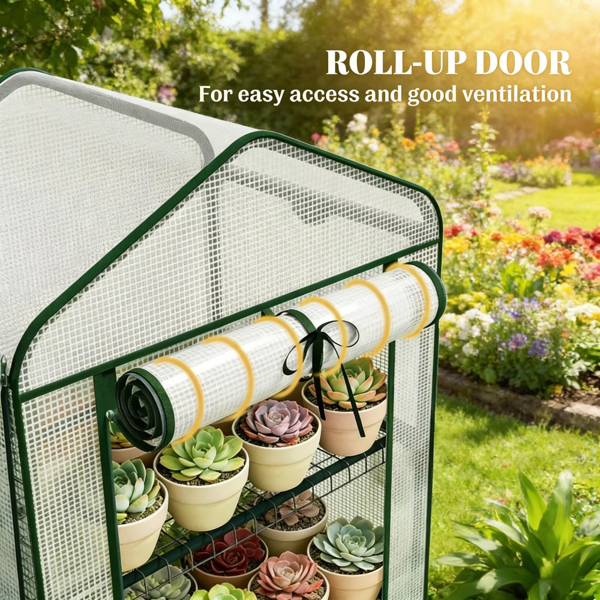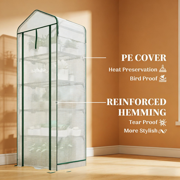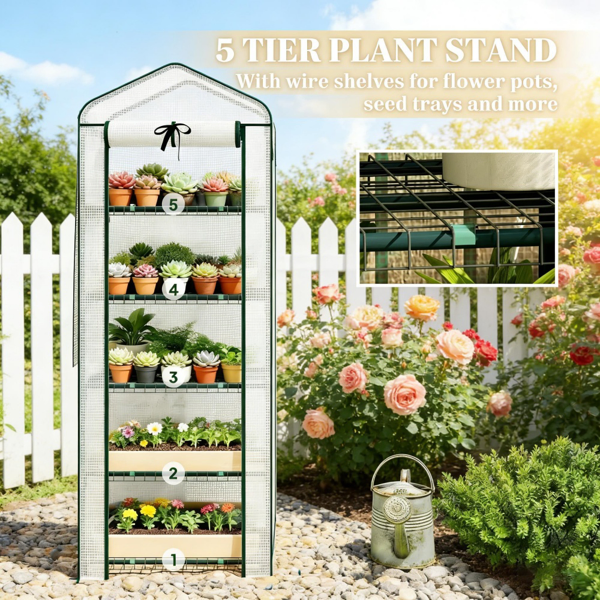 Features: - Double-layer roof design enhances ventilation and blocks small animals - Five-tier plant shelf increases space for healthy plant development - 140 gsm PE cover shields plants from UV and enhances longevity - Roll-up zippered door ensures easy entry and optimal ventilation - Powder-coated steel frame offers robust, stable support - Overlong cover to bury into the ground for seal and stability - Place heavy objects in the bottom side bags to increase stability - Easy assembly Specification: - Color: White, Dark Green - Material: 140 gsm PE, Steel - Overall Dimension: 27.6" W x 19.7" D x 75.6" H - Door Dimension: 20.5" W x 63.8" H - Window Dimension: 38.6" W x 19.3" D - Wire Shelf Dimension: 24.4" W x 17.7" D x 12.2" H - Side Bags Size: 19.7" W x 8.3" D - Edging Width: 3.9" - Weight Capacity Per Shelf: 22 lbs - Wind Resistant Level: 4 (17.5 mph), please don't leave it in stronger winds - For Assembly: 1-2 people recommended