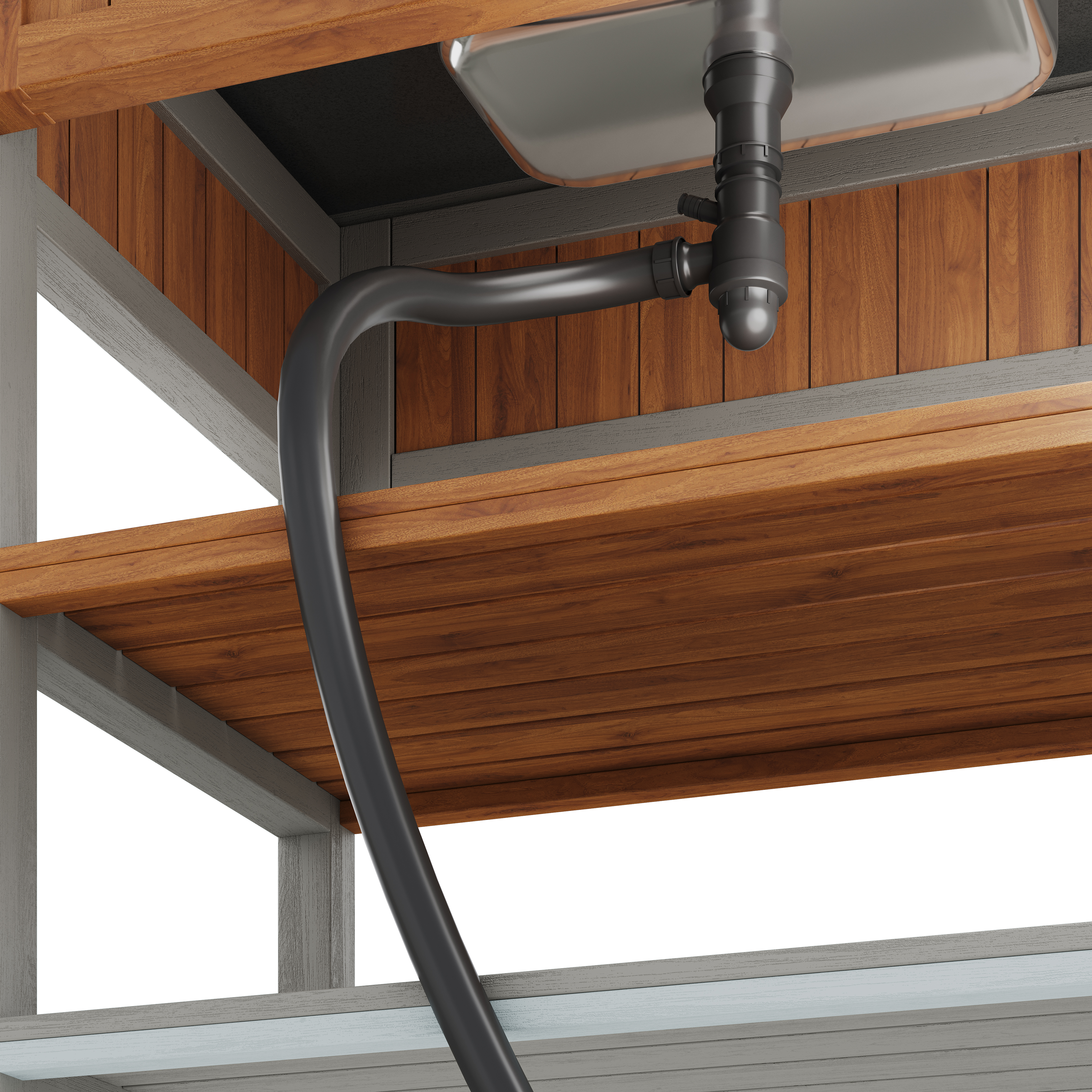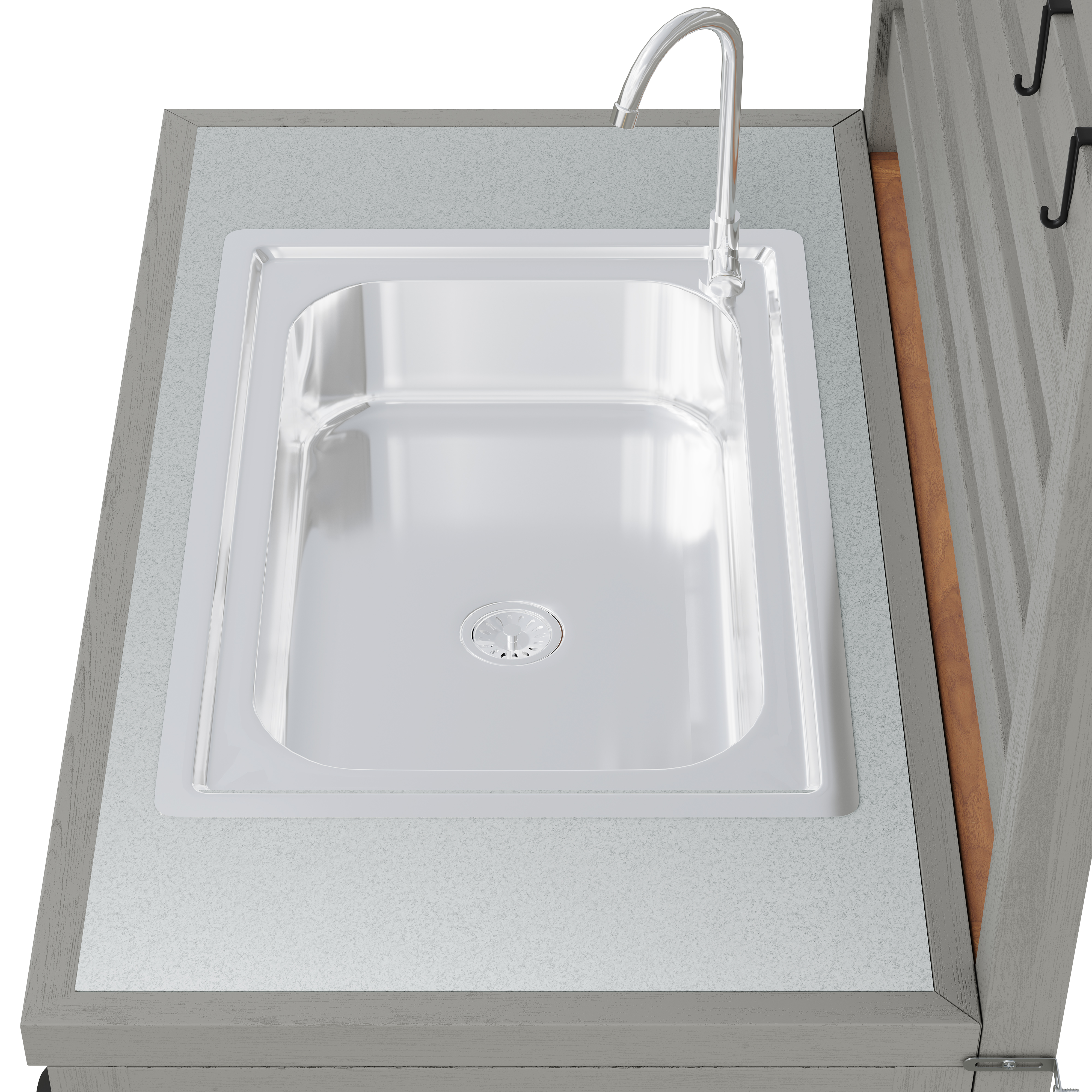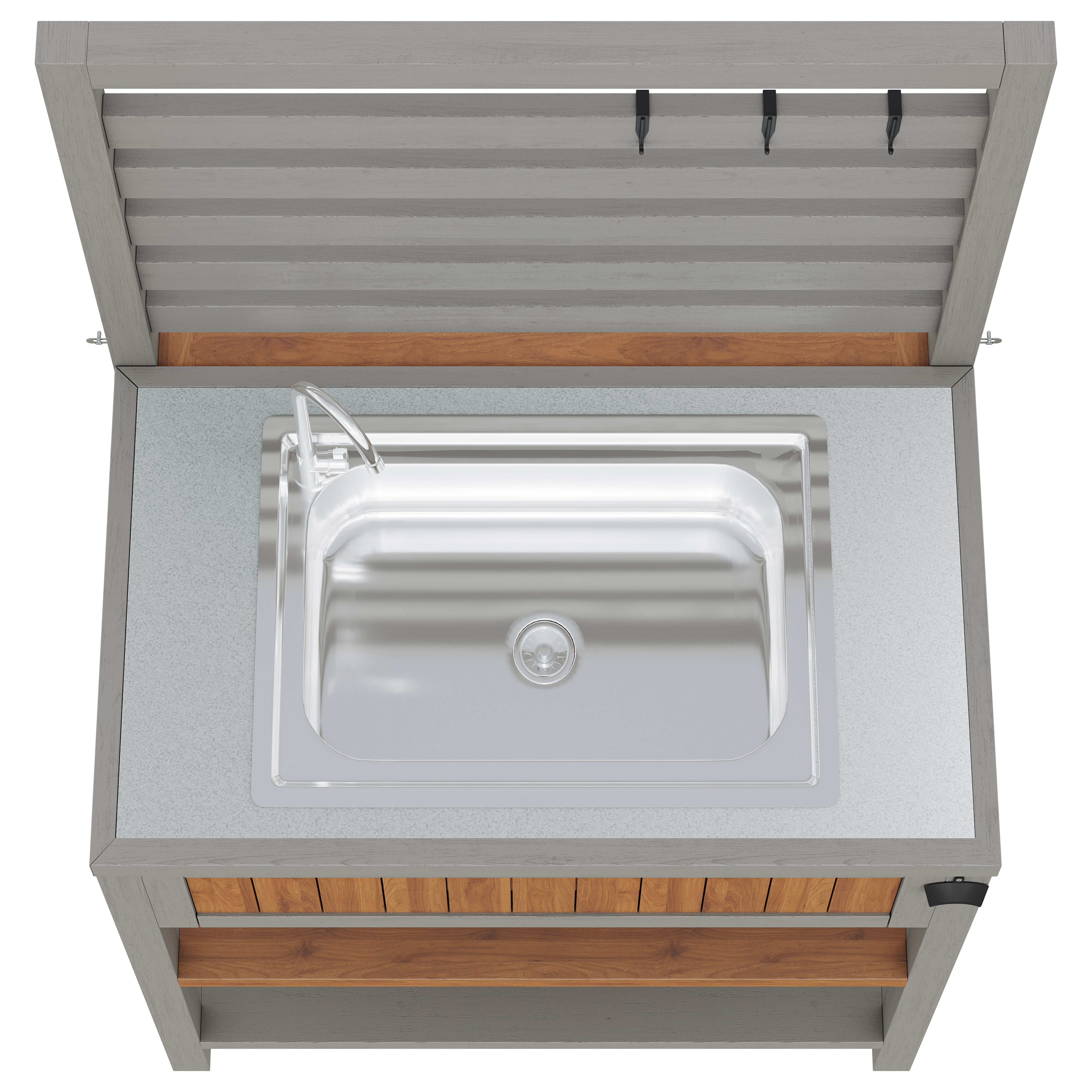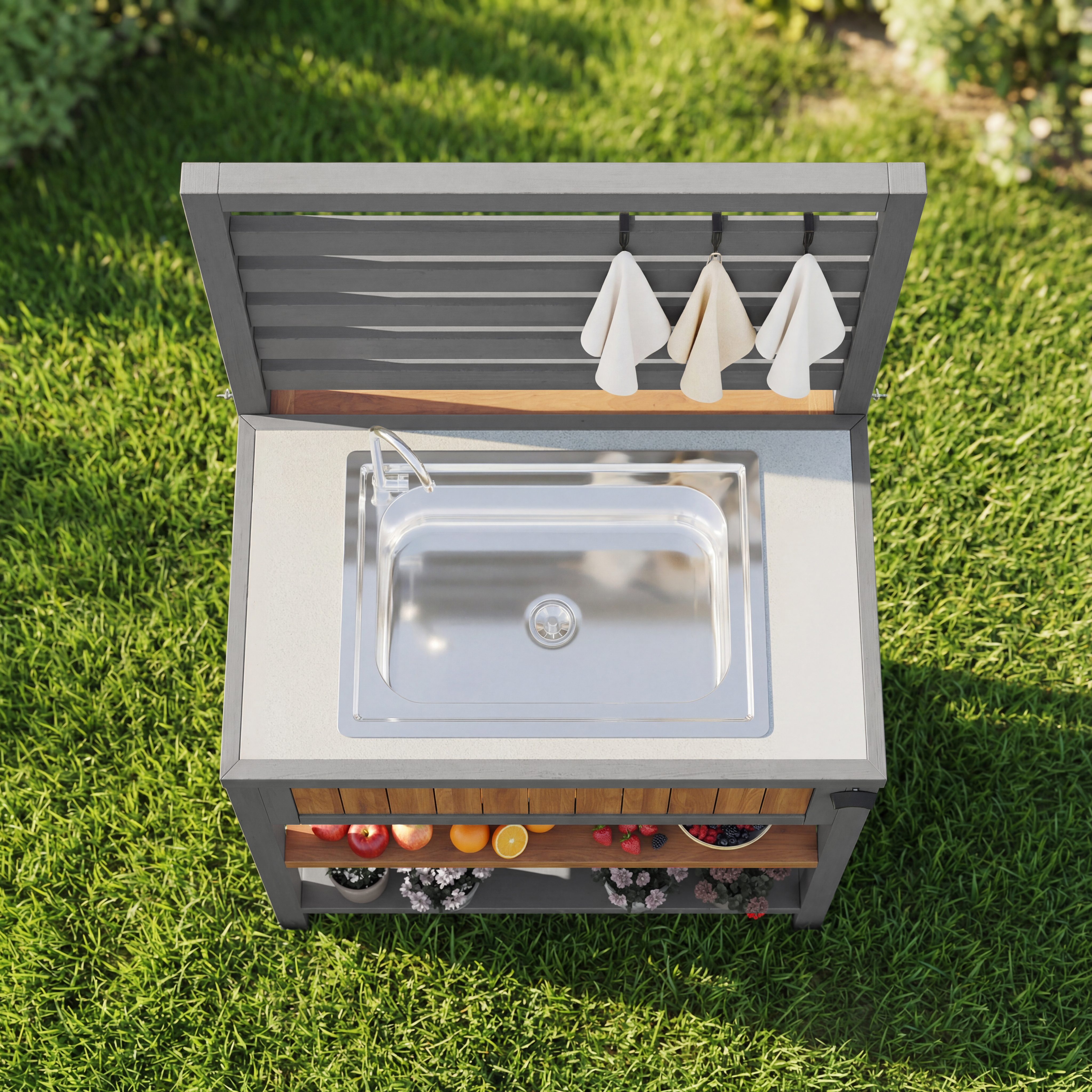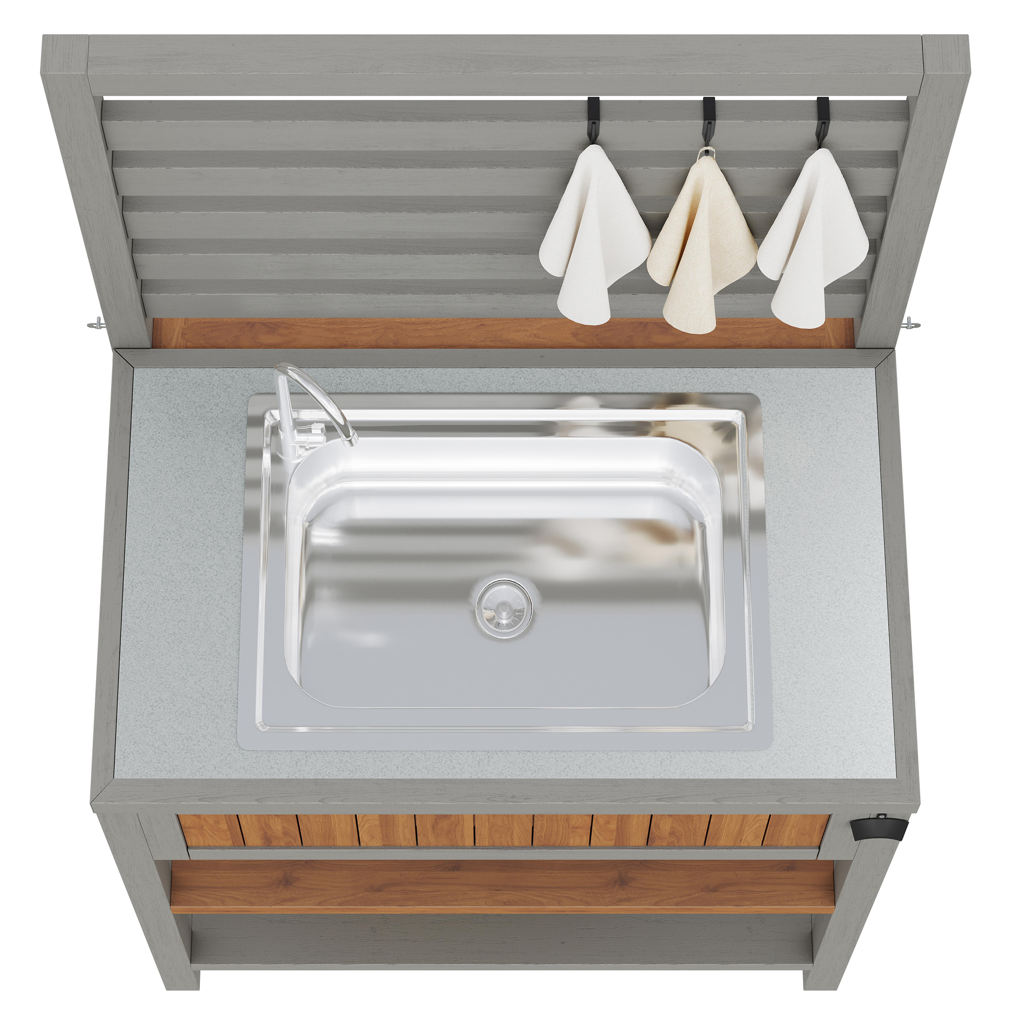 The integrated drying basin with a water connection allows for easy flow control—ideal for cleaning food and dishes. A convenient bottle opener on the side makes it easy to open beverage bottles at parties and outdoor events. Three hooks and a two-tiered shelf make optimal use of vertical space and provide room for towels, tools, and small items.
