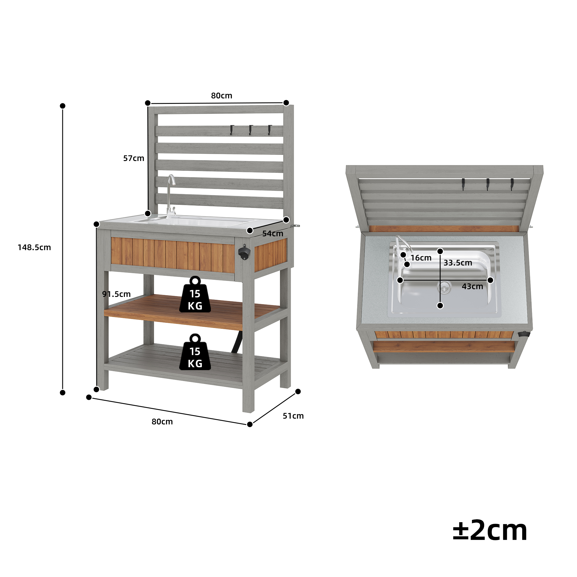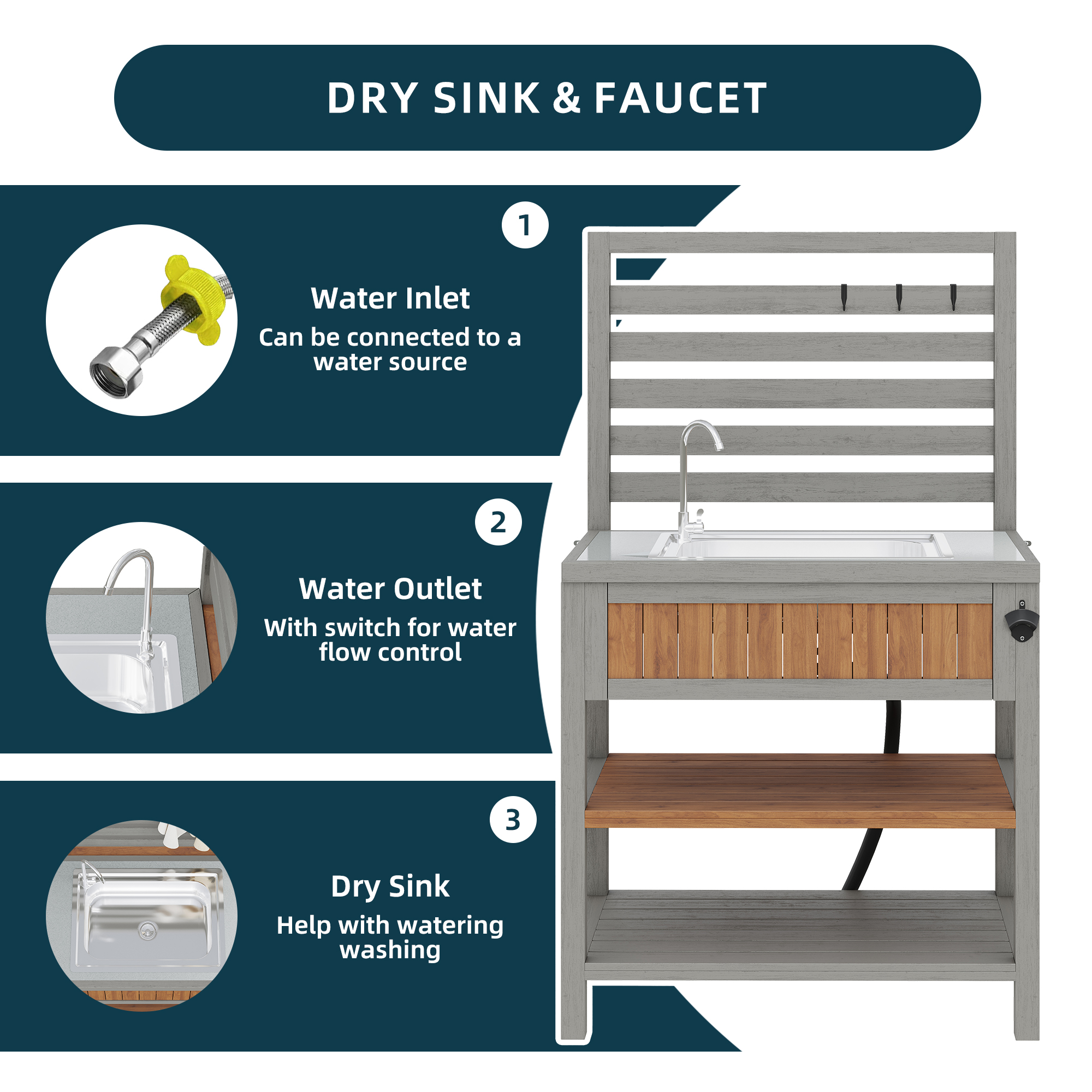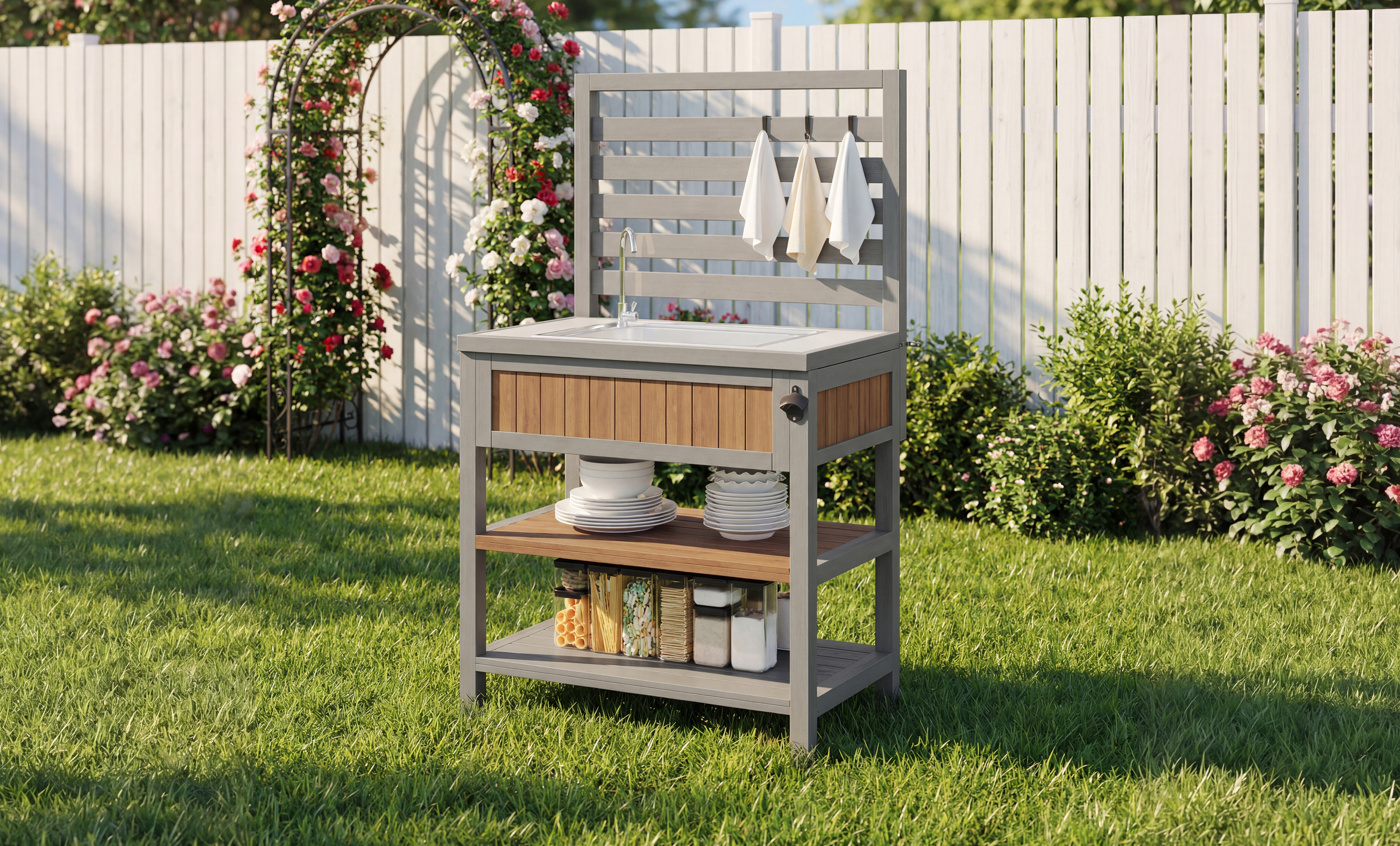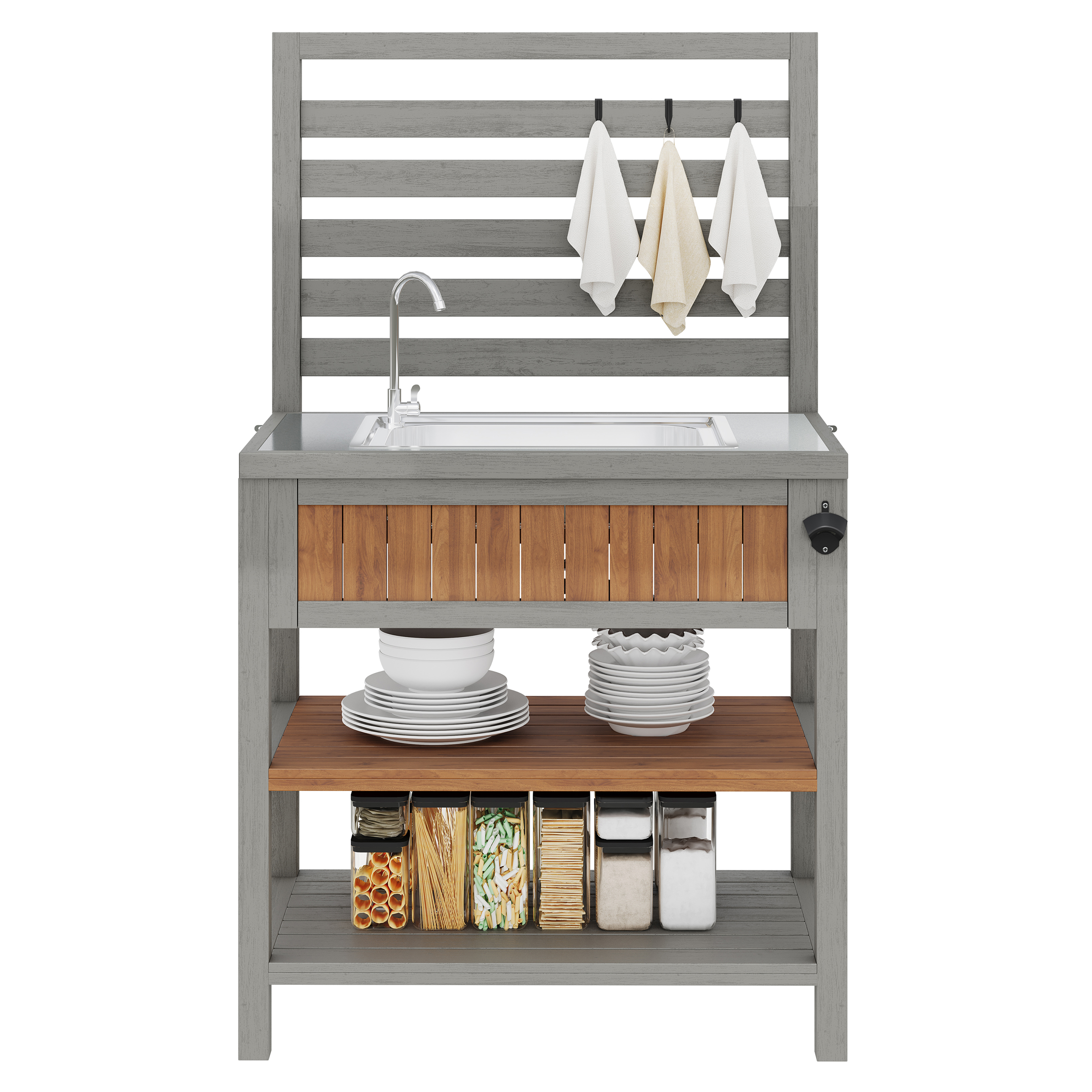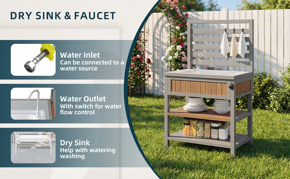Product Name:Garden cabinet with water basin & tap and integrated bottle opener – weatherproof tool cabinet with large work surface & drawer, grill station with adjustable shelves, outdoor kitchen cabinet