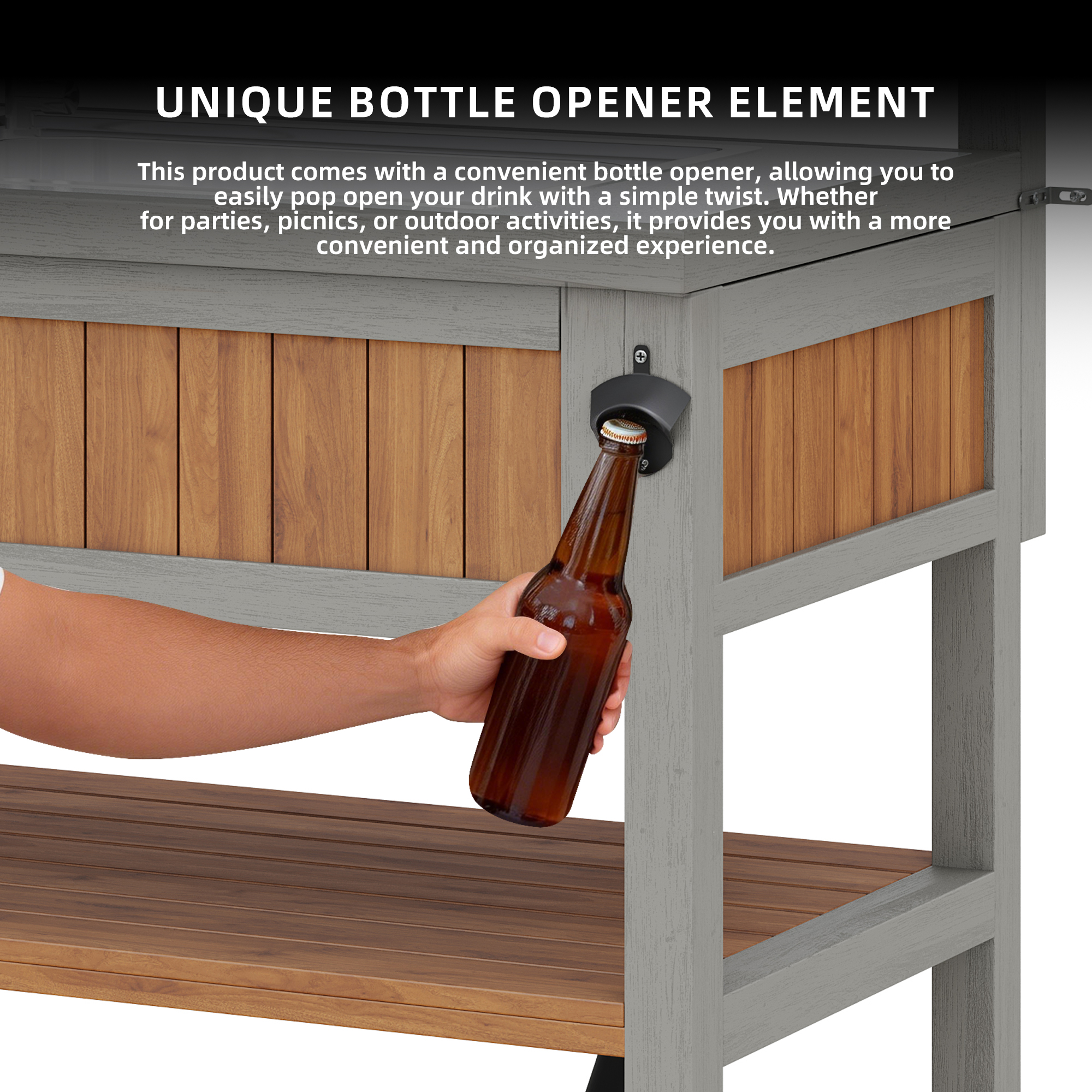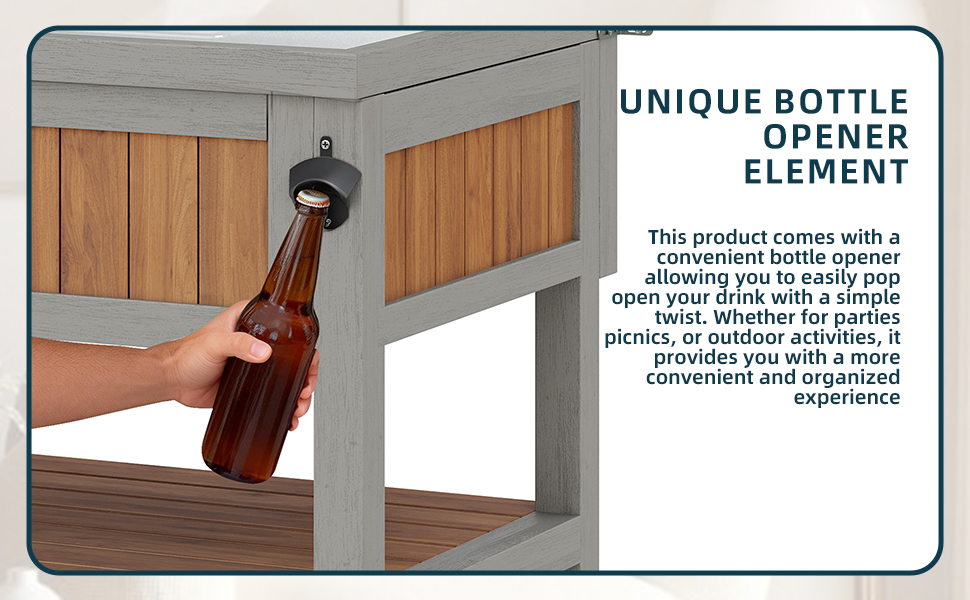 • Convenient Integrated Bottle Opener: A handy bottle opener is located on the side of the cabinet, opening bottles with a simple twist. Ideal for parties, picnics, or outdoor events – for added convenience and organization.
