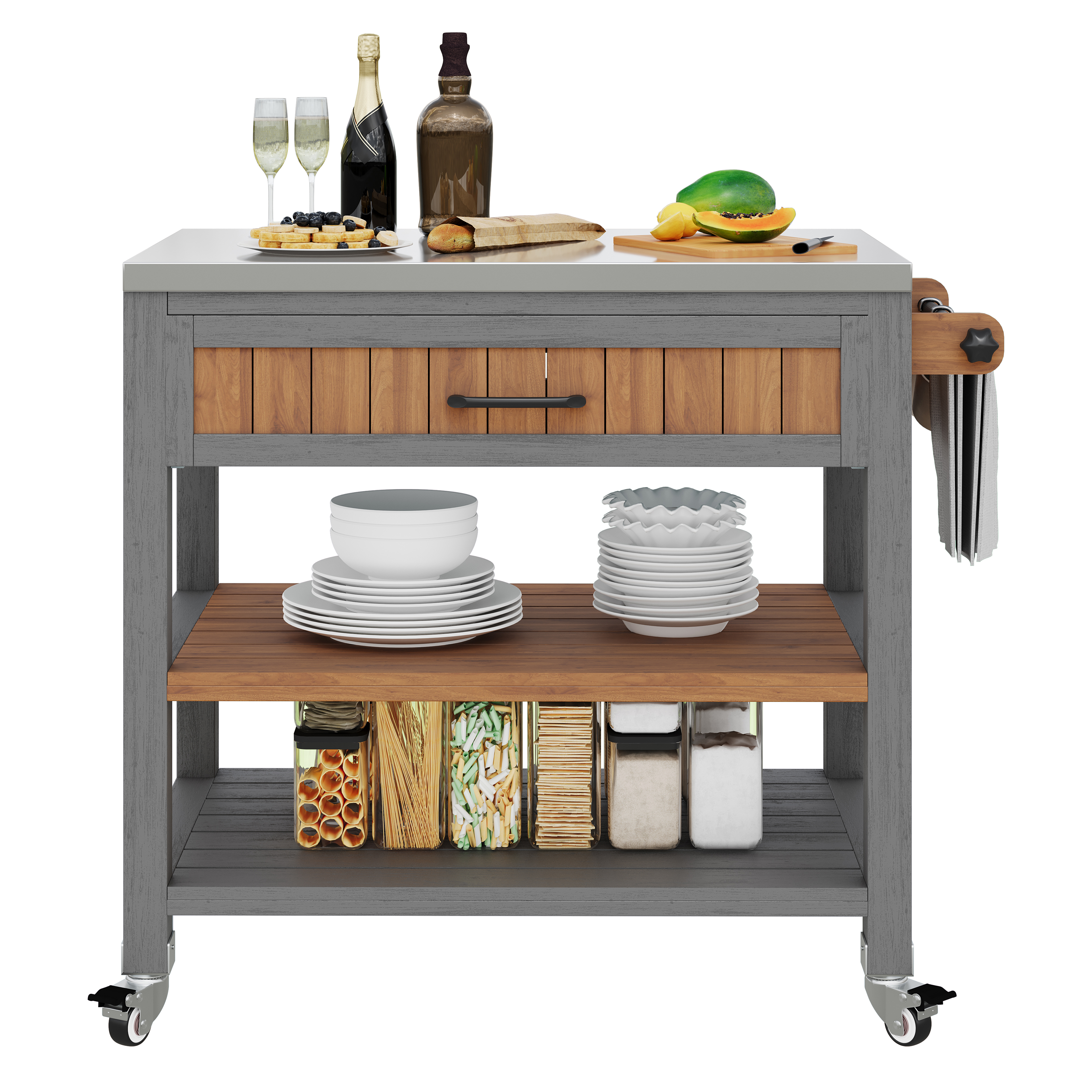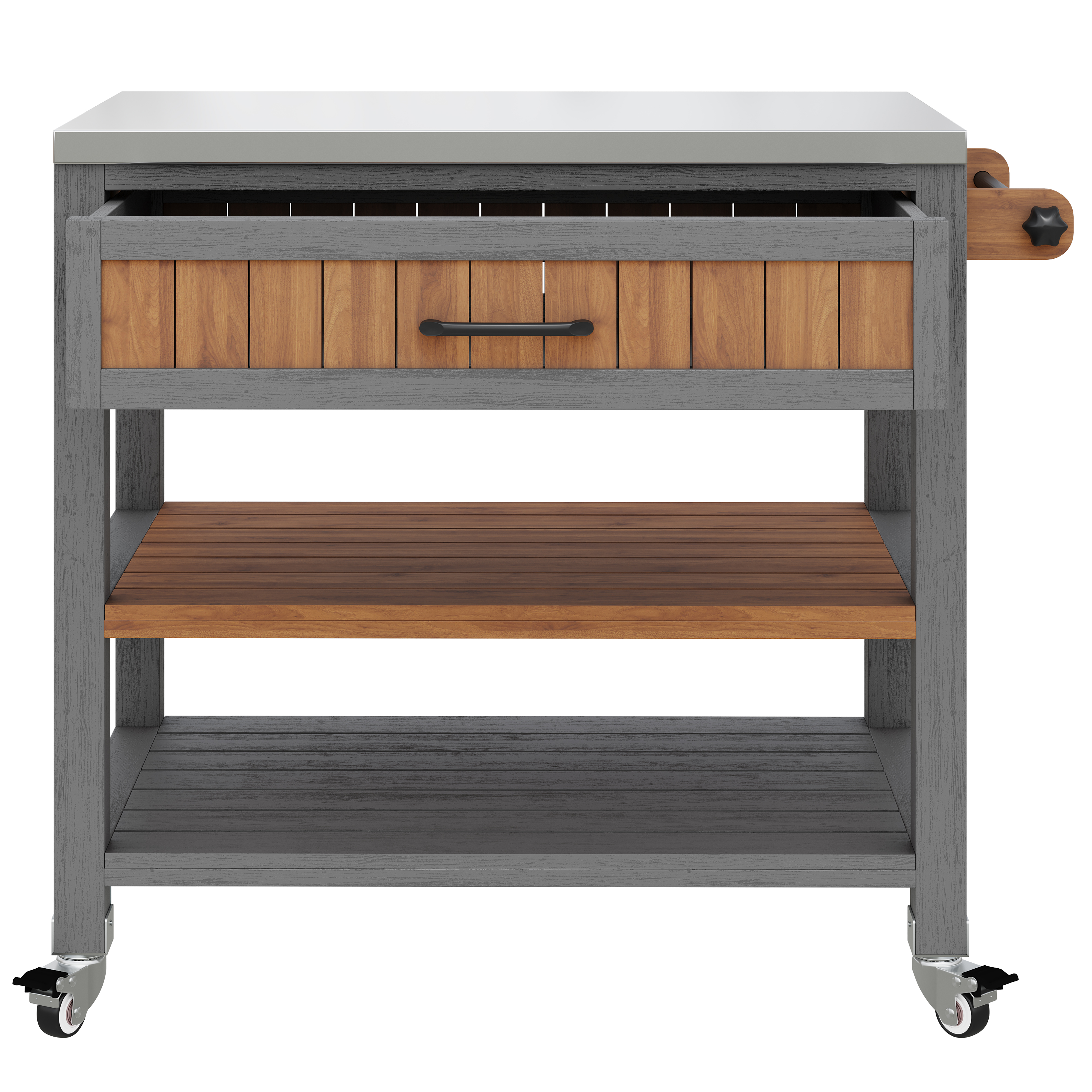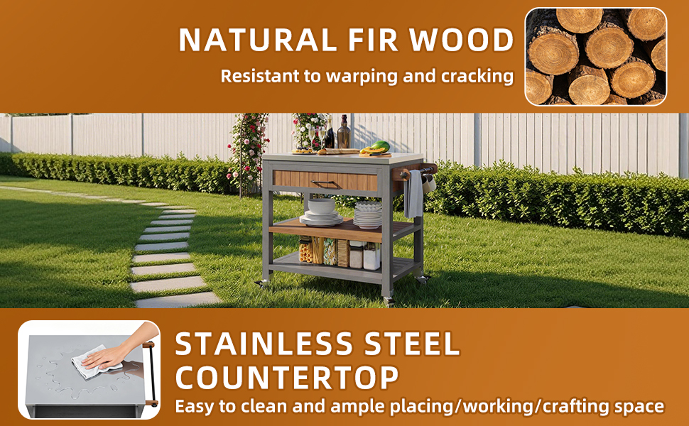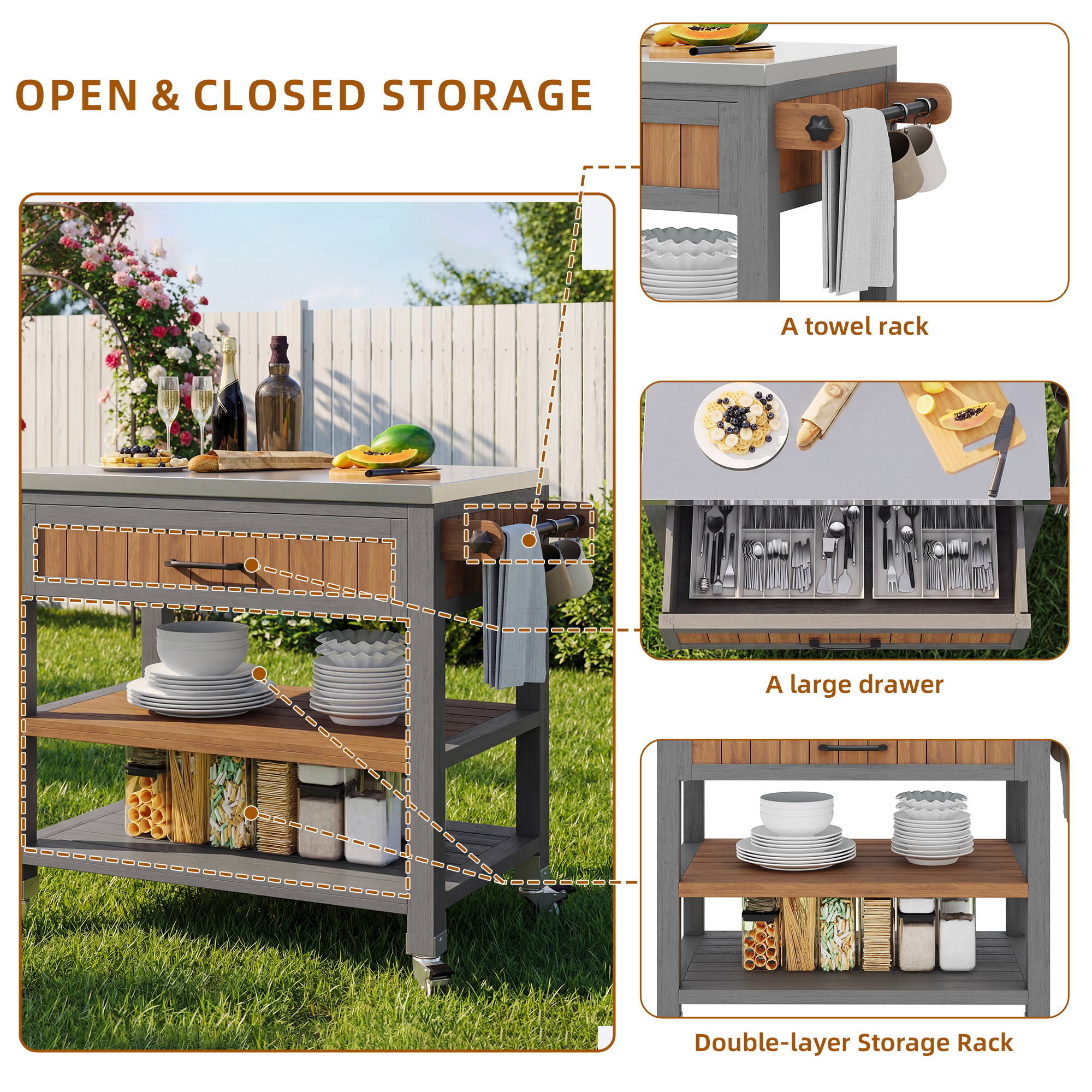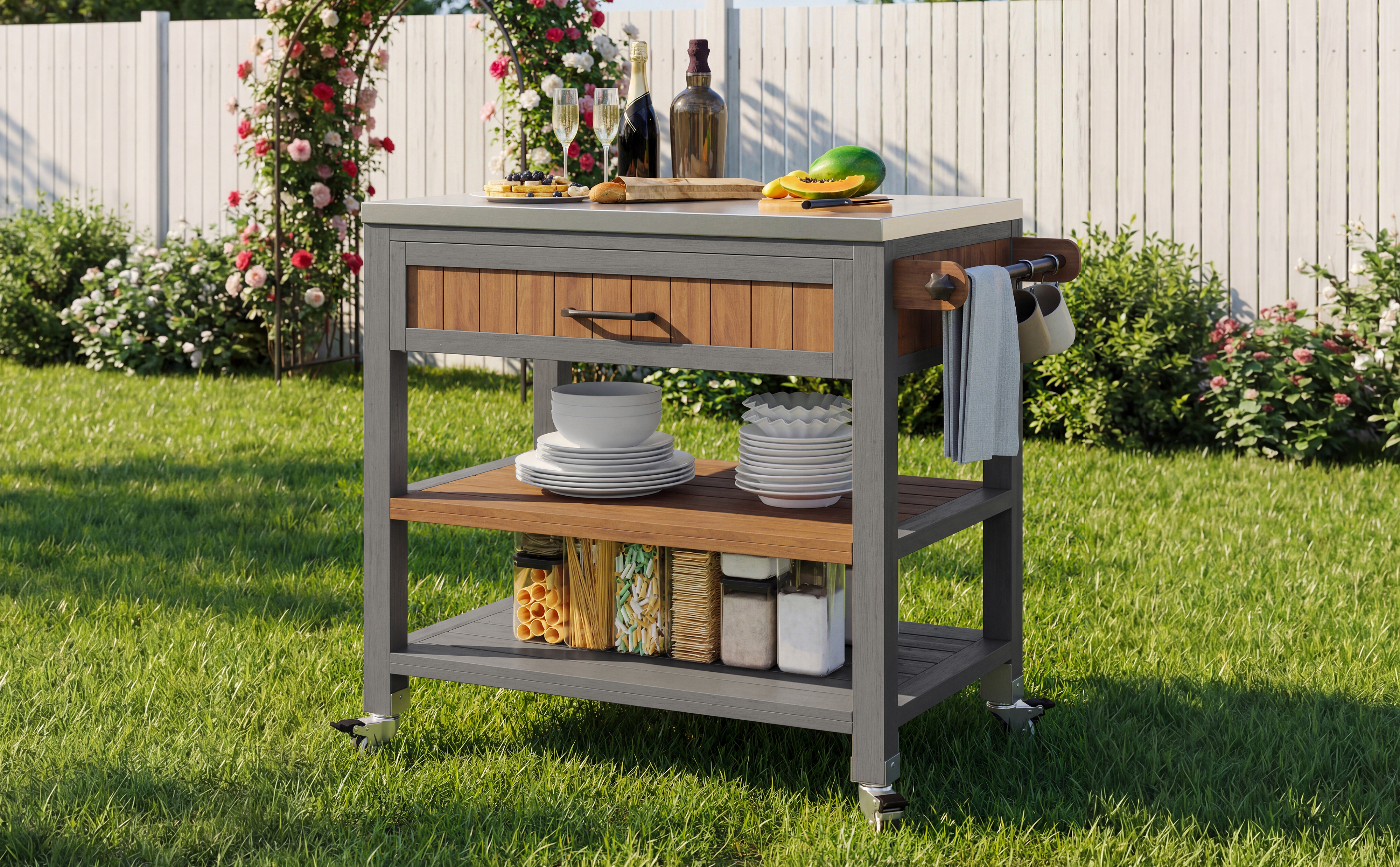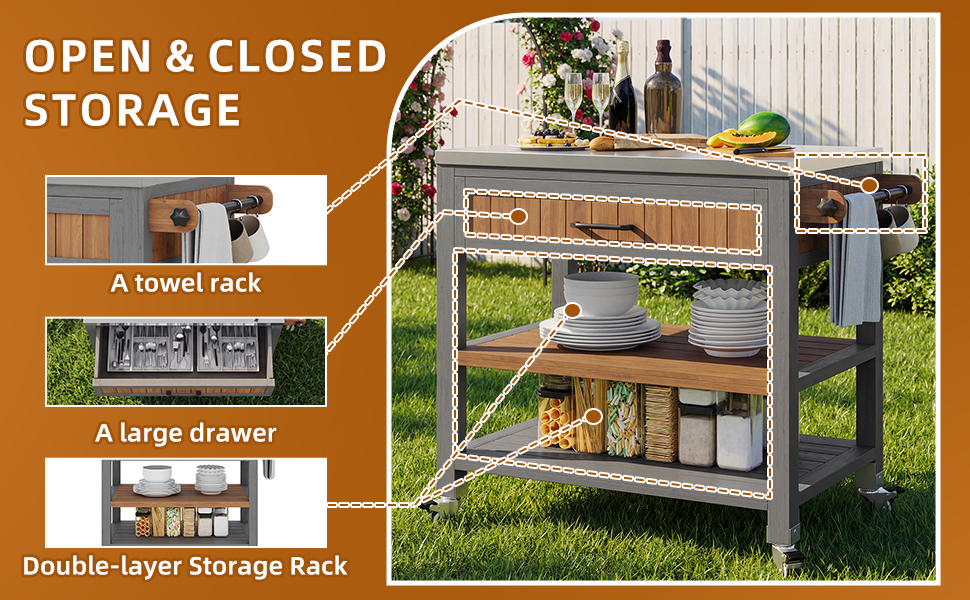 Product Name:Garden cabinet with wheels and stainless steel worktop – Mobile tool cabinet with drawer and shelf, weatherproof sideboard with double shelf and towel rack, barbecue station for patio